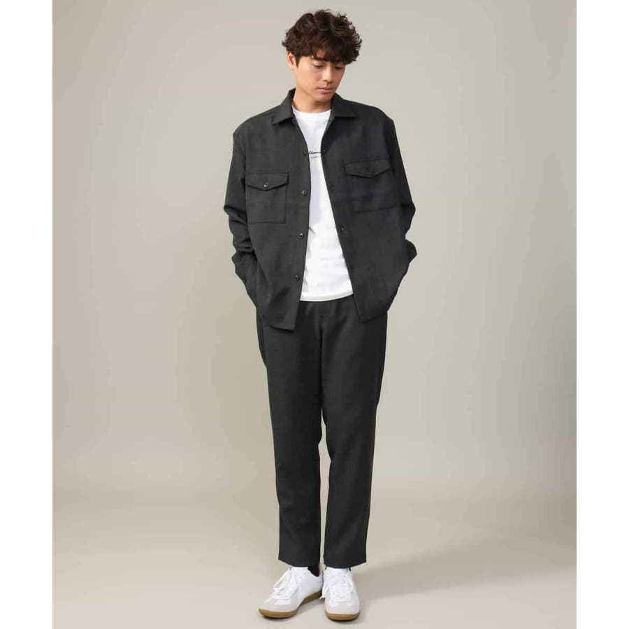 ボトムは同素材のセミルーズパンツ合わせで同色セットアップコーディネートがまとまりがありトレンド感が満載です。
