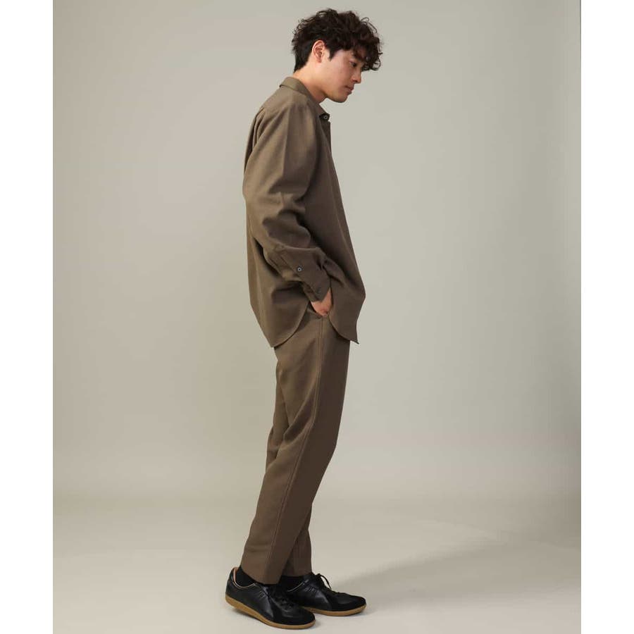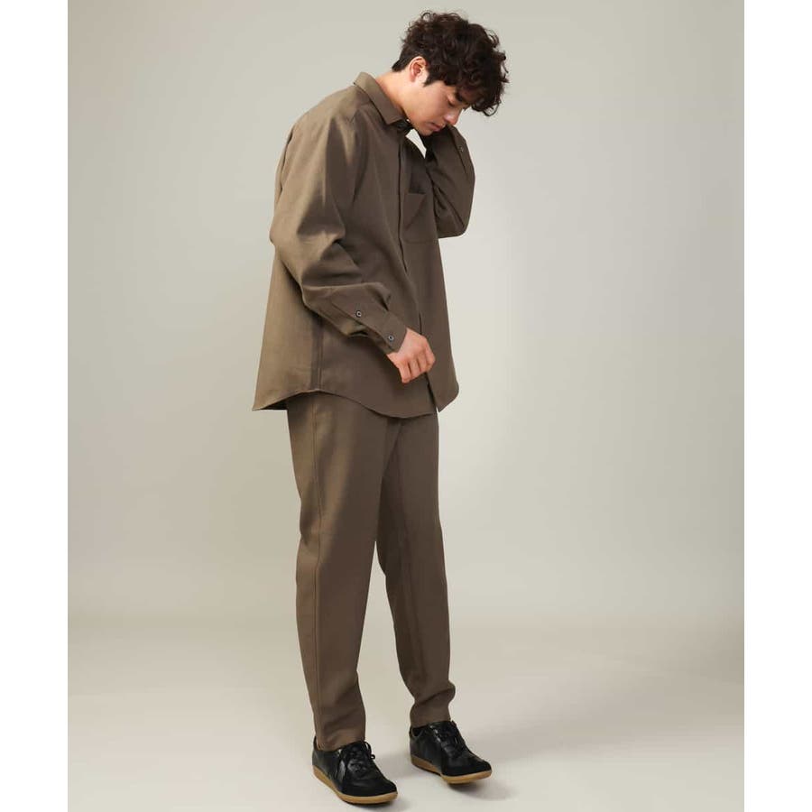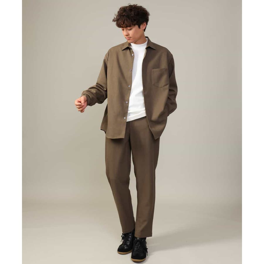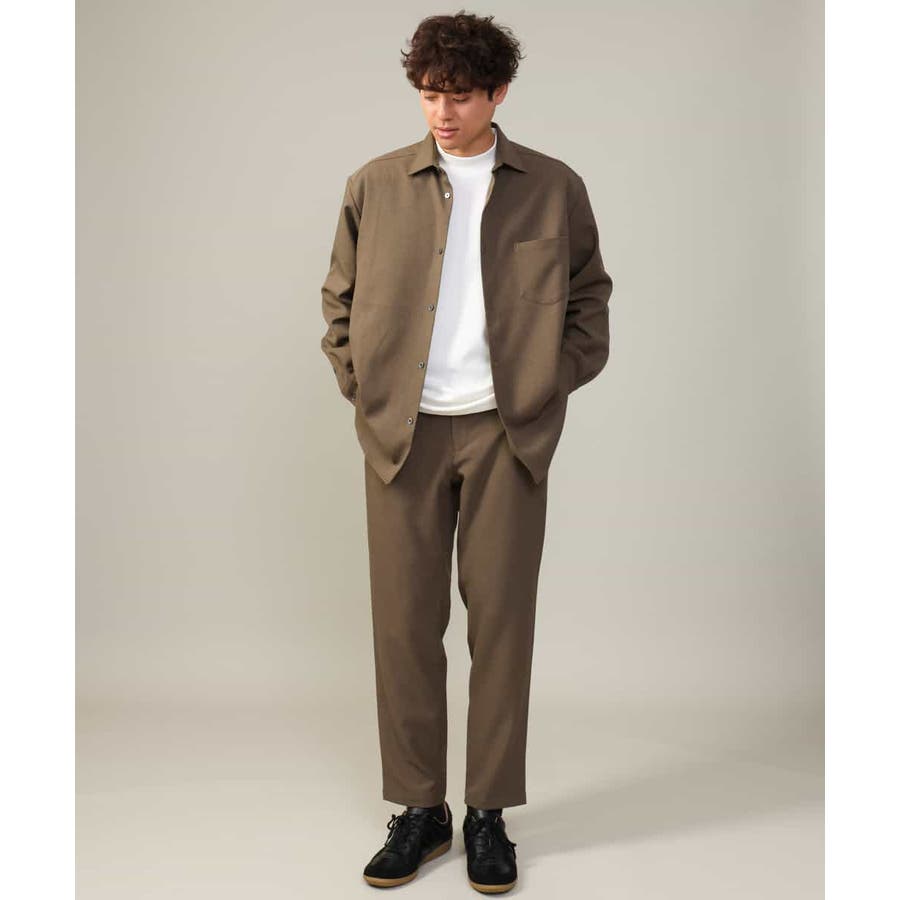 ボトムは同素材のセミルーズパンツ合わせで同色セットアップコーディネートがまとまりがありトレンド感が満載です。