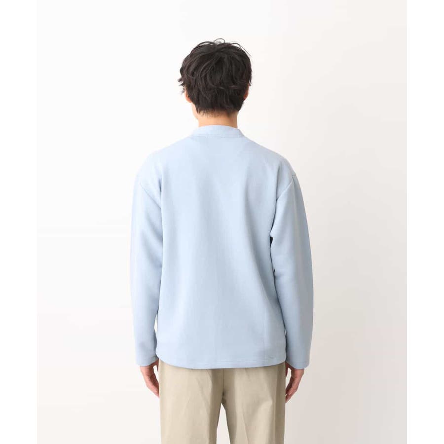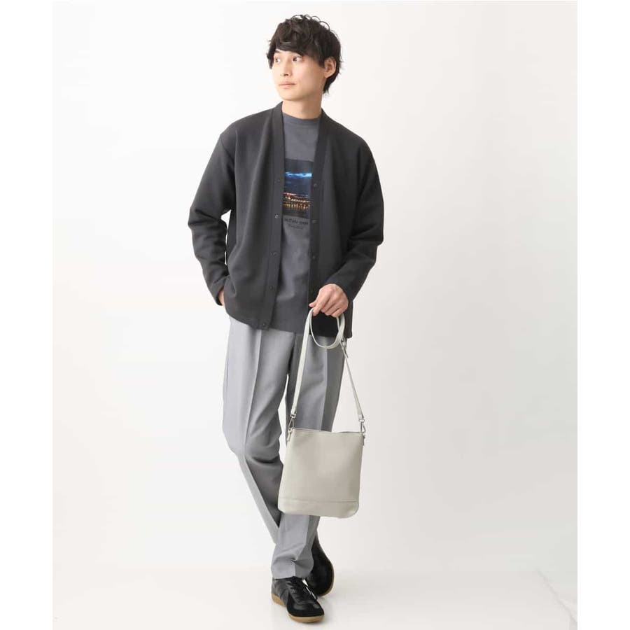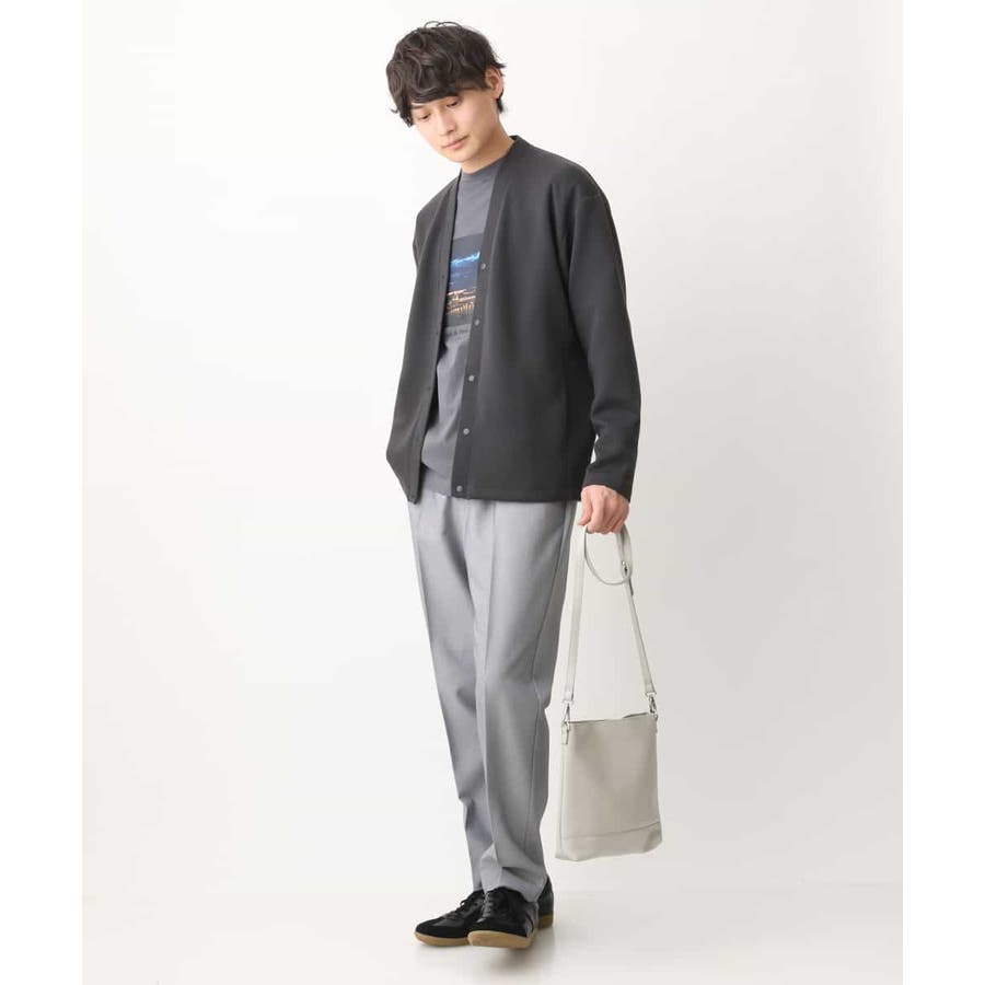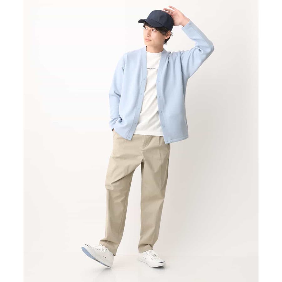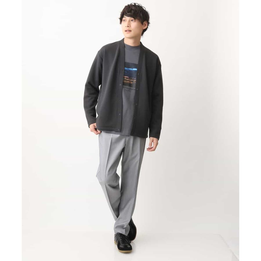 カーディガンの前ボタンをあけて、ロゴTやバンドカラーシャツとのレイヤードがオススメです。