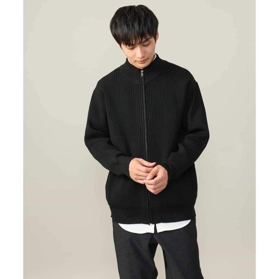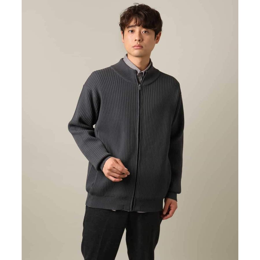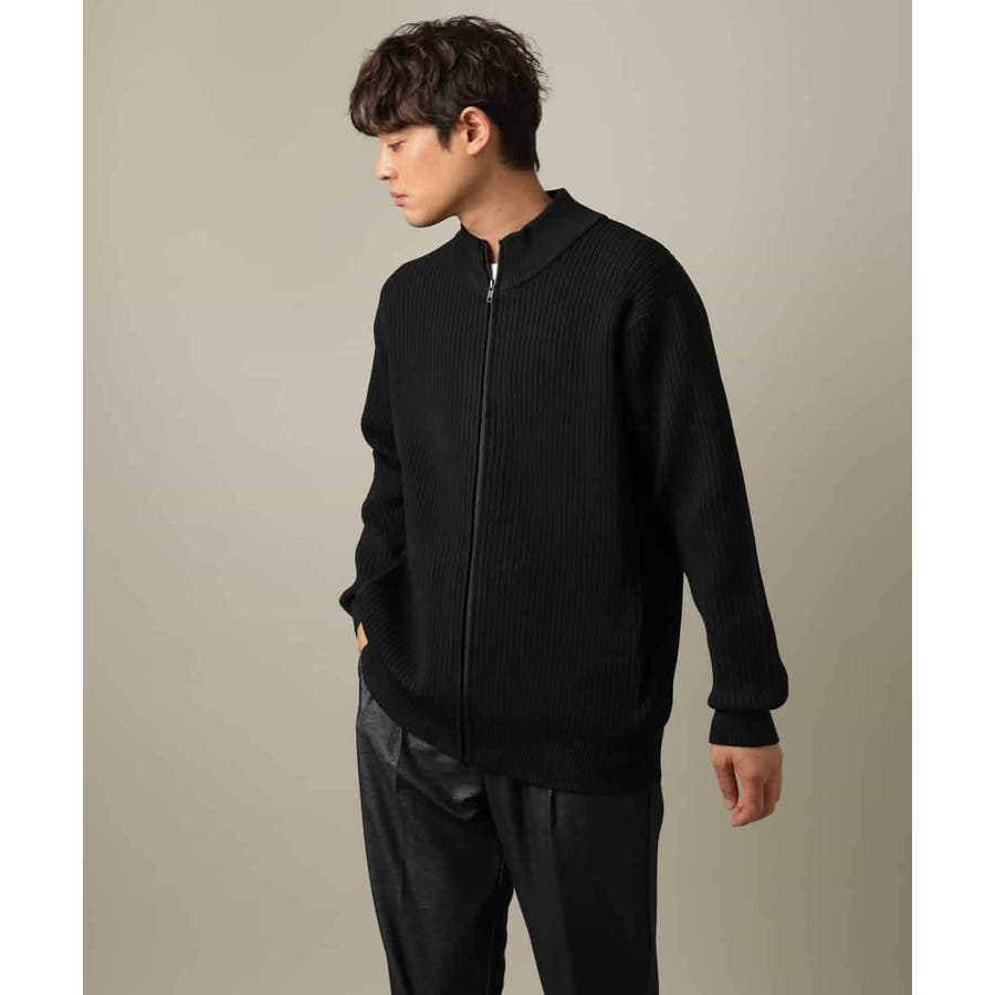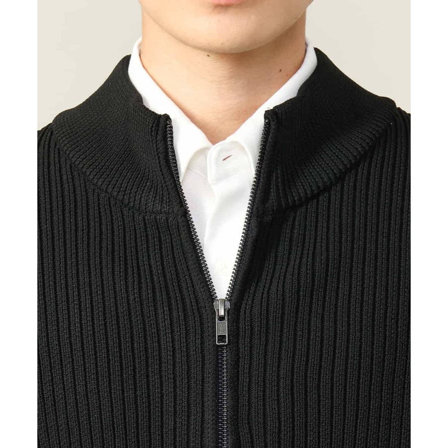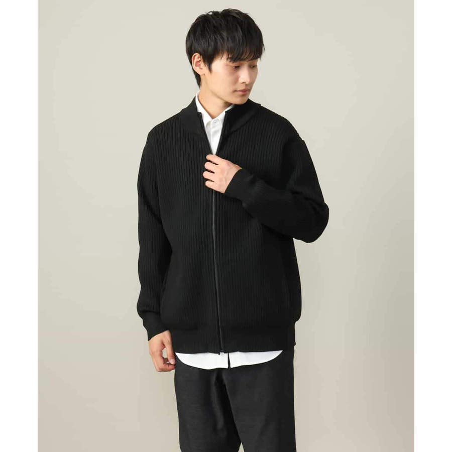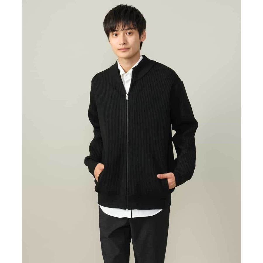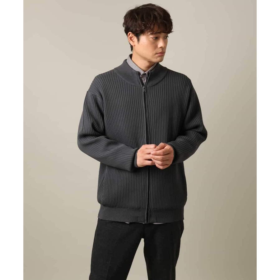 リブ編みで表面感を出してシンプルながら存在感のあるきれいめ見えするジップアップブルゾン型カーディガン。