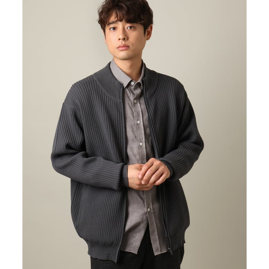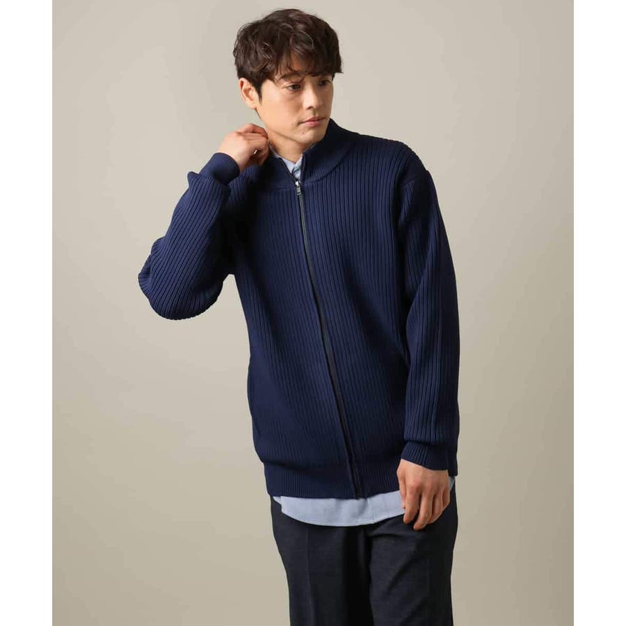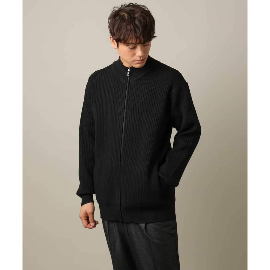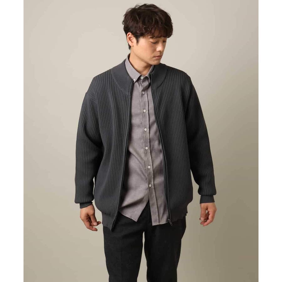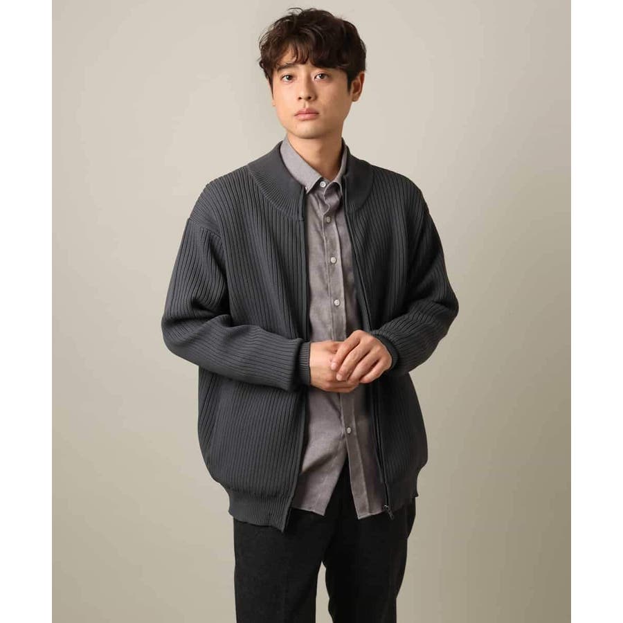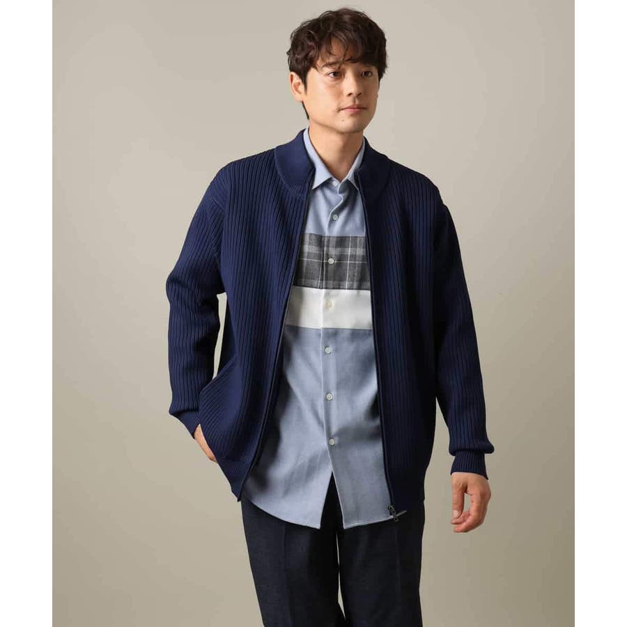 リブ編みで表面感を出してシンプルながら存在感のあるきれいめ見えするジップアップブルゾン型カーディガン。