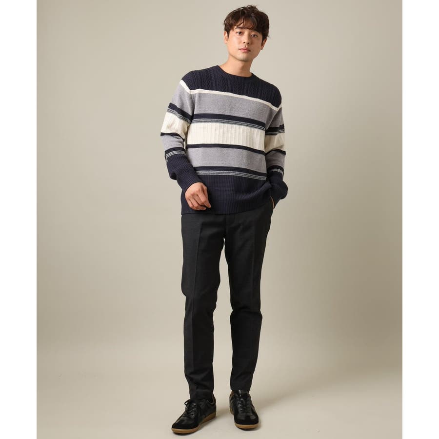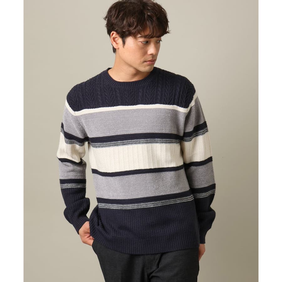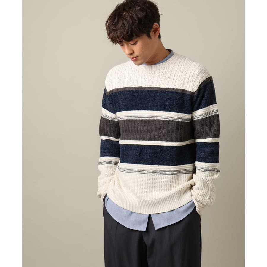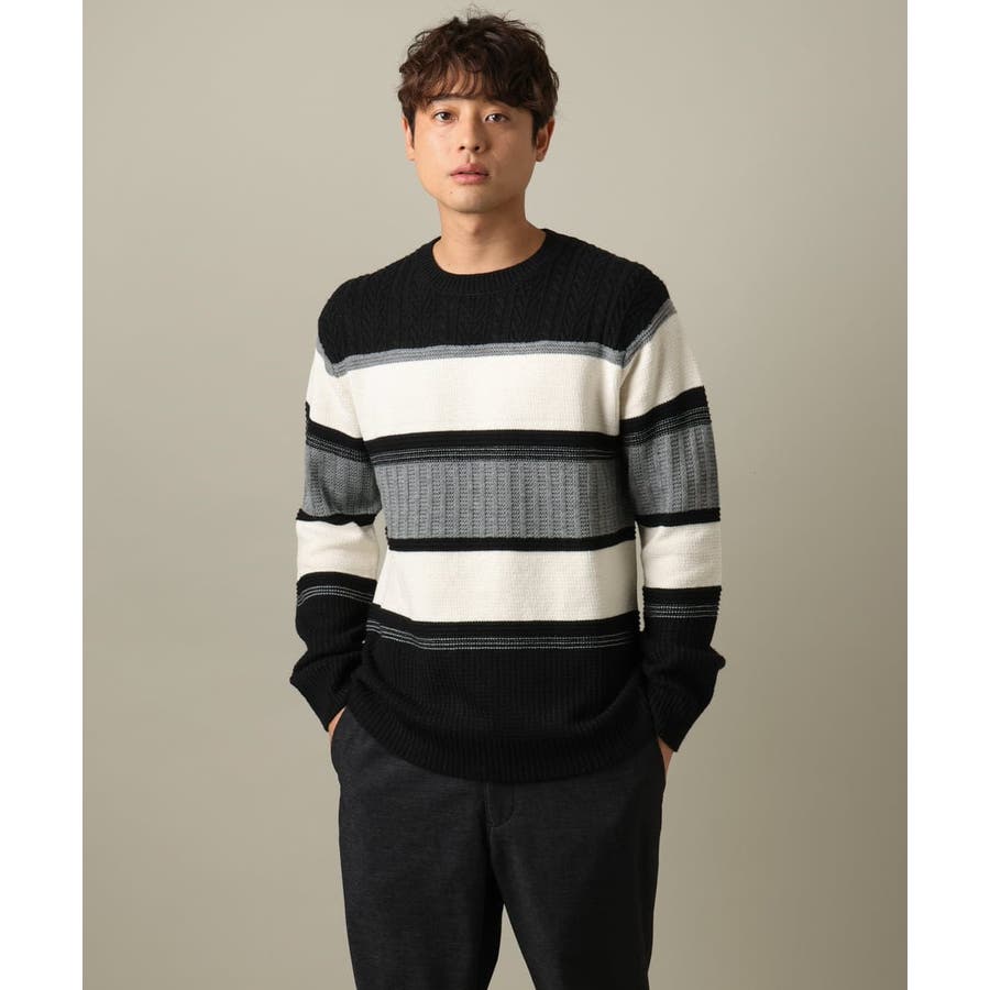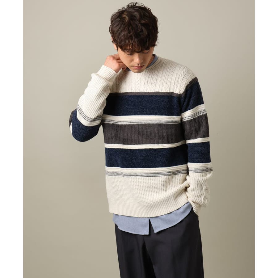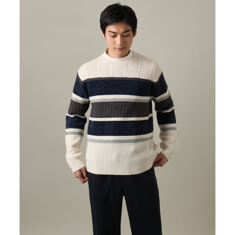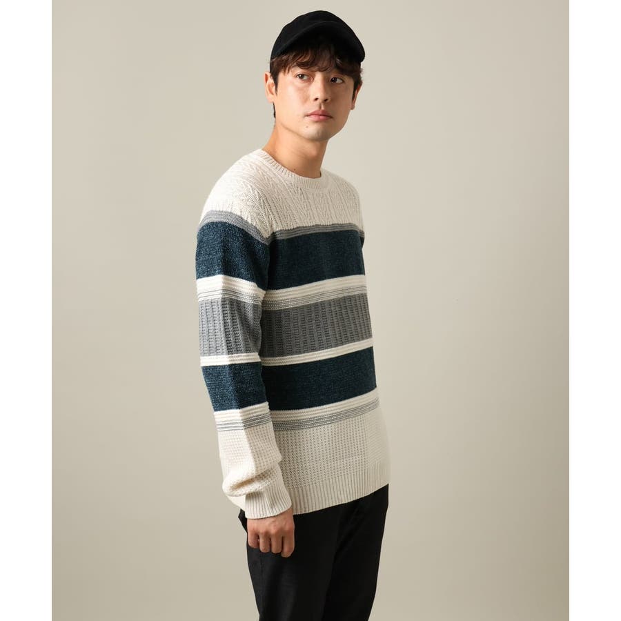 編地の違うニットをボーダーに組み合わせたこだわりの柄感がポイントで、1枚でサマになる着映えニットです。