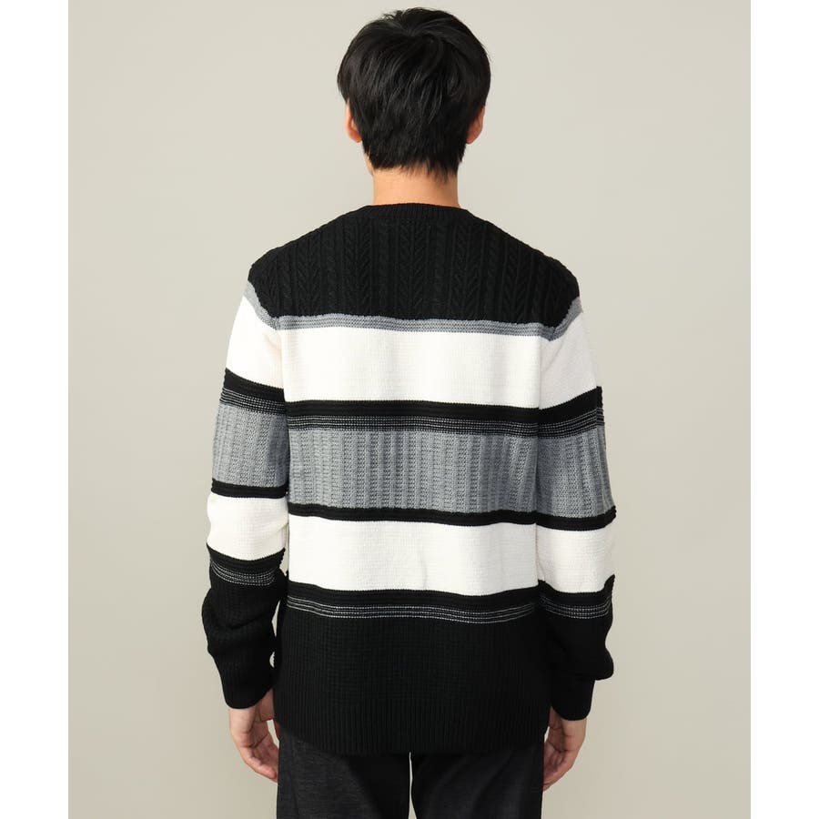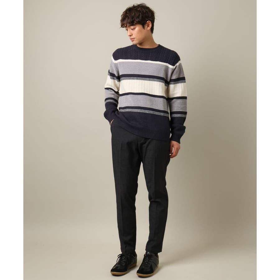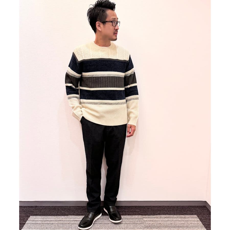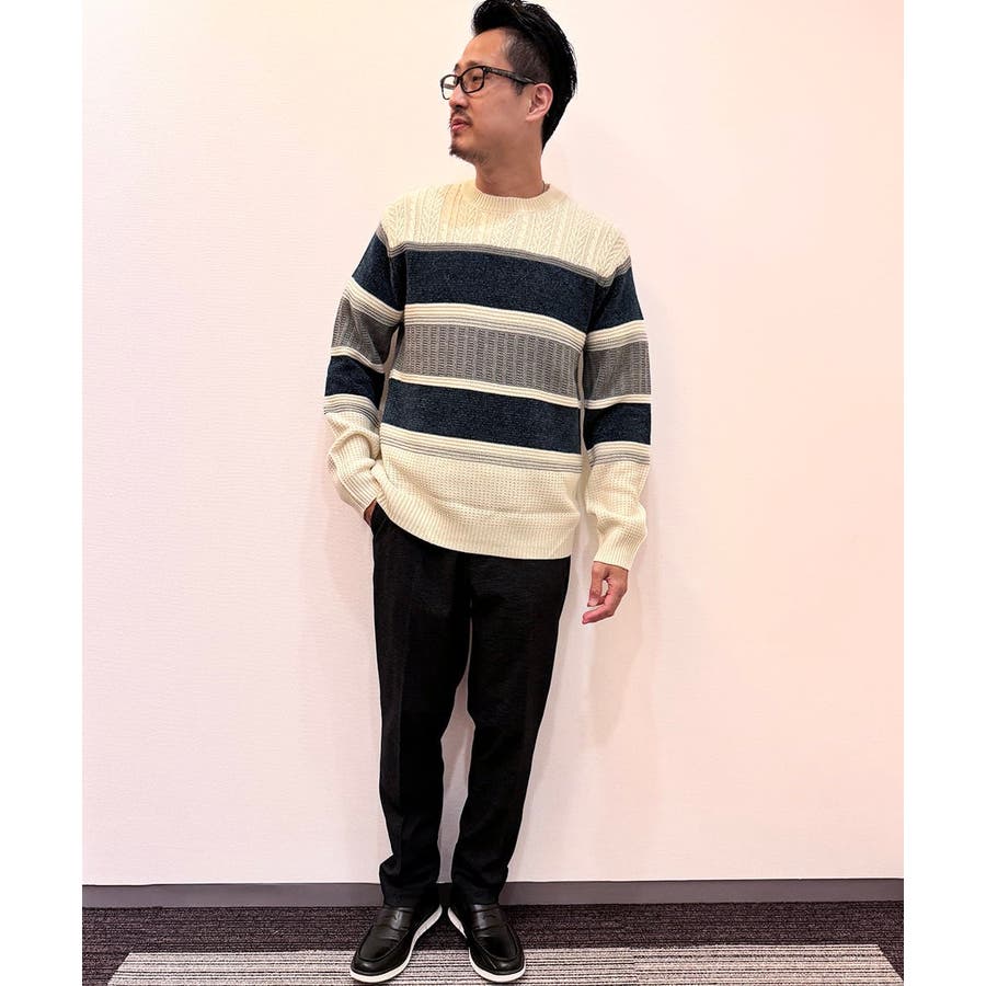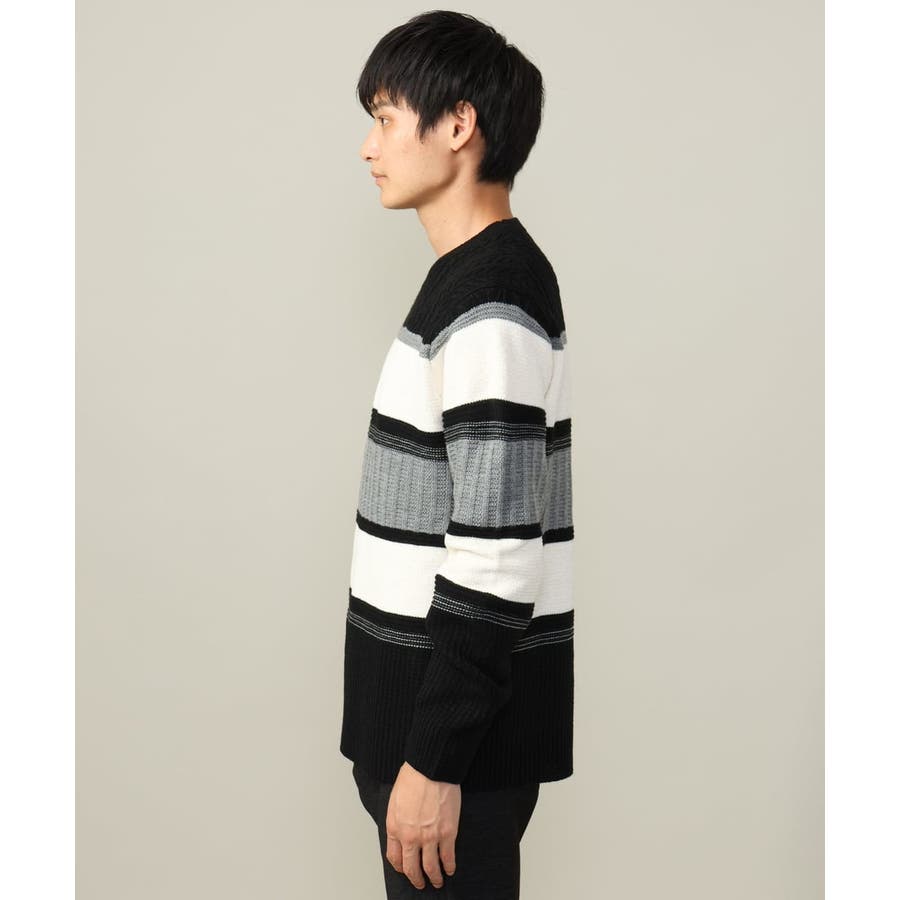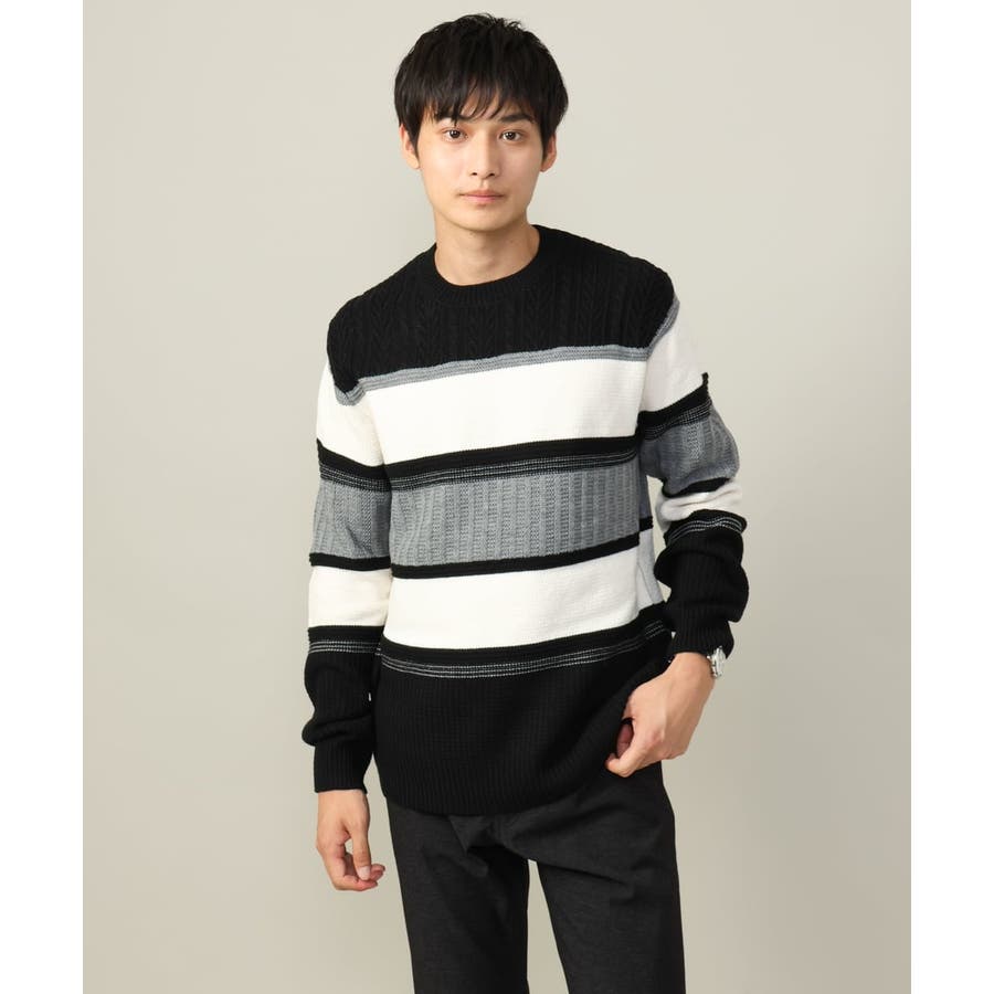 編地の違うニットをボーダーに組み合わせたこだわりの柄感がポイントで、1枚でサマになる着映えニットです。