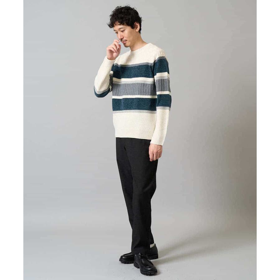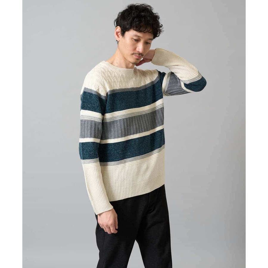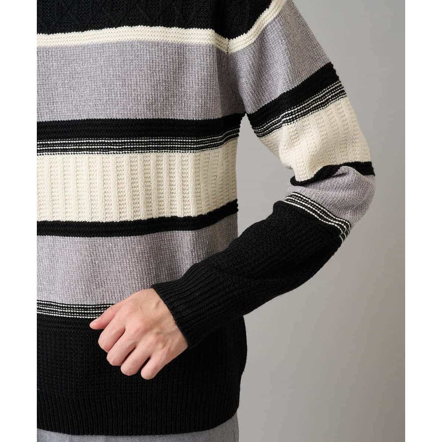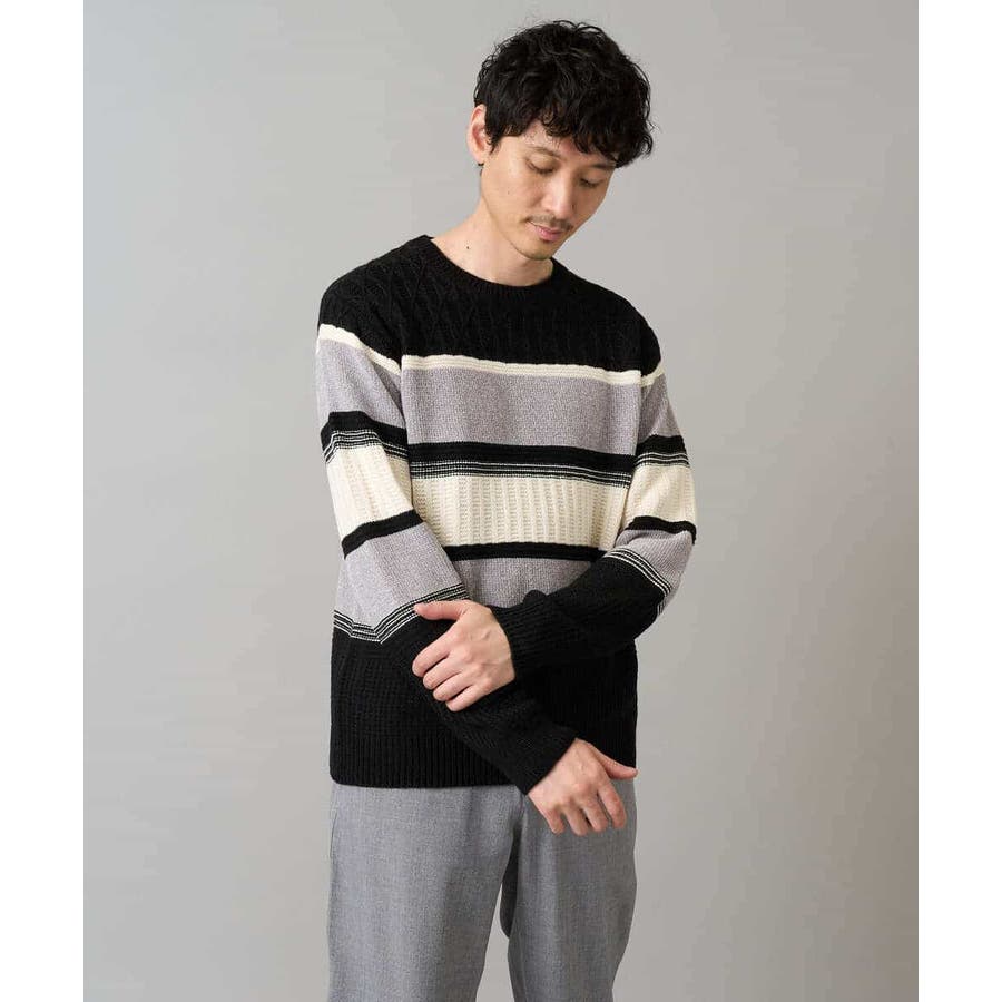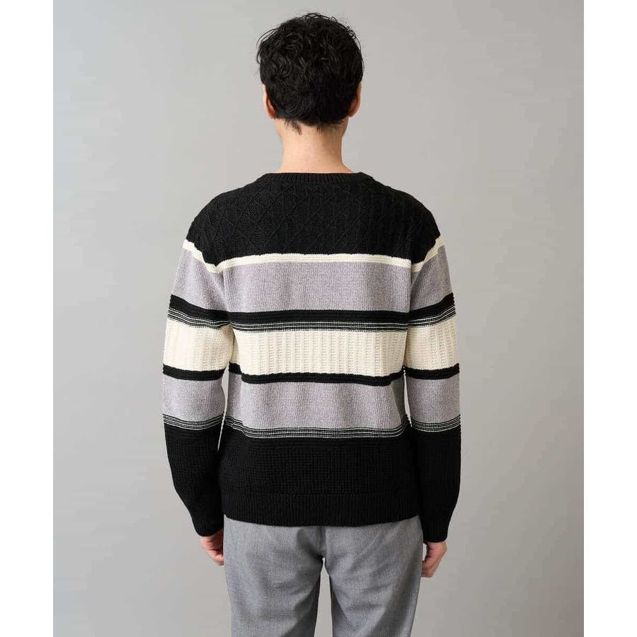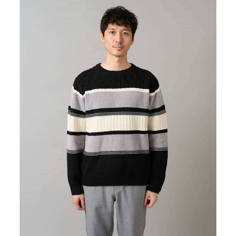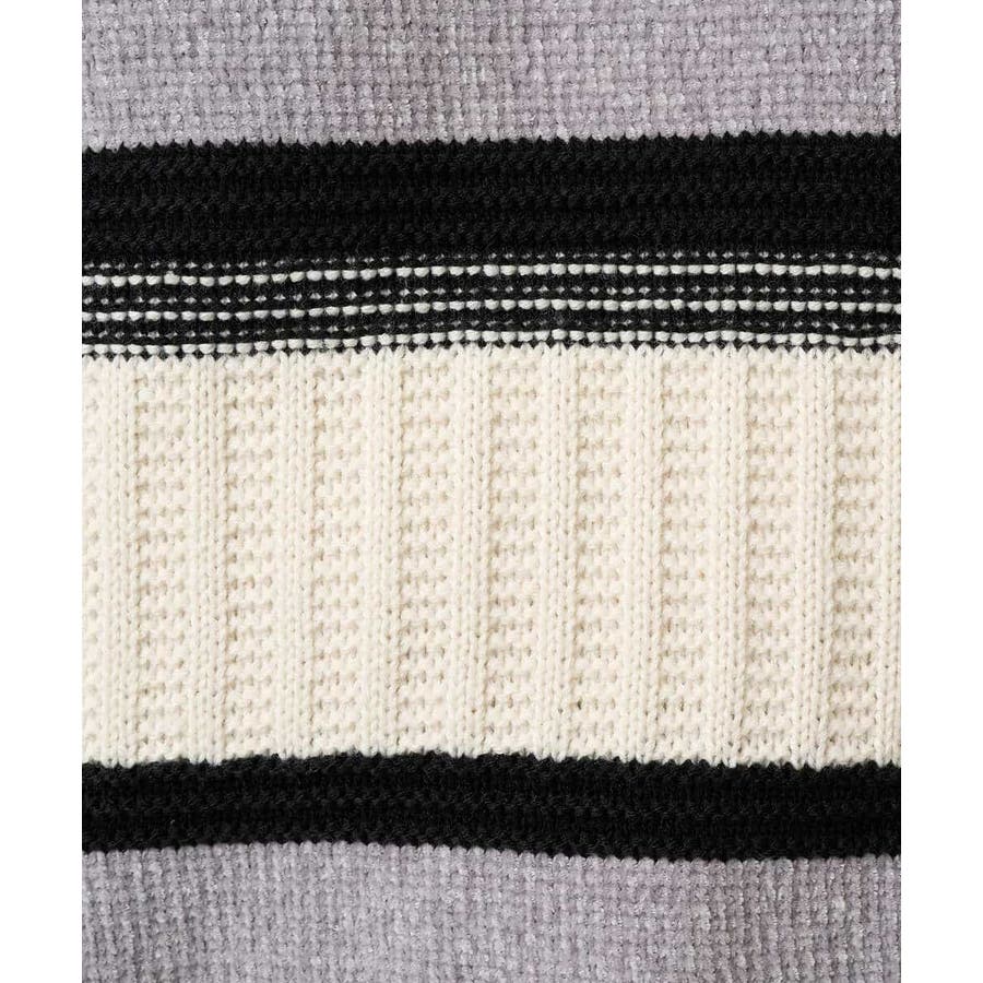 編地の違うニットをボーダー状に組み合わせた、こだわりのオリジナリティのある柄感がポイント。