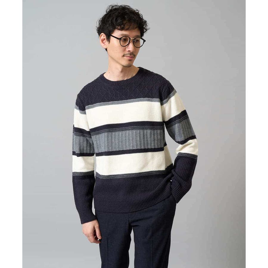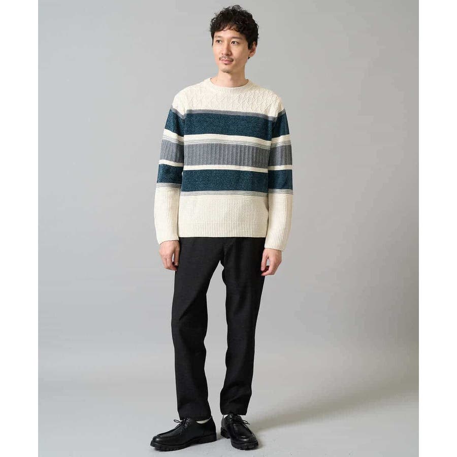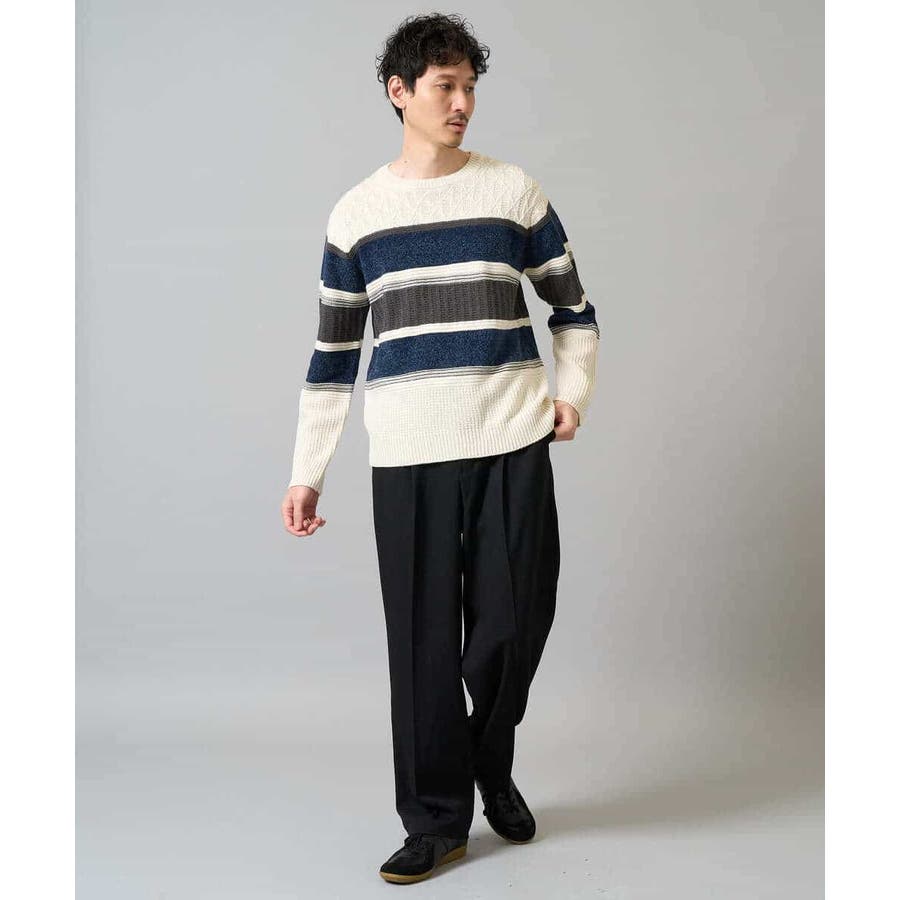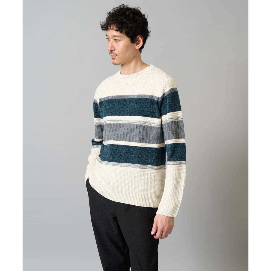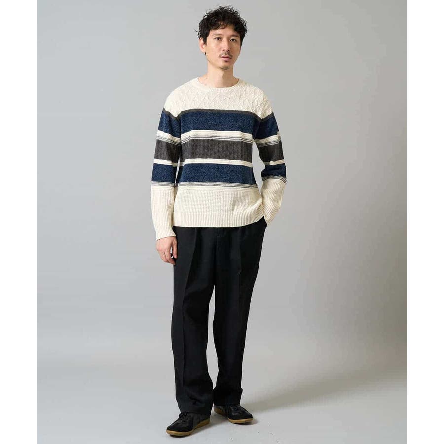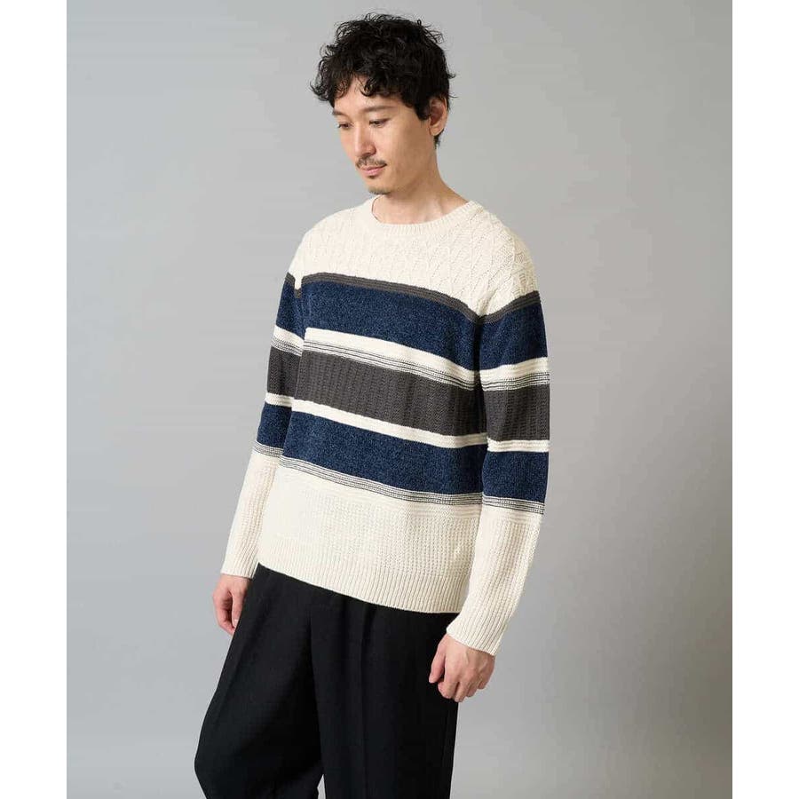 編地の違うニットをボーダー状に組み合わせた、こだわりのオリジナリティのある柄感がポイント。