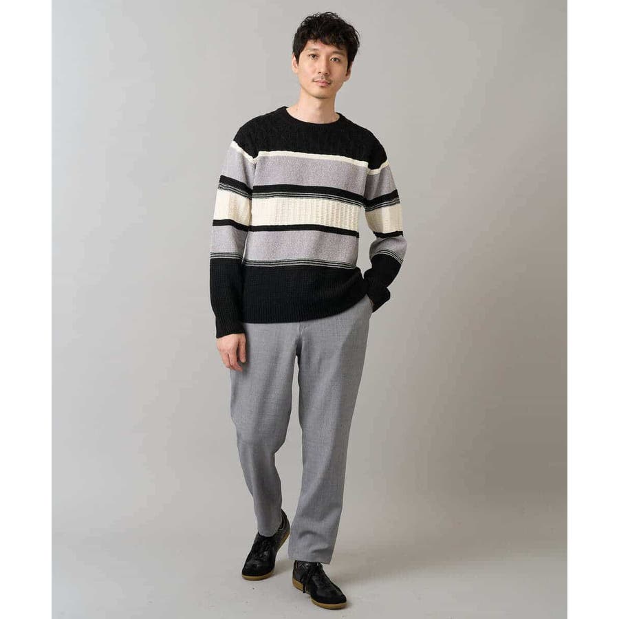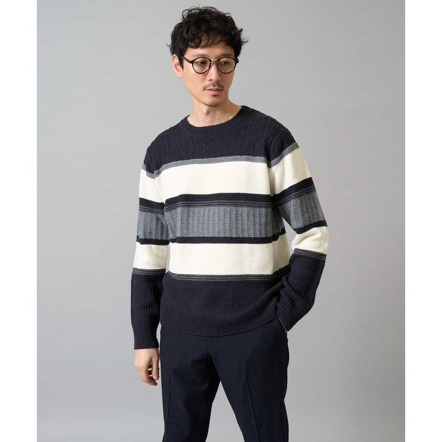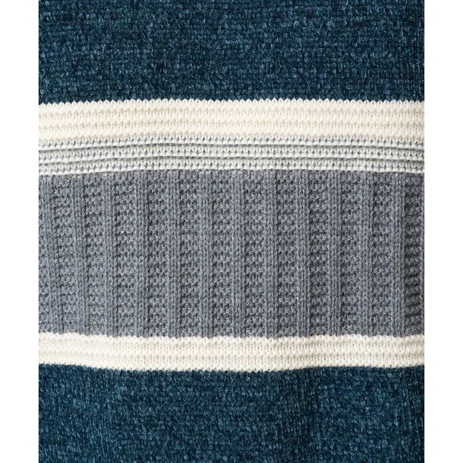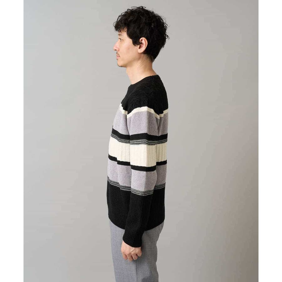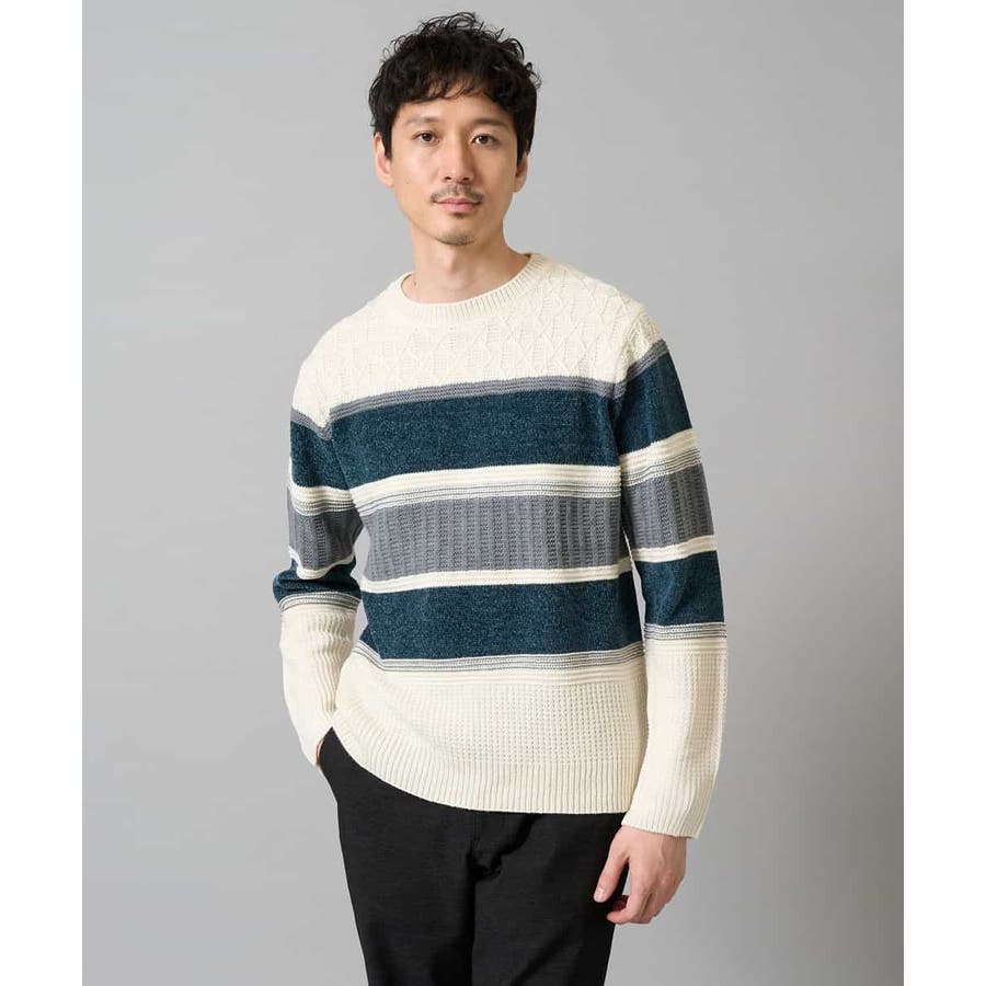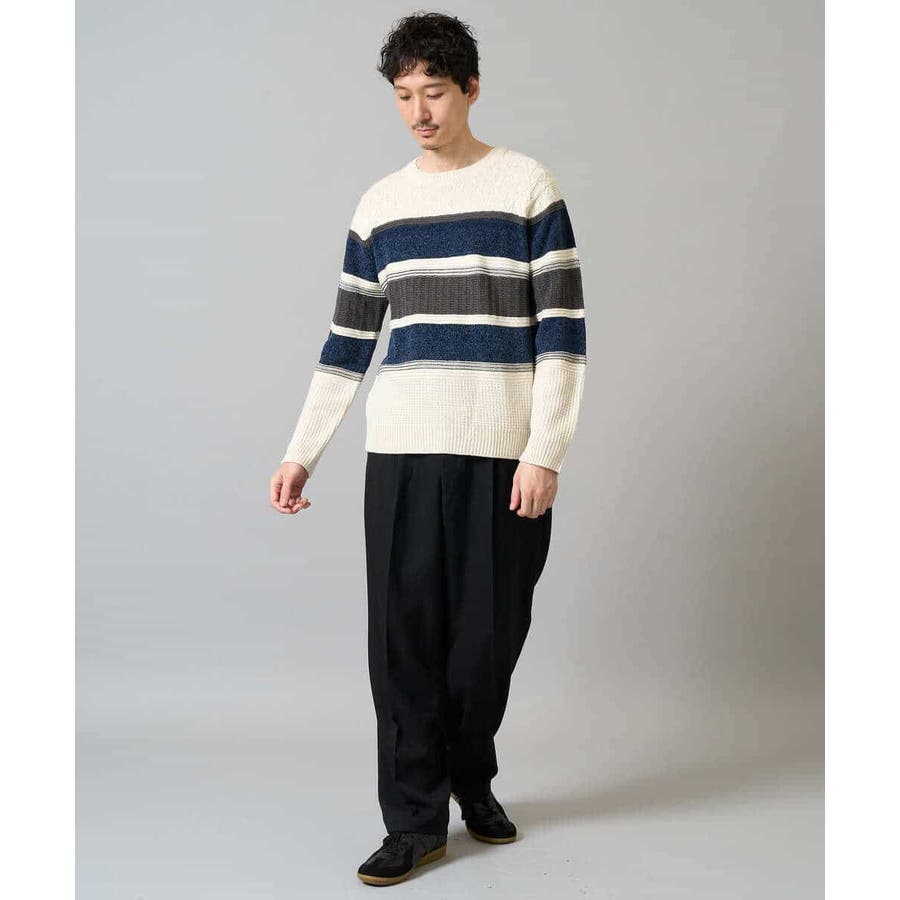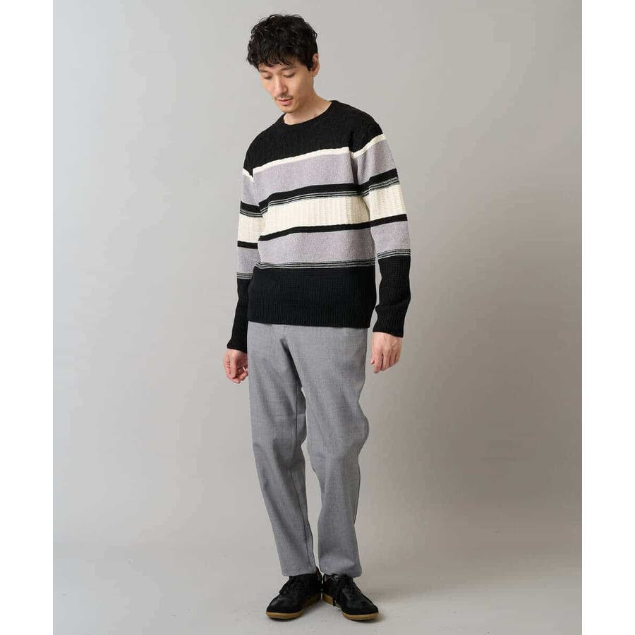 編地の違うニットをボーダー状に組み合わせた、こだわりのオリジナリティのある柄感がポイント。
