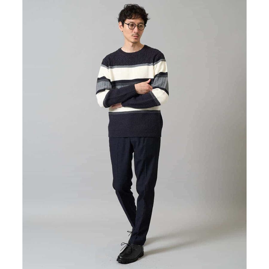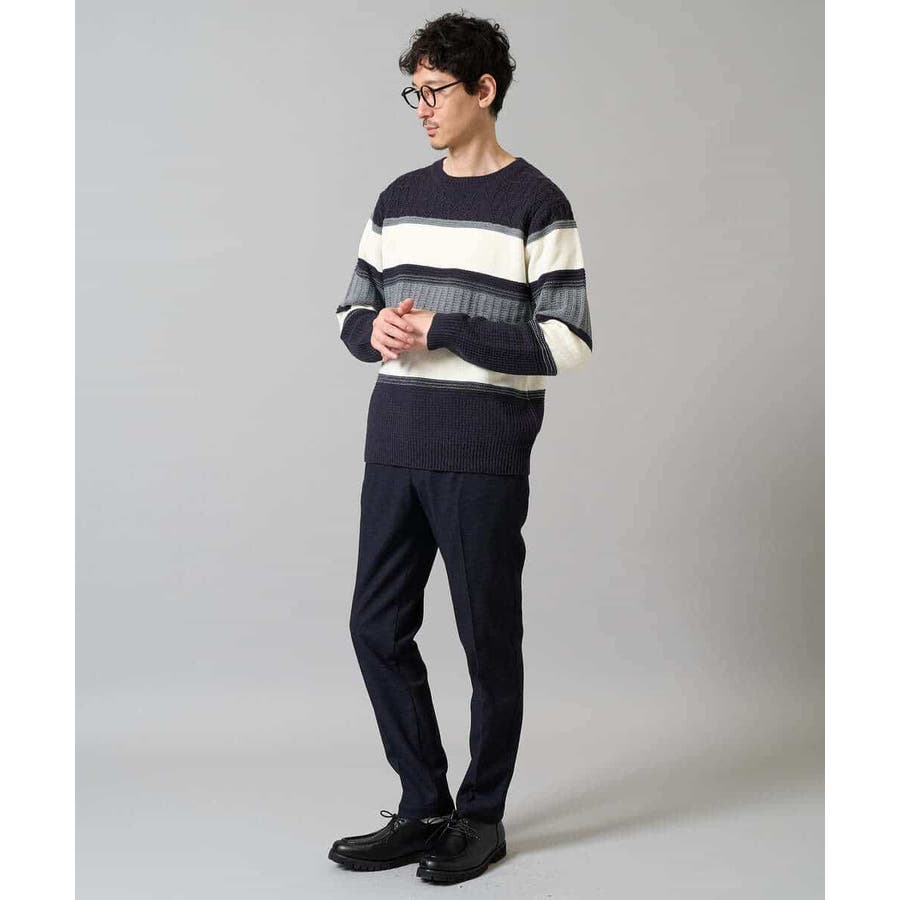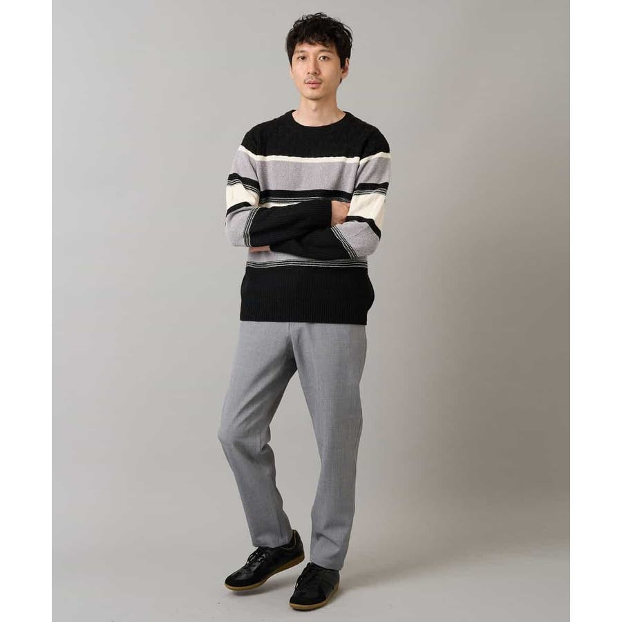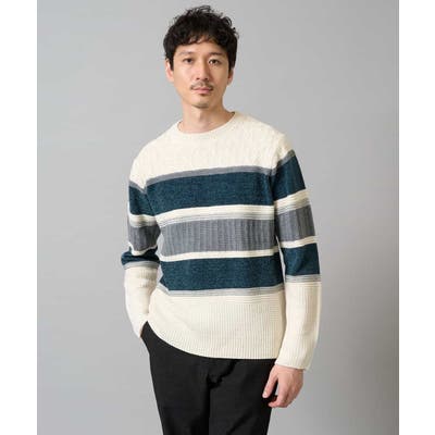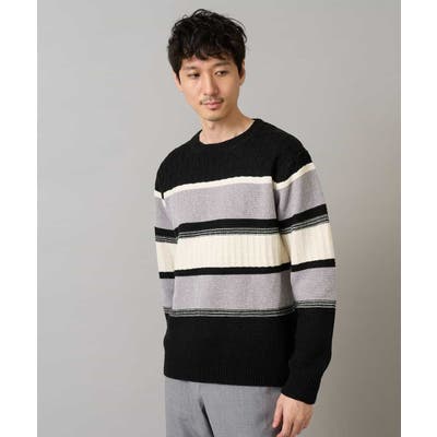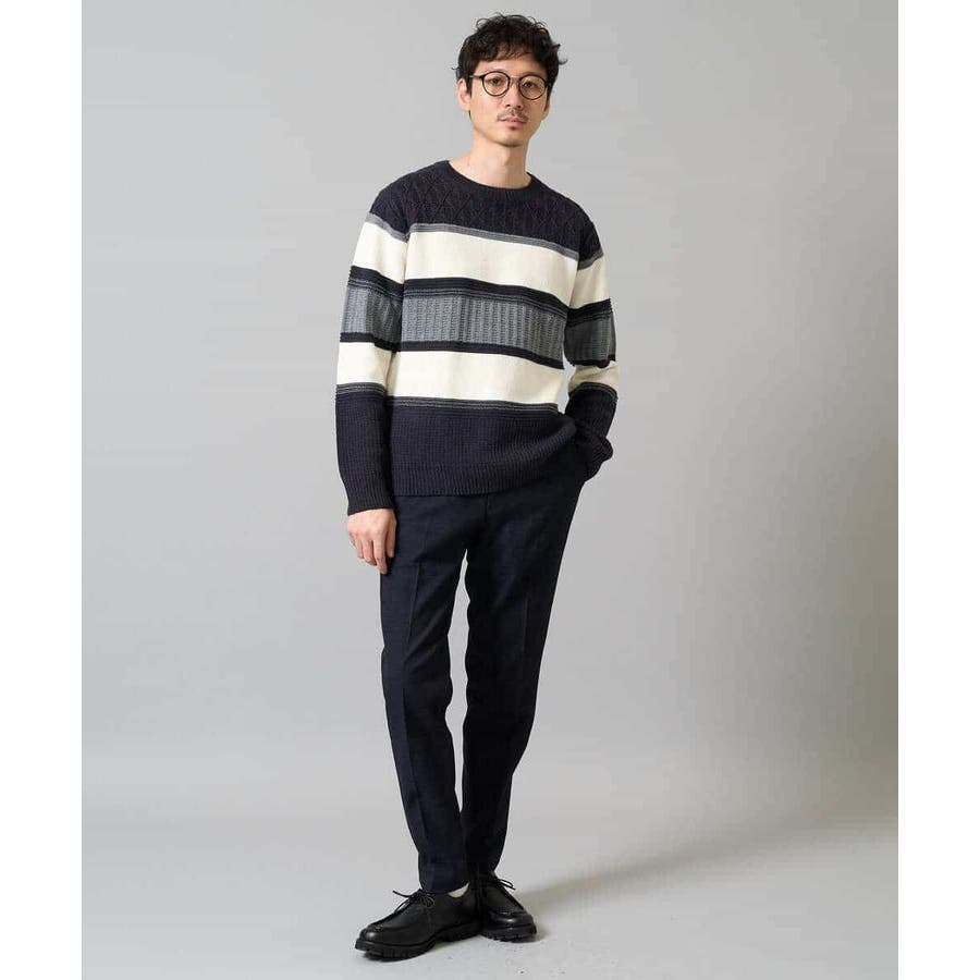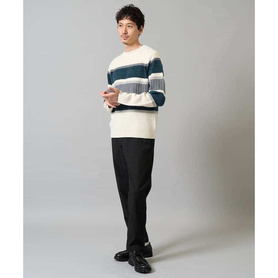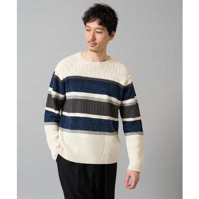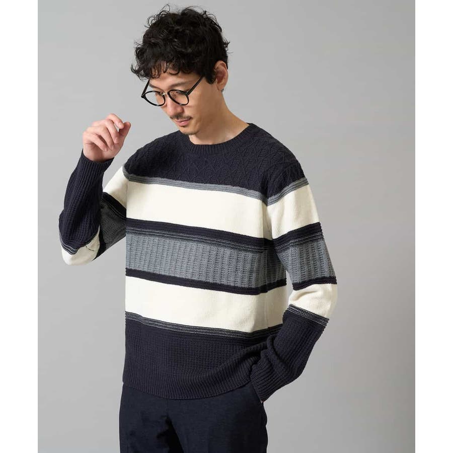 編地の違うニットをボーダー状に組み合わせた、こだわりのオリジナリティのある柄感がポイント。