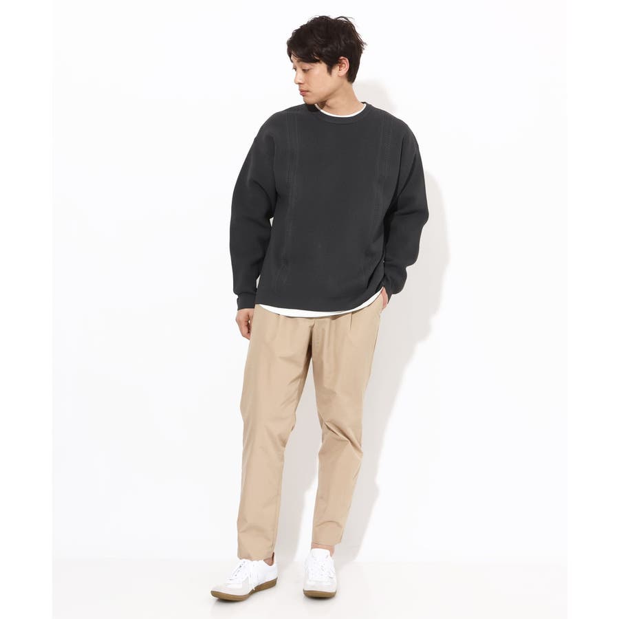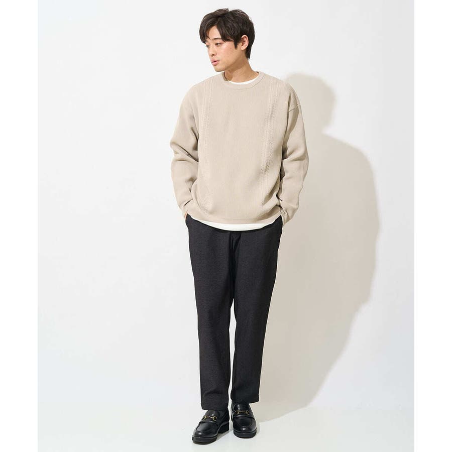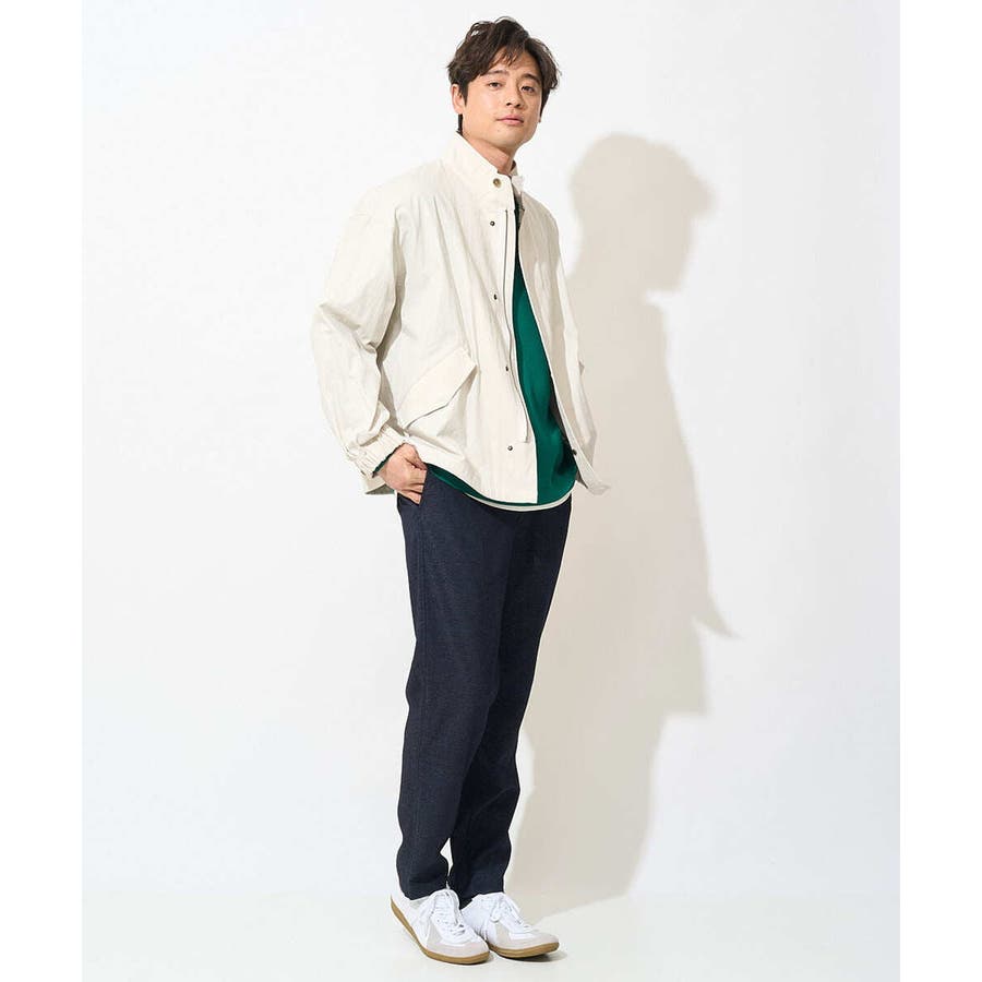 シルエットにゆとりがあるため、ボトムはきれい目スタイルであればスッキリきれいめに見えるスラックス合わせ、カジュアルスタイルであればタック入りなどのトレンド性のあるゆとりのあるパンツとあわせるとボリュームのあるバランスでコーディネートができます。