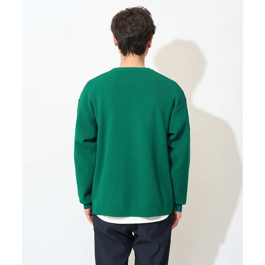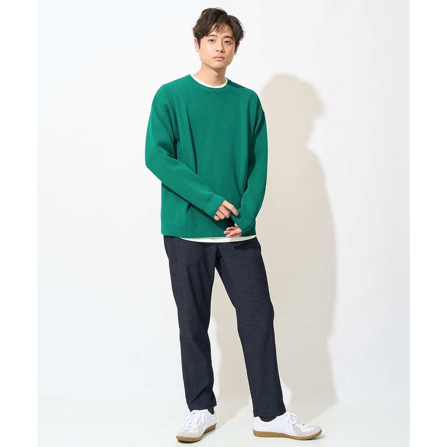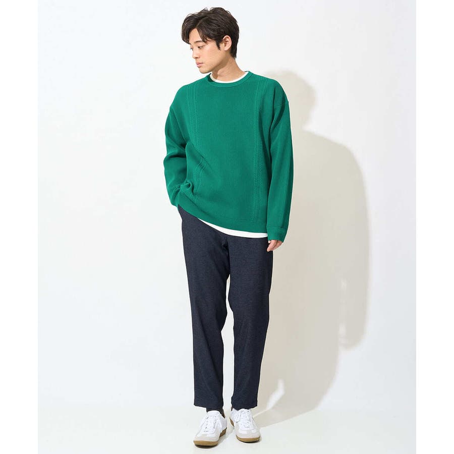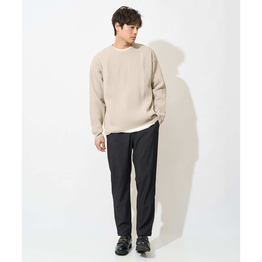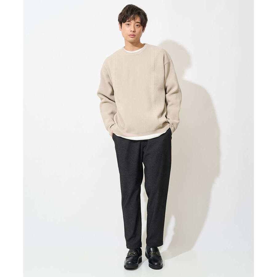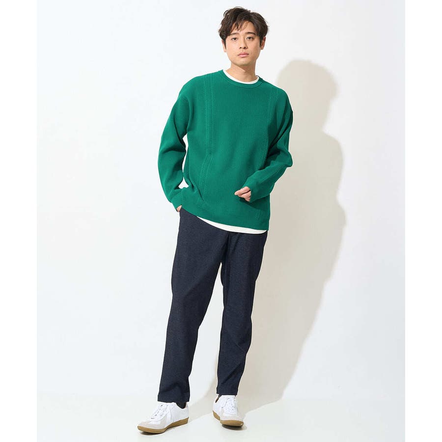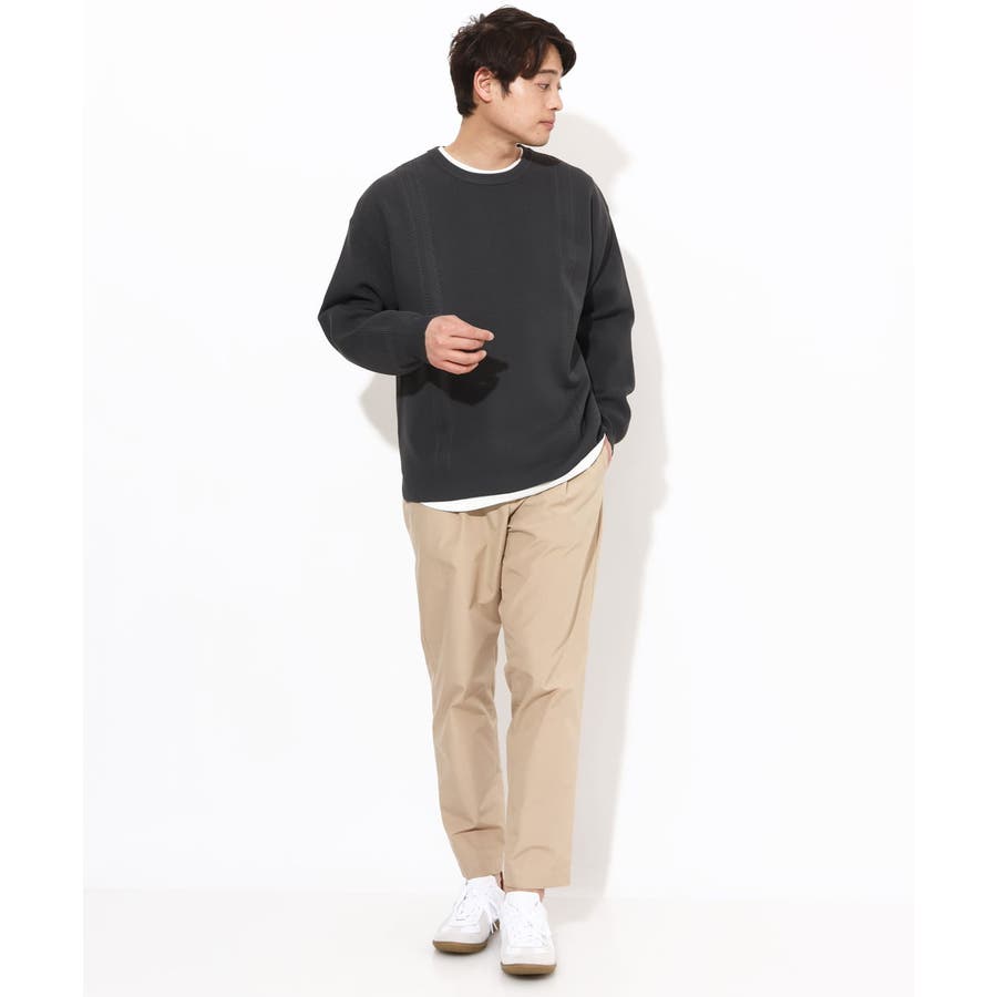 着回しやすいクルーネックデザインのため様々なアウターに合わせられ、インナーをモックネックカットソーやシャツに変えたレイヤードスタイルもオススメです。