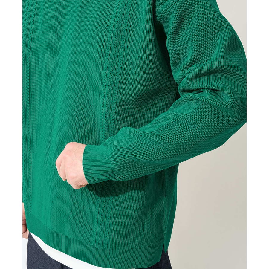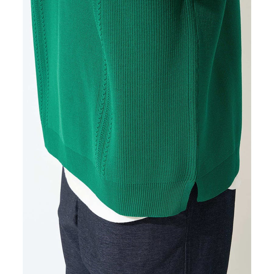 前身頃に1ポイントでケーブル編を施し、さりげない透け感をアクセントにしています。