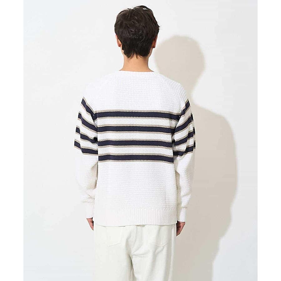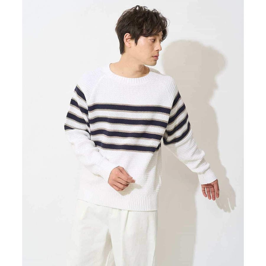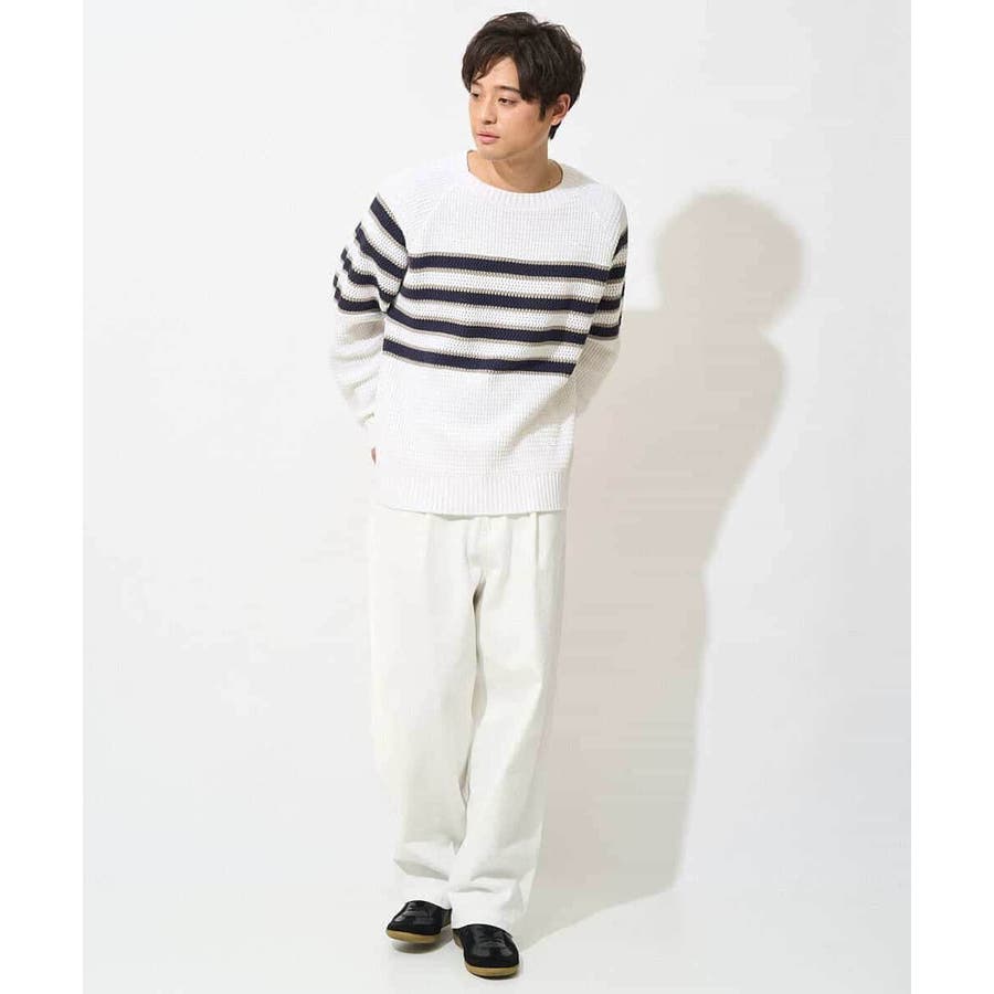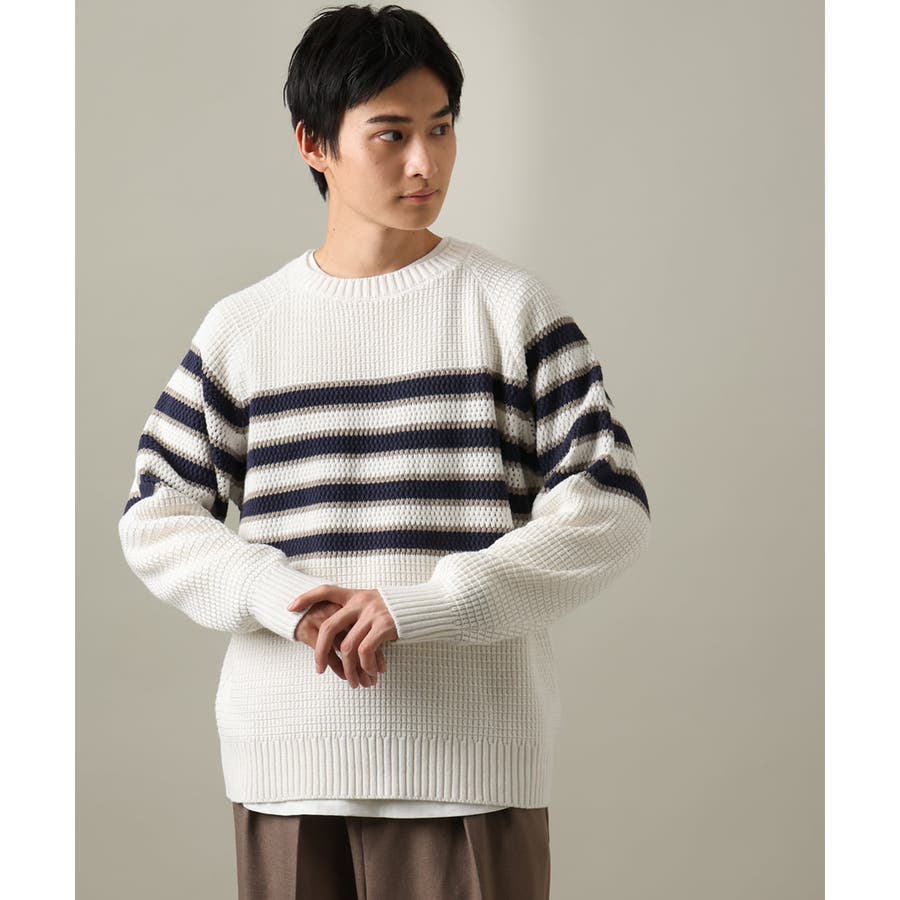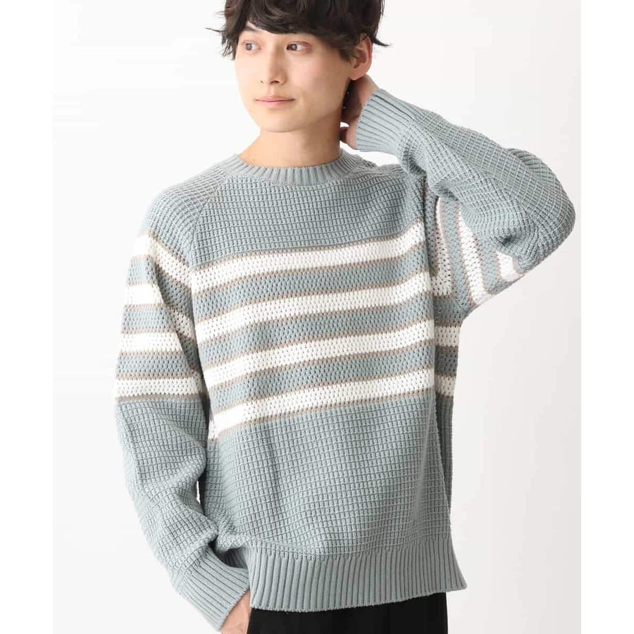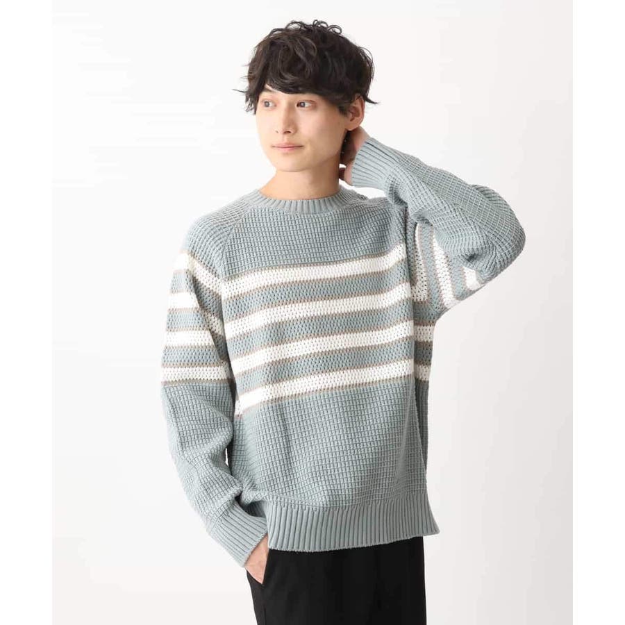 春に最適なコットンアクリル糸を使用し、程よく肉感のあるタック編みでボーダーを表現しました。オフ×ネイビーとくすみミント×オフの2色展開。ご自宅で気軽に洗濯機洗いができるためデイリーユースに着用できるのも嬉しいポイントです。