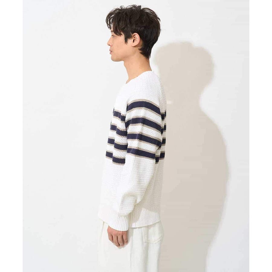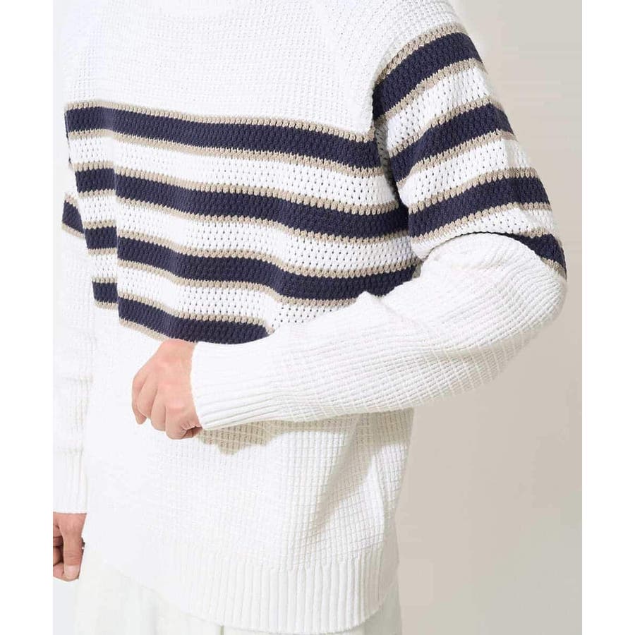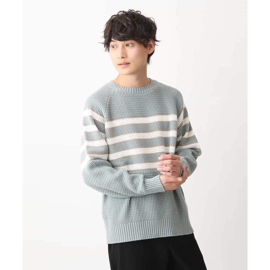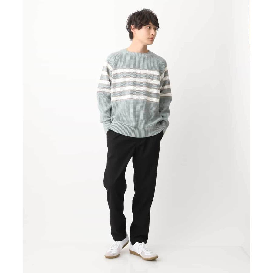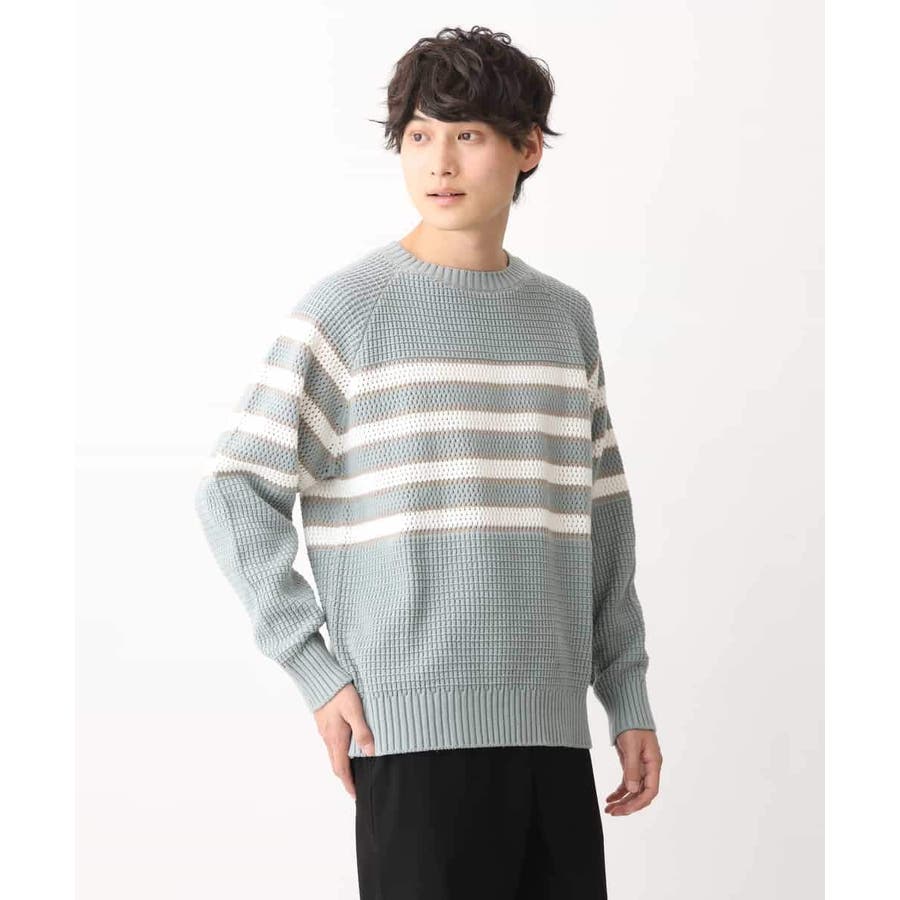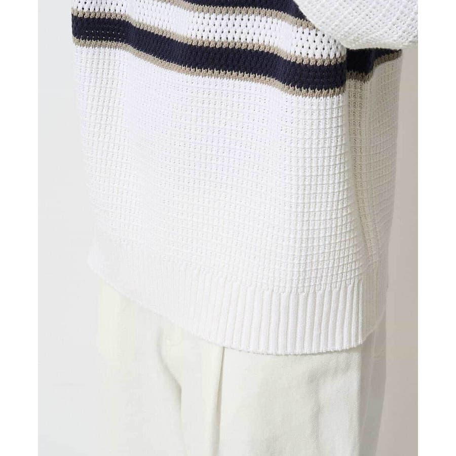 春に最適なコットンアクリル糸を使用し、程よく肉感のあるタック編みでボーダーを表現しました。オフ×ネイビーとくすみミント×オフの2色展開。ご自宅で気軽に洗濯機洗いができるためデイリーユースに着用できるのも嬉しいポイントです。