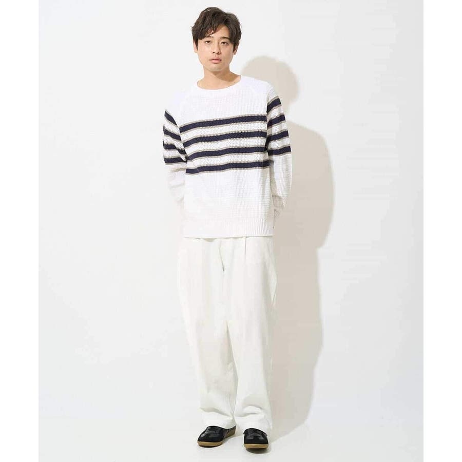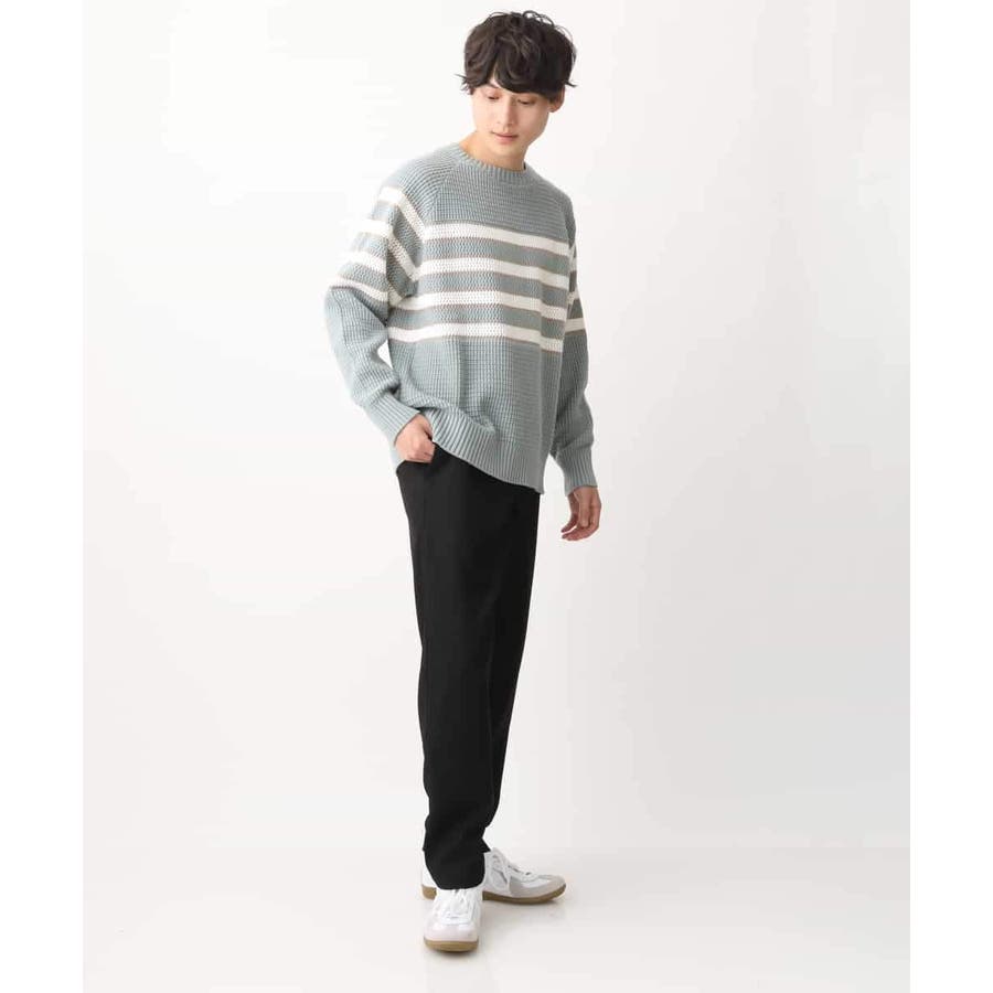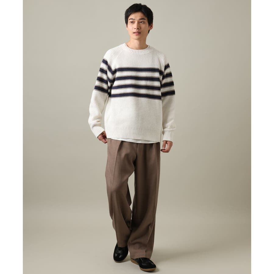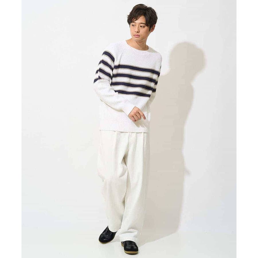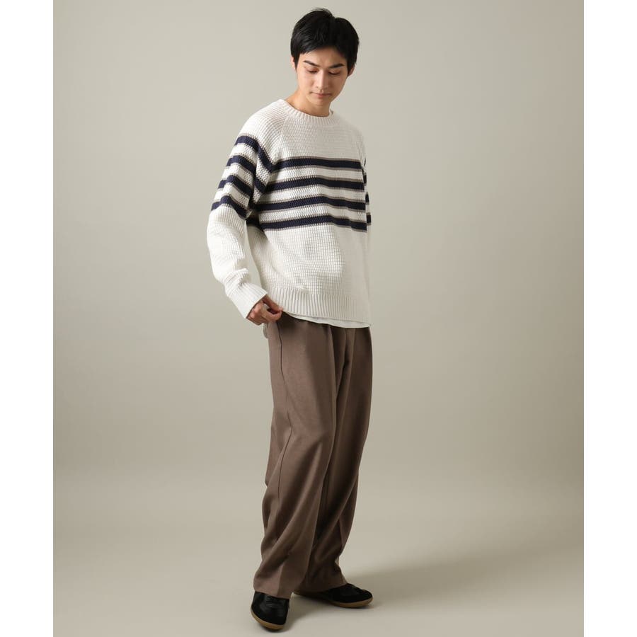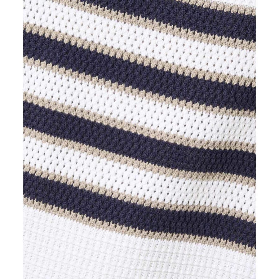 春に最適なコットンアクリル糸を使用し、程よく肉感のあるタック編みでボーダーを表現しました。オフ×ネイビーとくすみミント×オフの2色展開。ご自宅で気軽に洗濯機洗いができるためデイリーユースに着用できるのも嬉しいポイントです。