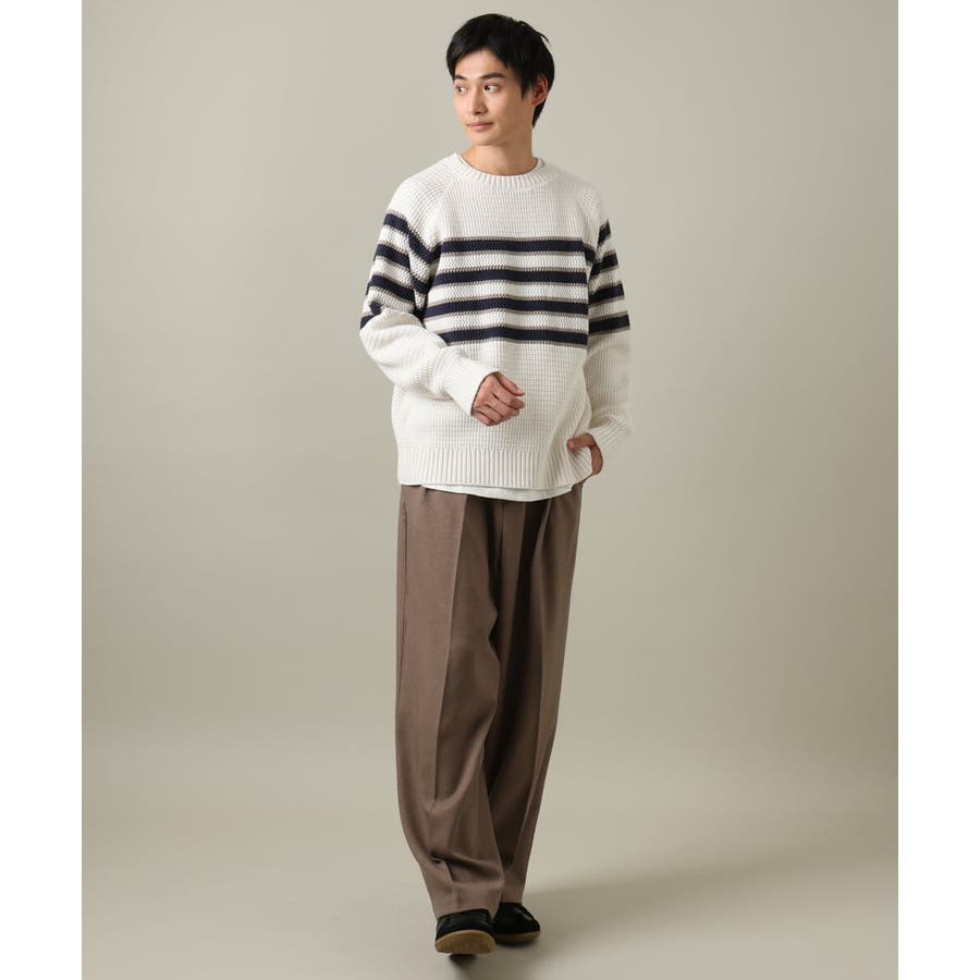 ボトムはきれい目スタイルであればスラックス合わせ、カジュアルスタイルであればタック入りなどのゆとりのあるパンツとあわせるとバランスが良いコーディネートが完成します。ブルゾンやコート合わせなど汎用性が高く、程よいアクセントになります。