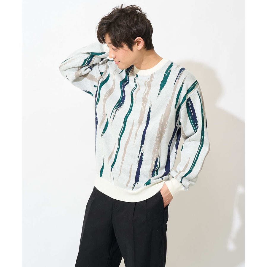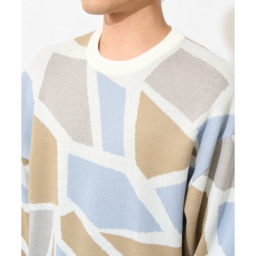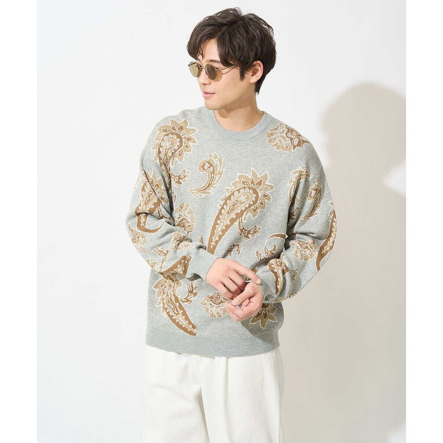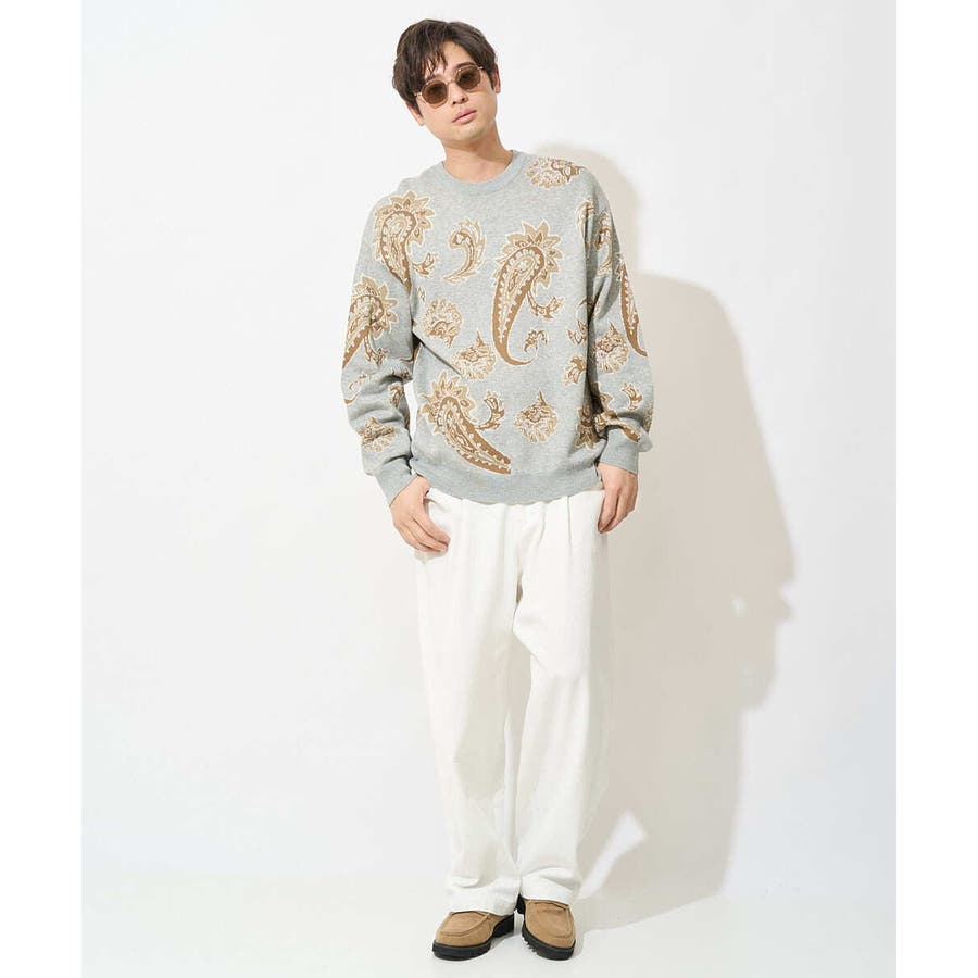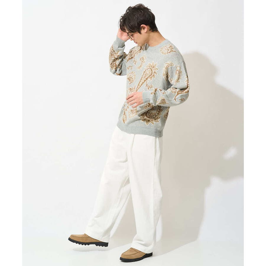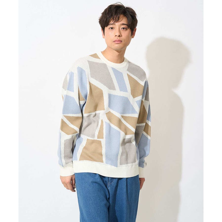 インパクトのある総柄を大胆にニットで表現したジャカードクルーニット。シルエットはゆとりのあるワイドシルエットでこなれ感を演出できます。