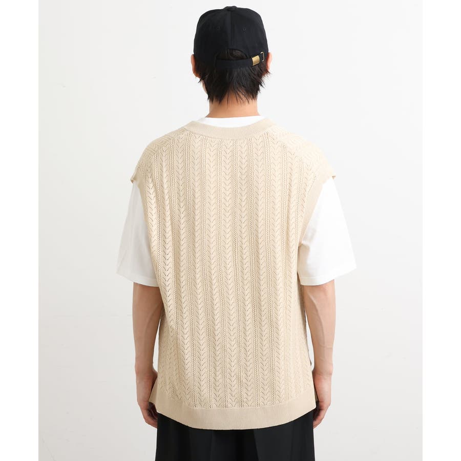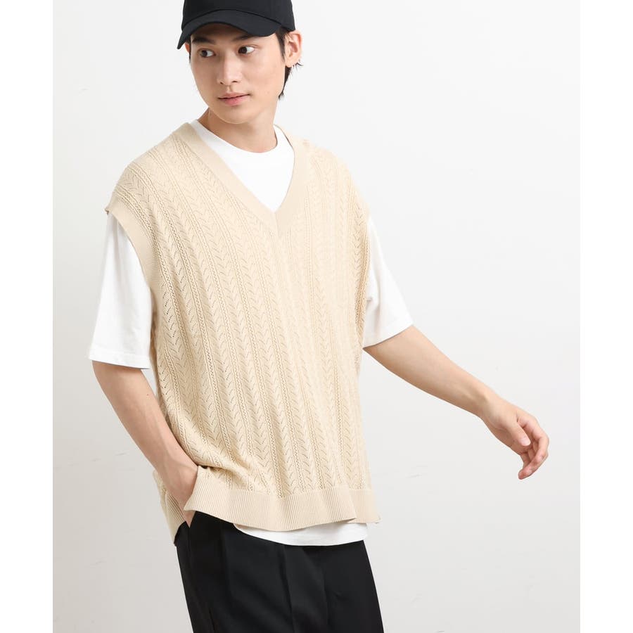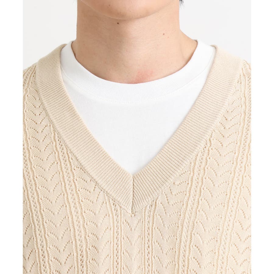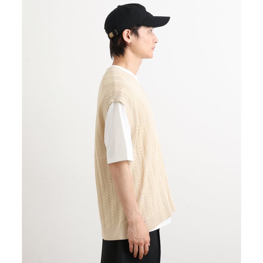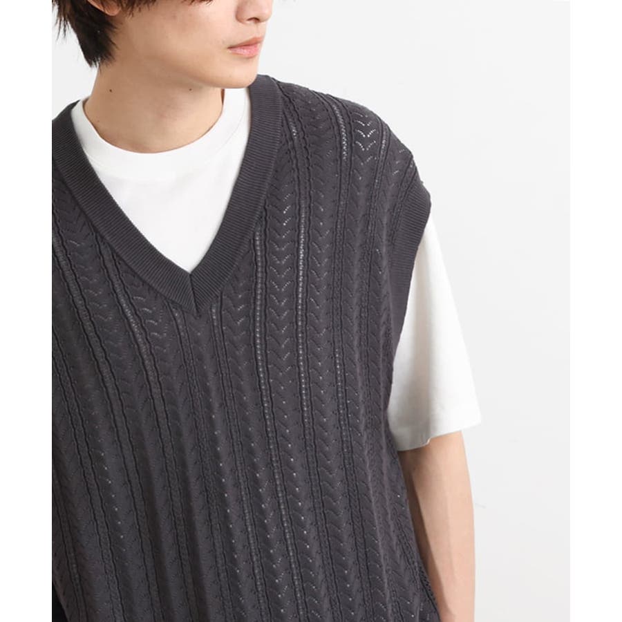 今季トレンドの表情のある編み柄ですかし編みにした涼しげなニットベスト。