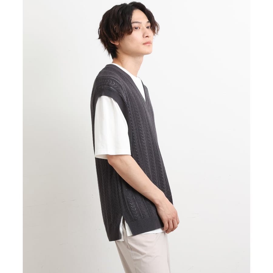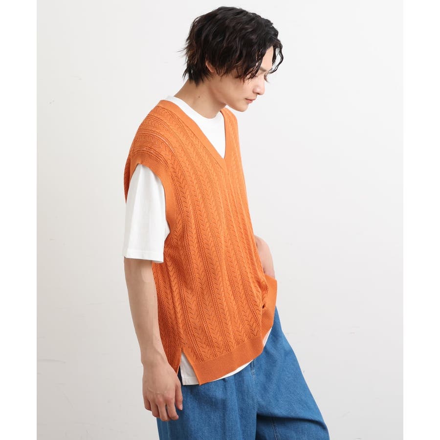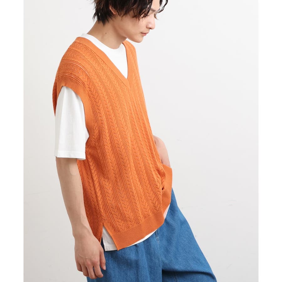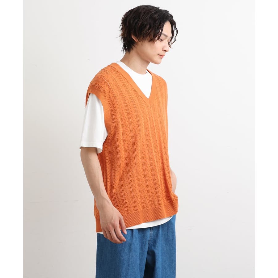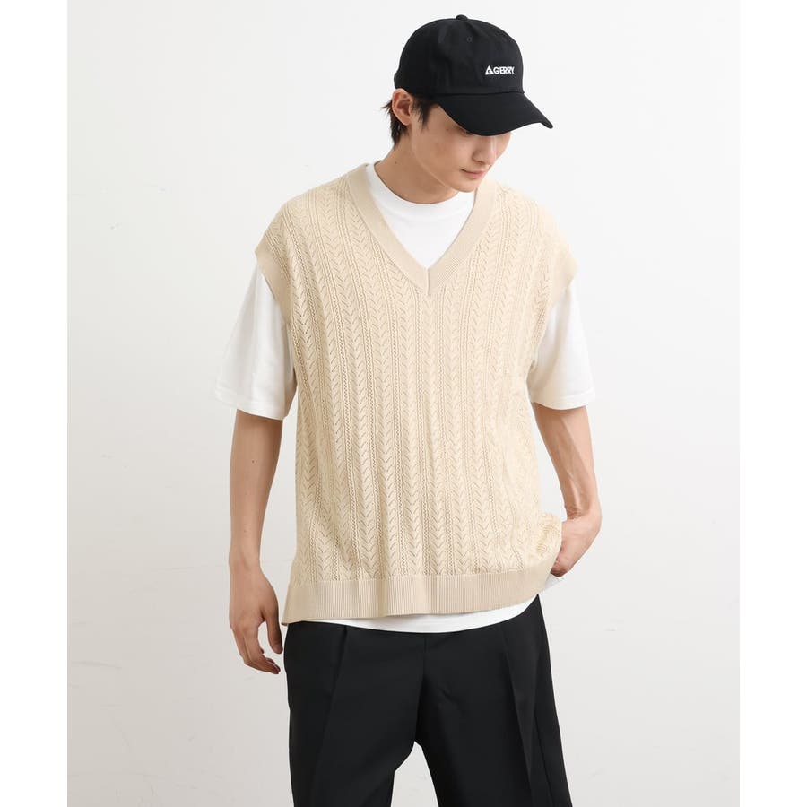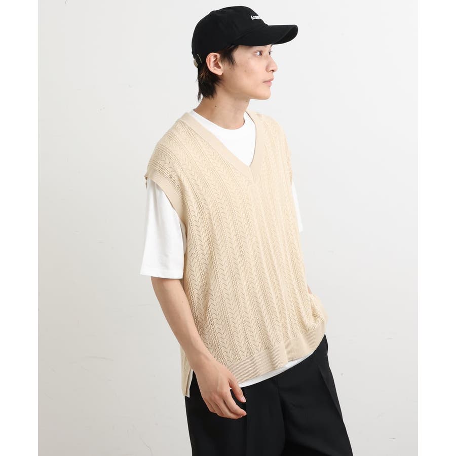 今季トレンドの表情のある編み柄ですかし編みにした涼しげなニットベスト。