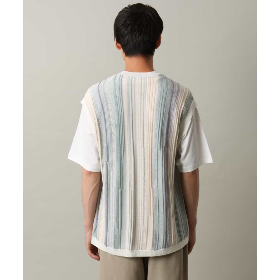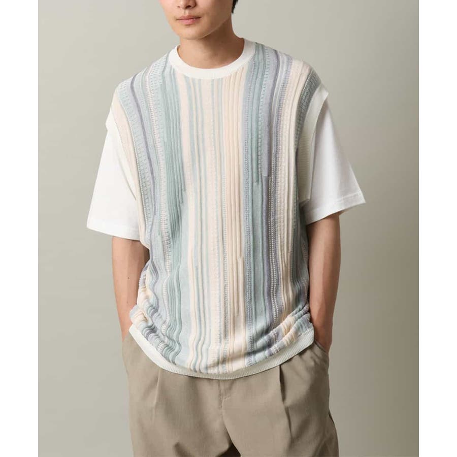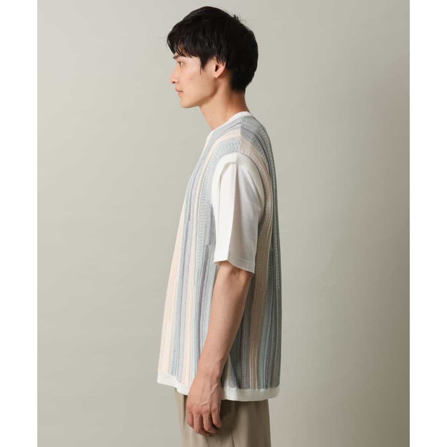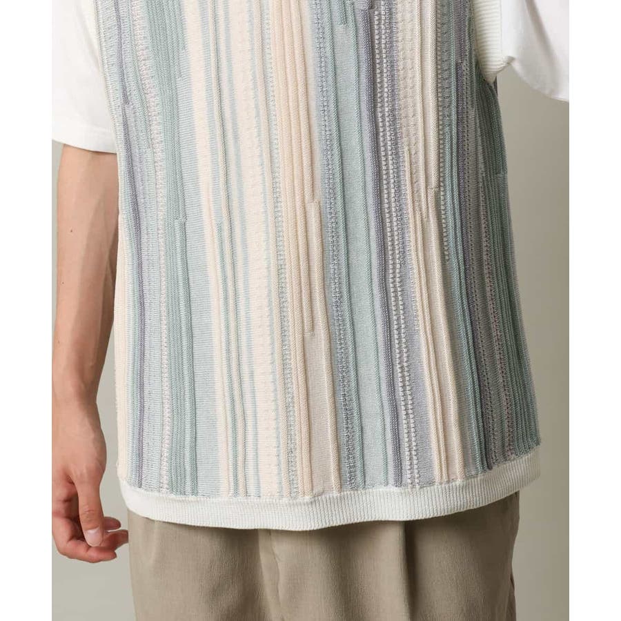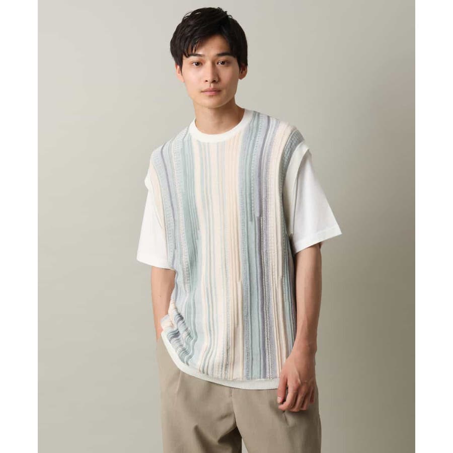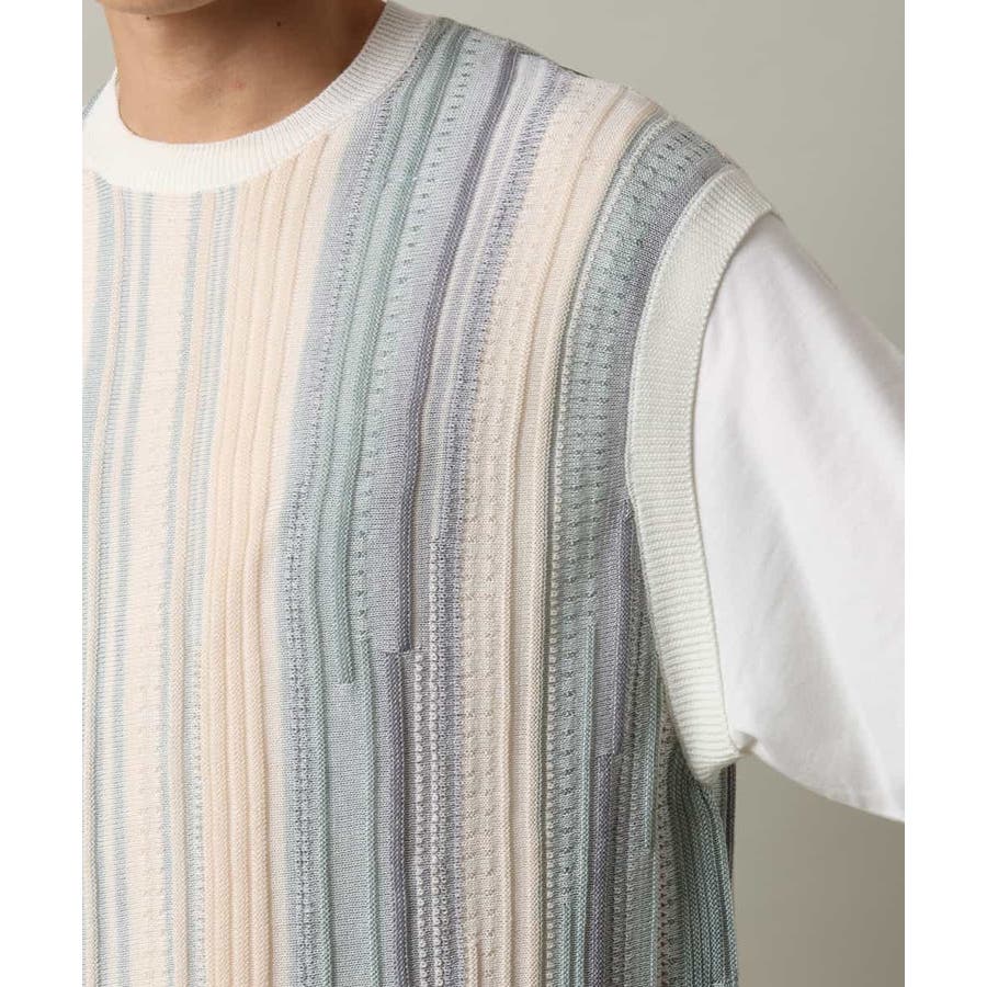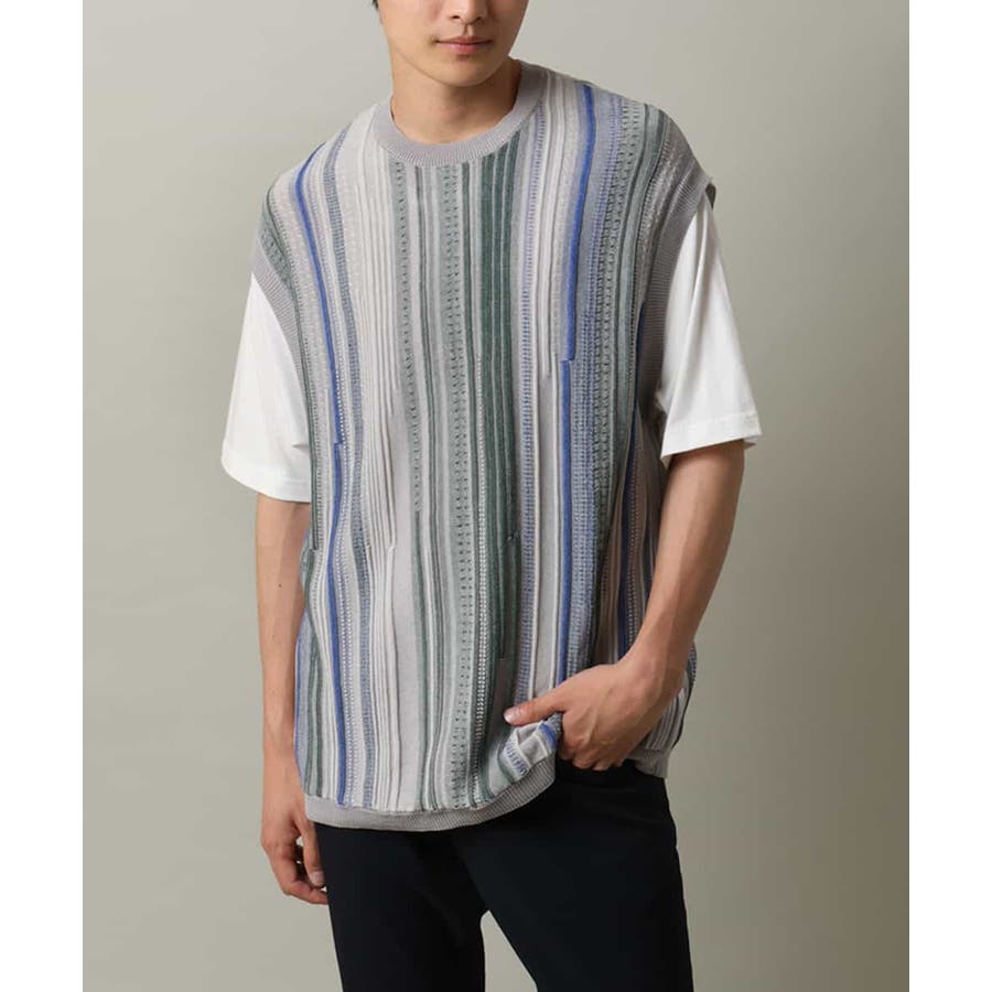 表面感のあるニット編地を前後の見頃部分に使用してニットベスト見えするデザインに仕上げたトレンド感のあるアイテム。