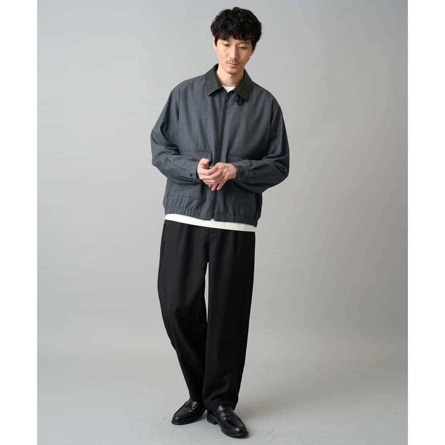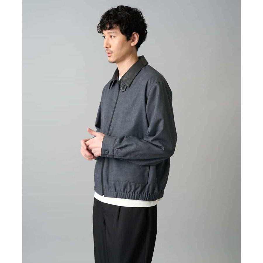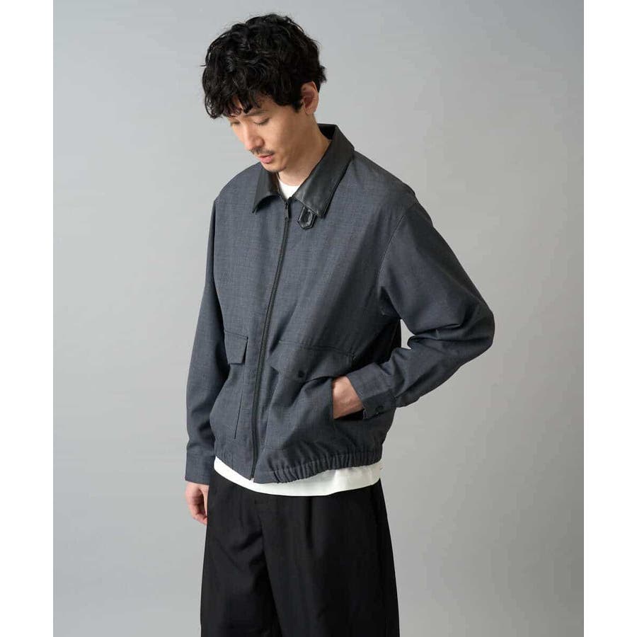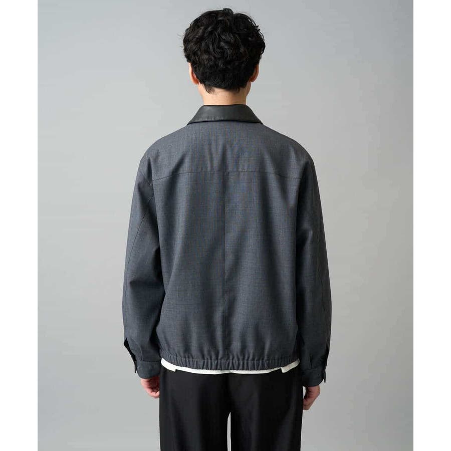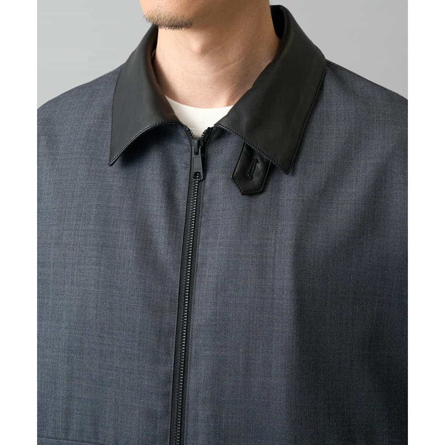 ドライタッチでサラリとした肌触りのポリエステルウールツイル素材、襟部分にフェイクレザー素材を使用。
