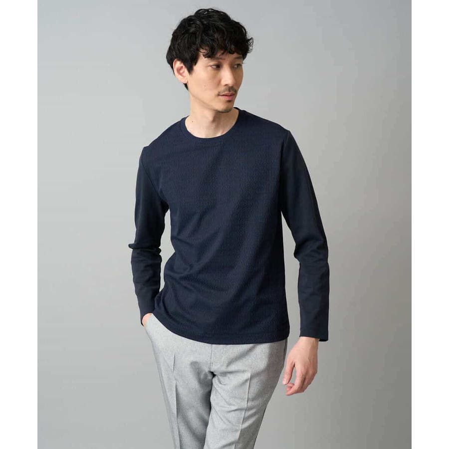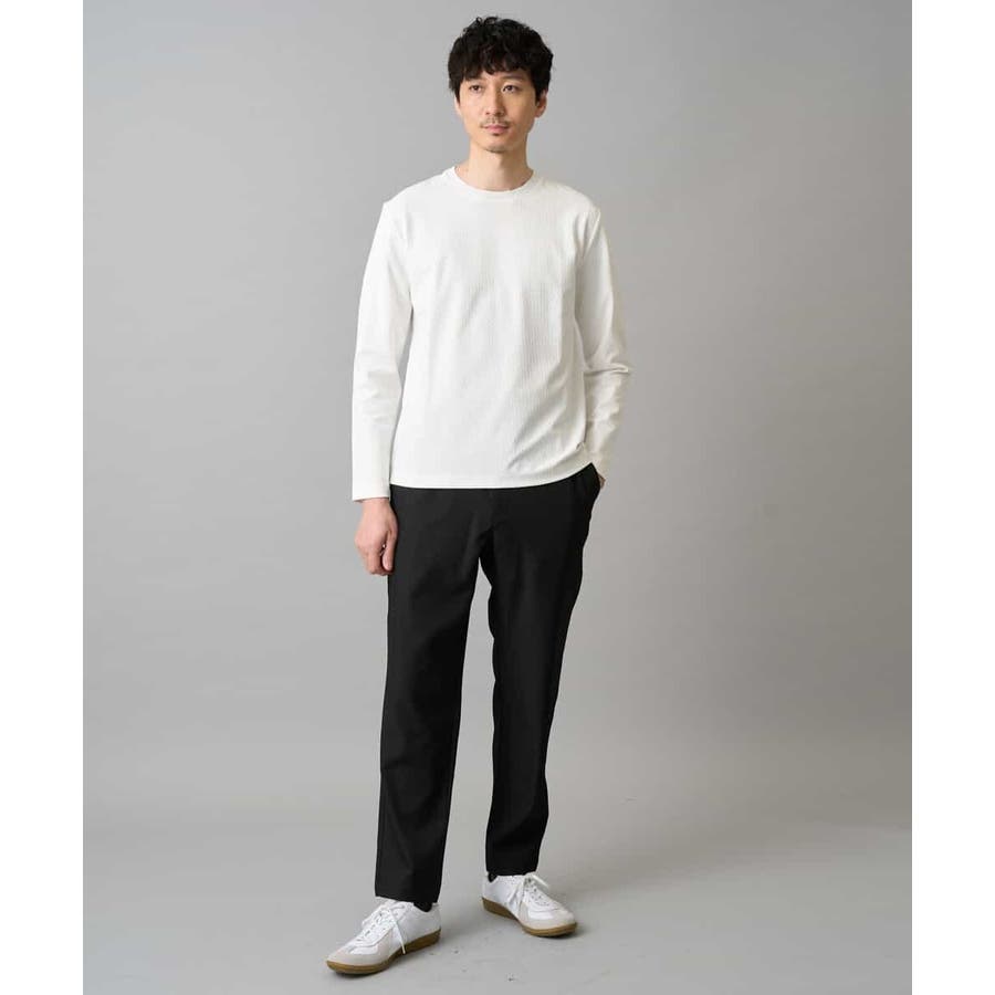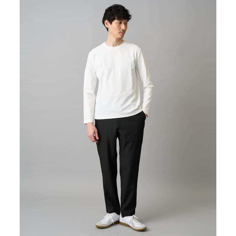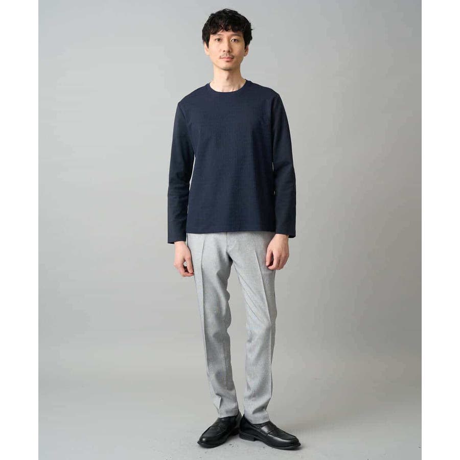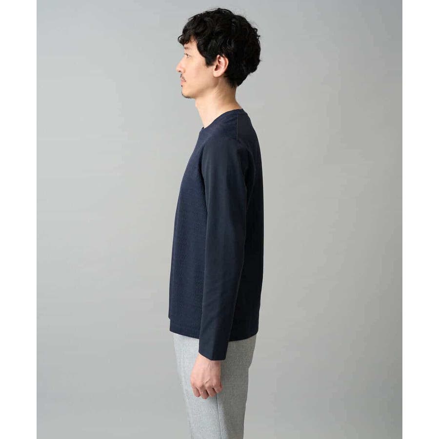 素材感を活かしたクルーネックデザインで、汎用性抜群です。身幅は少しゆとりがあるため、スッキリとキレイに見えながら着用しやすいシルエットです。