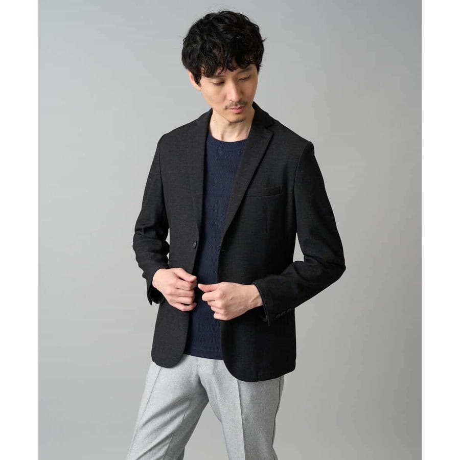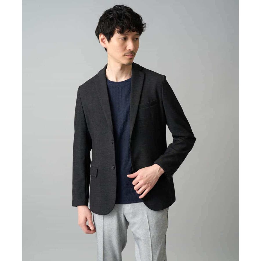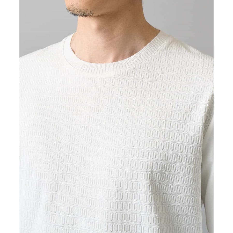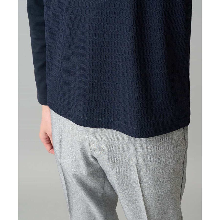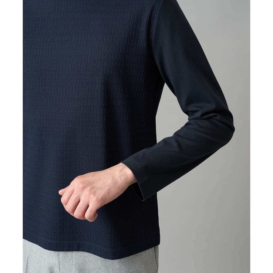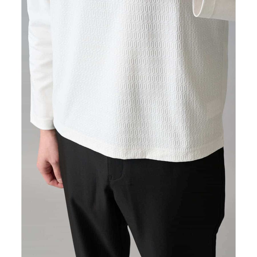 前身頃は、小柄のオーバルジャカードジャージーを使用し、ニットのような見え方に、袖と後ろ身頃は目面のキレイな同系色のTCポンチを使用。衿はフライスではなくニットで編立てし、JKのインナーとしてより上品で高級感ある見た目にしています。