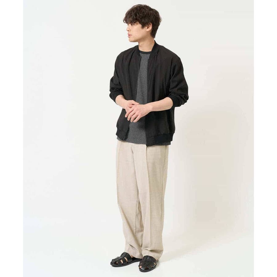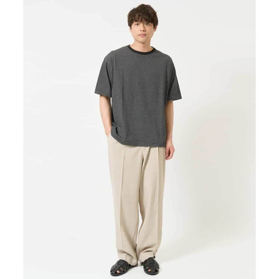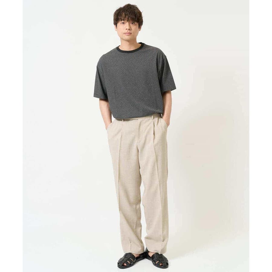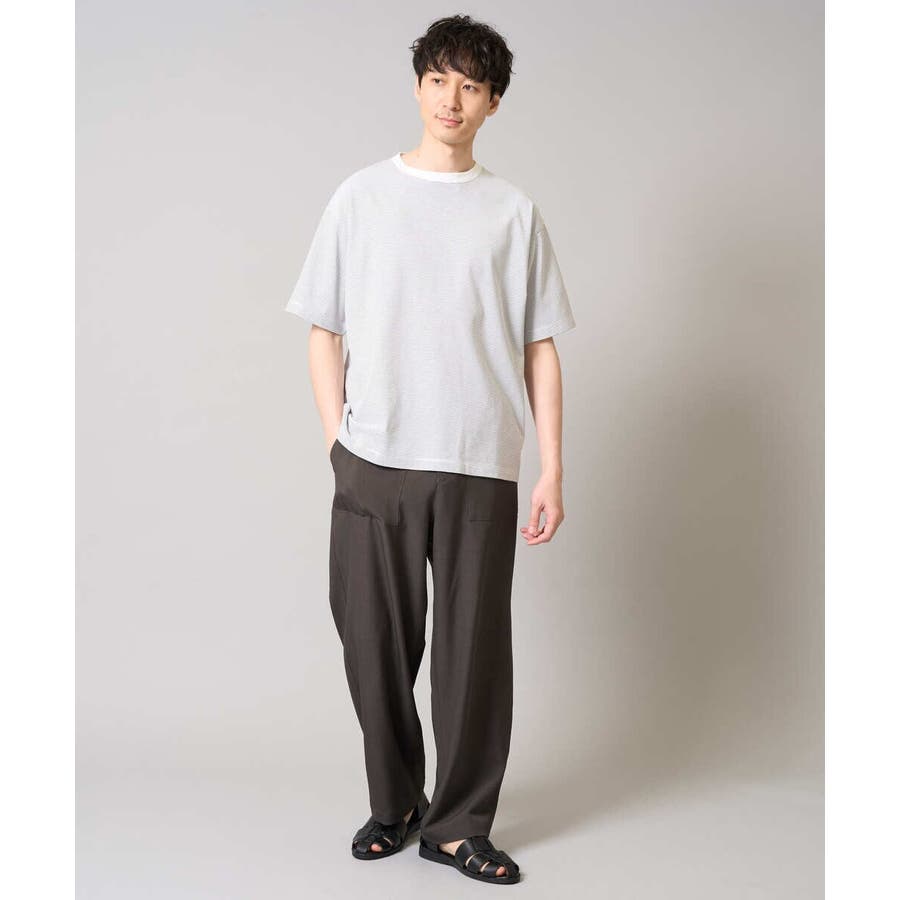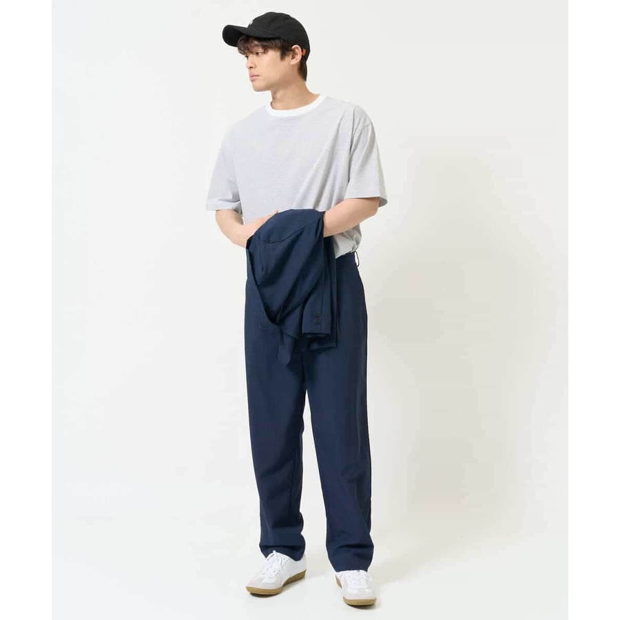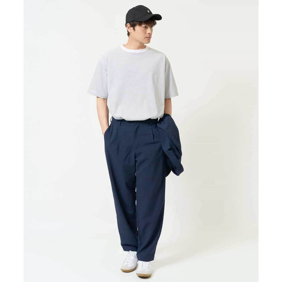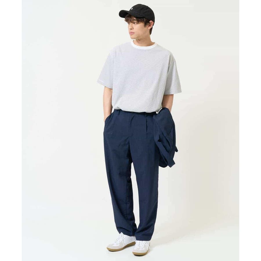 スラックス合わせできれい目スタイルに。ゆとりのあるパンツとあわせるとカジュアルな印象に。 タックインしてもバランスが良いコーディネートが完成します。