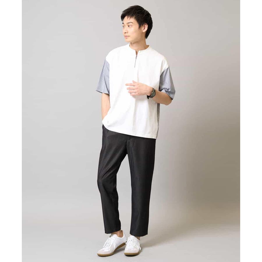 カジュアルスタイルであればタック入りなどのゆとりのあるパンツとあわせるとバランスの良いコーディネートに。