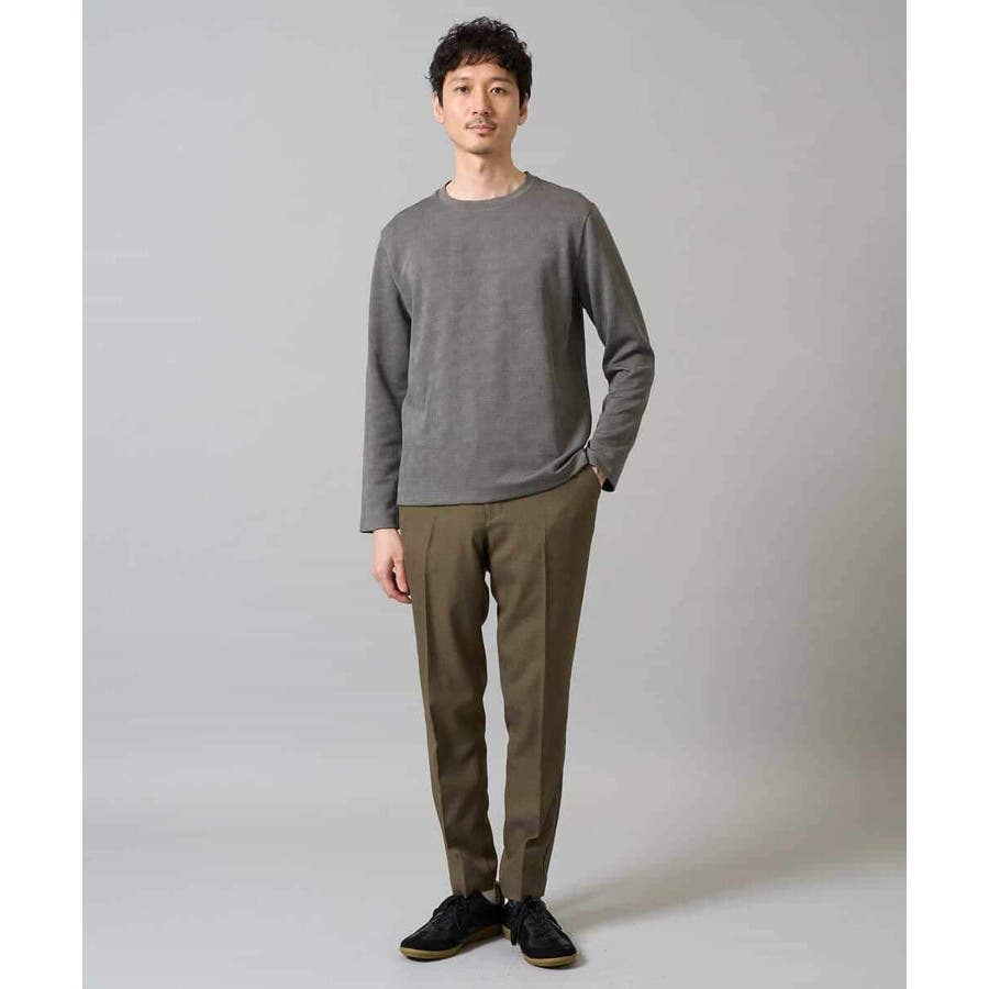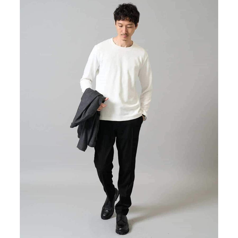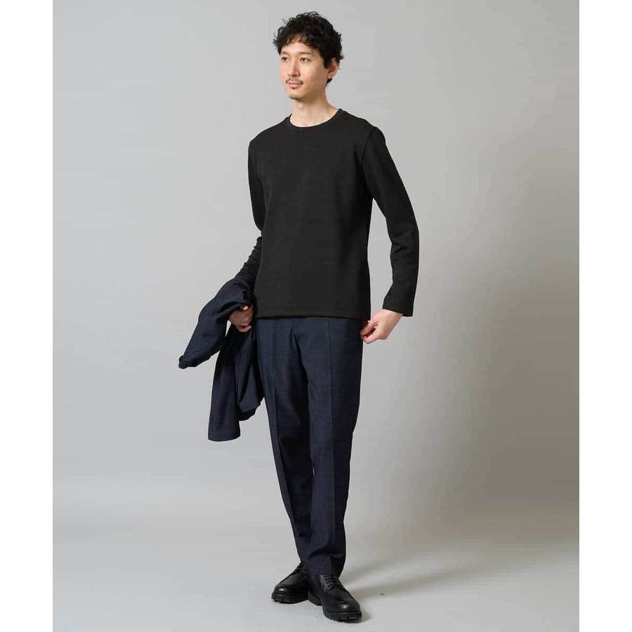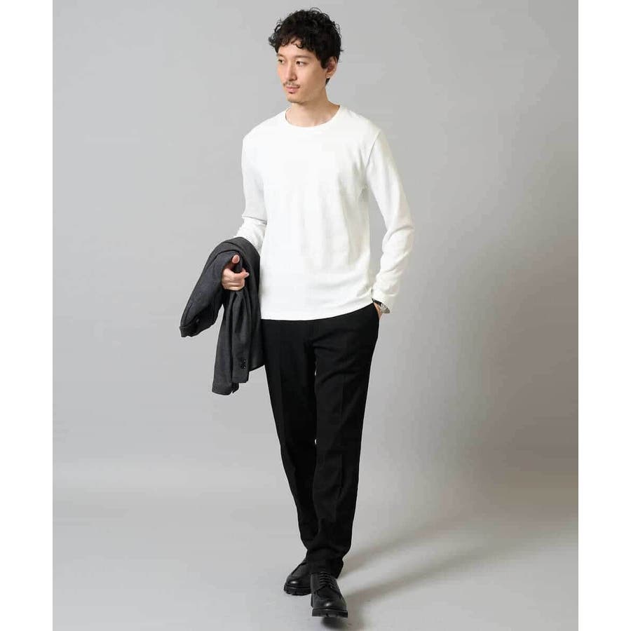 ボトムはONスタイルであればスラックス合わせ、OFFスタイルであればややゆとりのあるパンツとあわせでもバランスが良いスタイリングに。