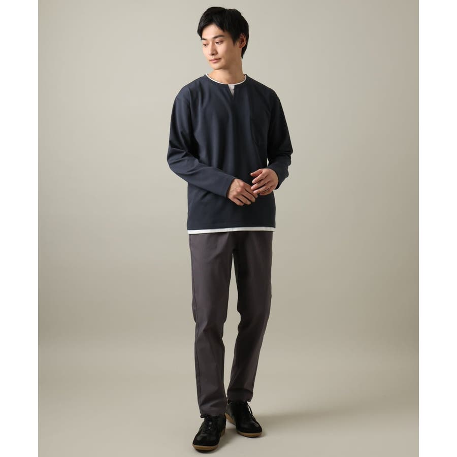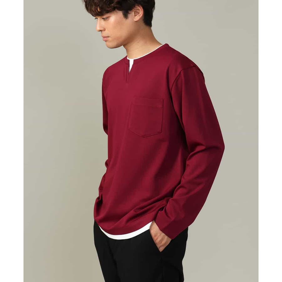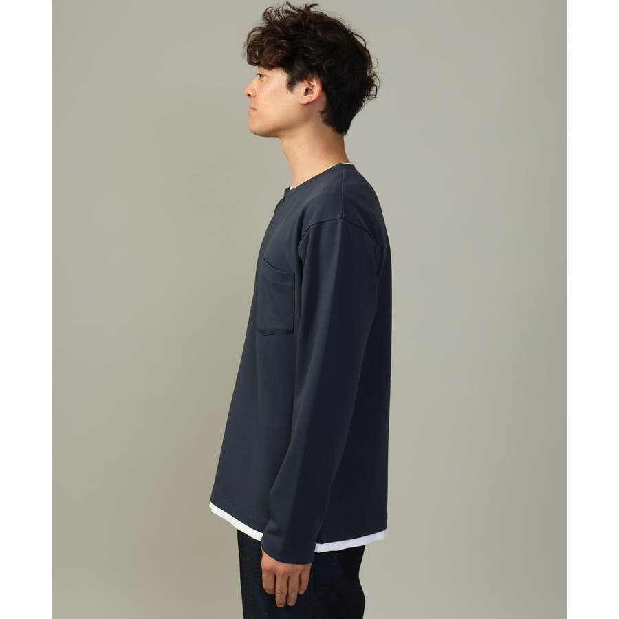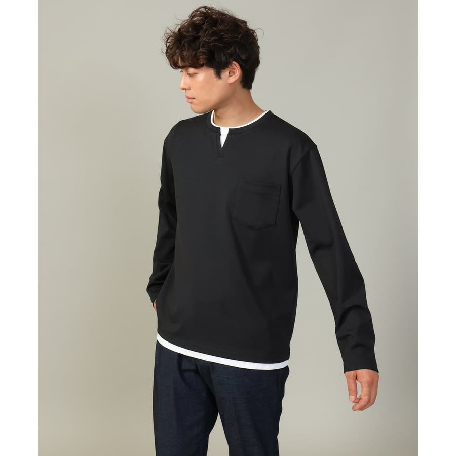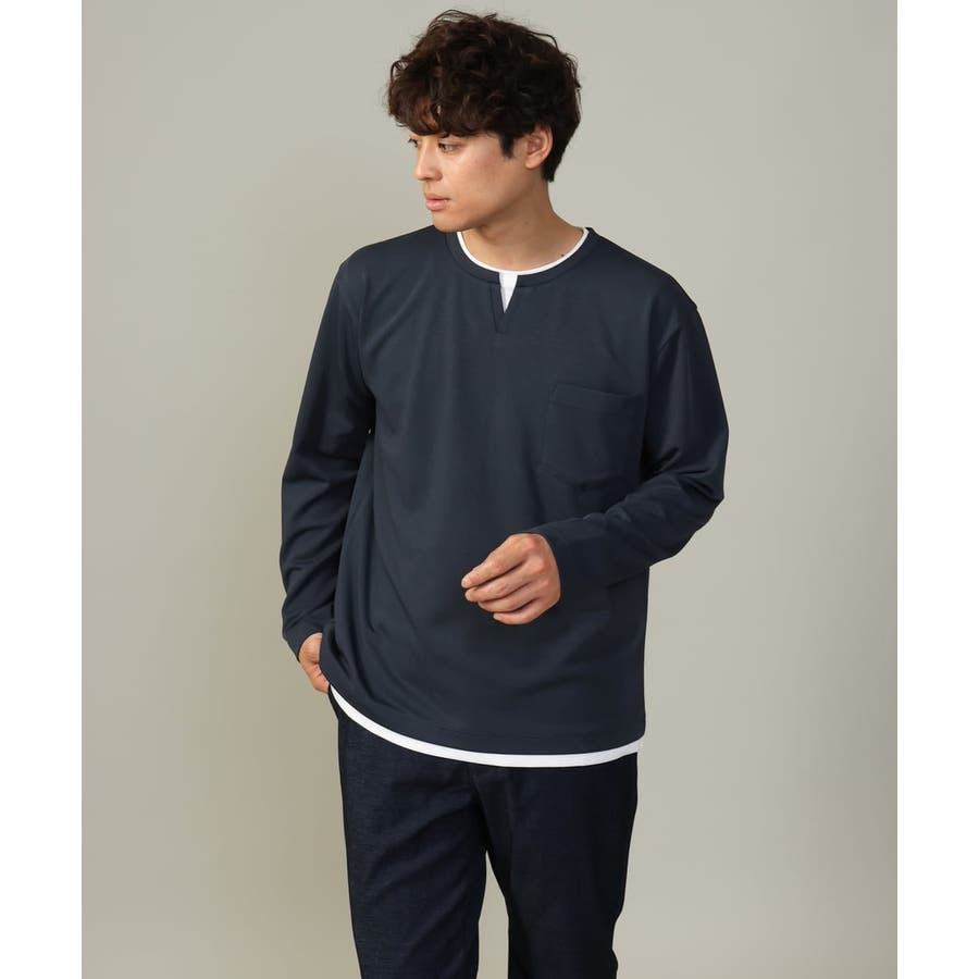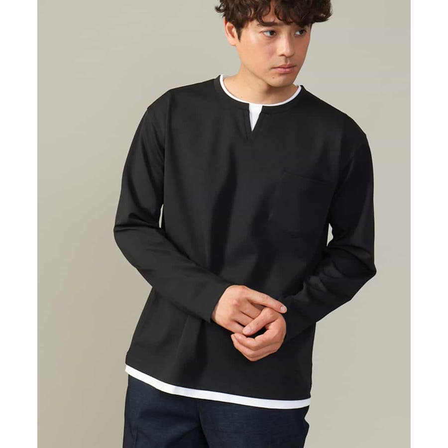 キーネックデザインをベースに襟元と裾口に白のカットソー素材を配色使用したフェイクレイヤードカットソー。まるで重ね着をしているかのようなデザインがポイント。手軽に1枚でレイヤードスタイルが完成するオススメカットソーです。シルエットはアウターやカーディガンのインナーにも着用しやすい程よくゆとりのあるセミワイドシルエットにしております。様々なアイテムに合わせやすい1枚持っていると便利な万能カットソーです。