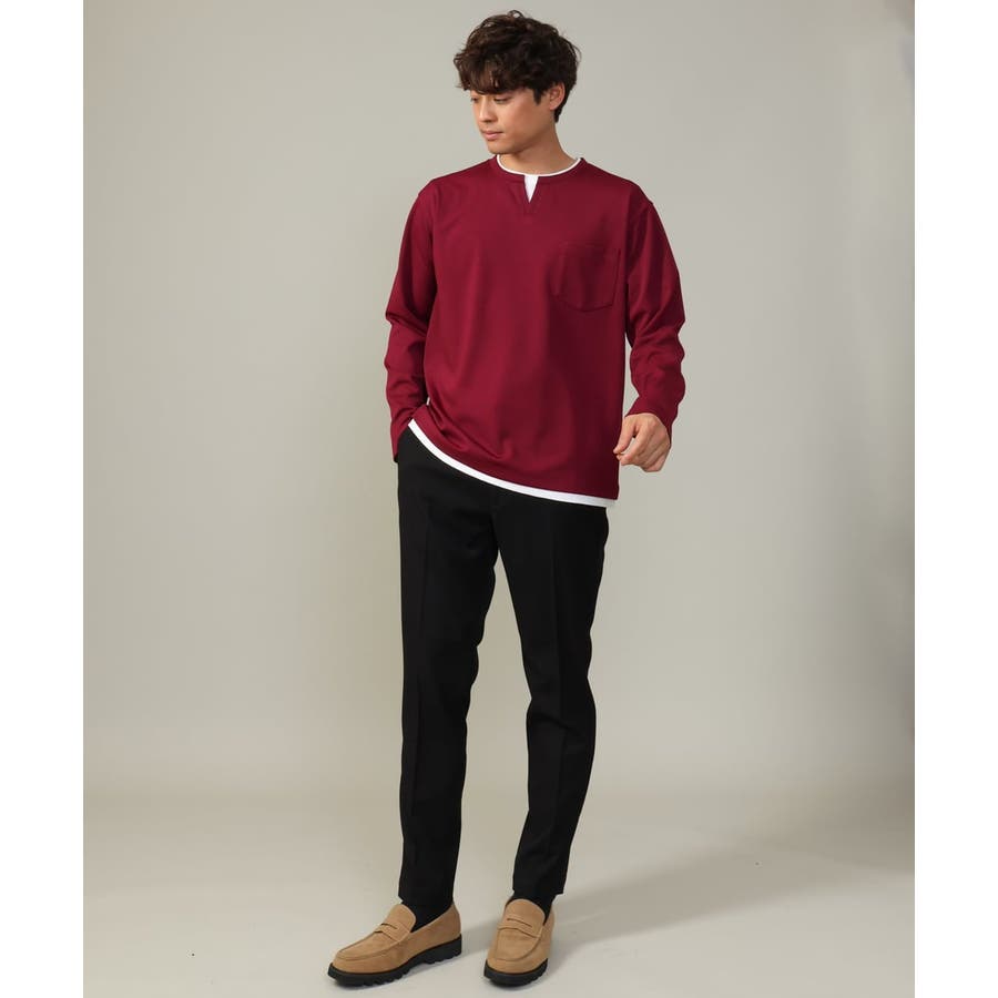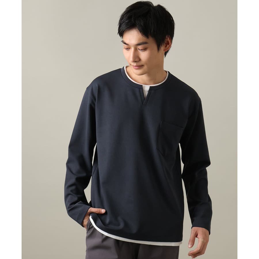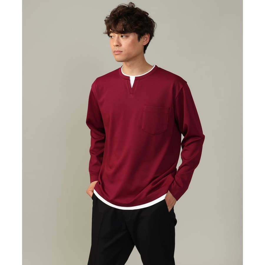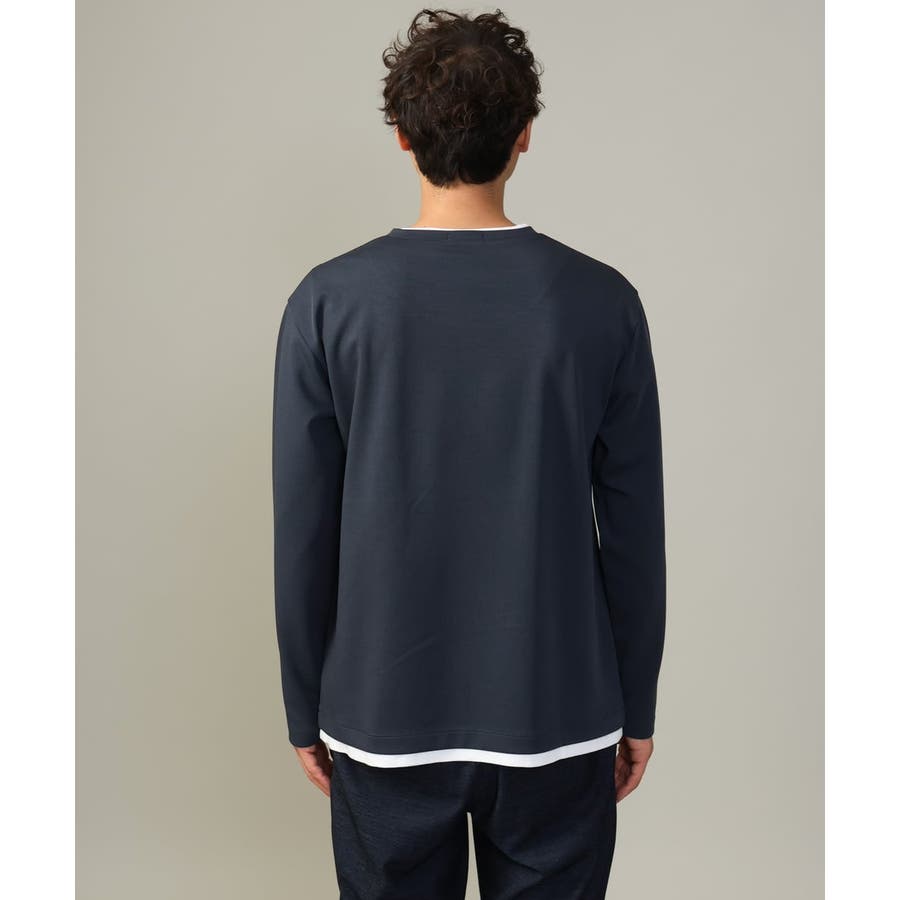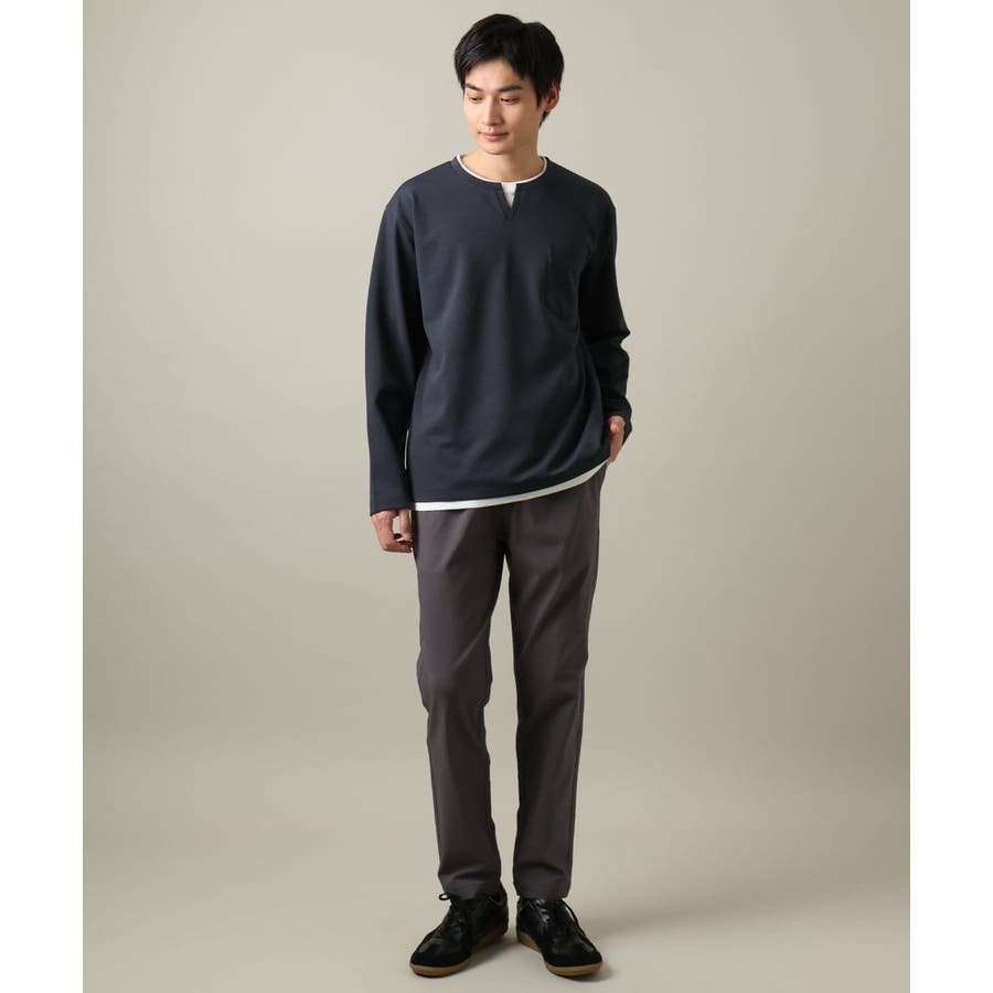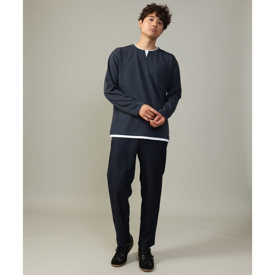 キーネックデザインをベースに襟元と裾口に白のカットソー素材を配色使用したフェイクレイヤードカットソー。まるで重ね着をしているかのようなデザインがポイント。手軽に1枚でレイヤードスタイルが完成するオススメカットソーです。シルエットはアウターやカーディガンのインナーにも着用しやすい程よくゆとりのあるセミワイドシルエットにしております。様々なアイテムに合わせやすい1枚持っていると便利な万能カットソーです。