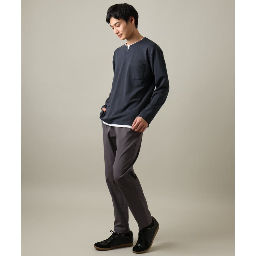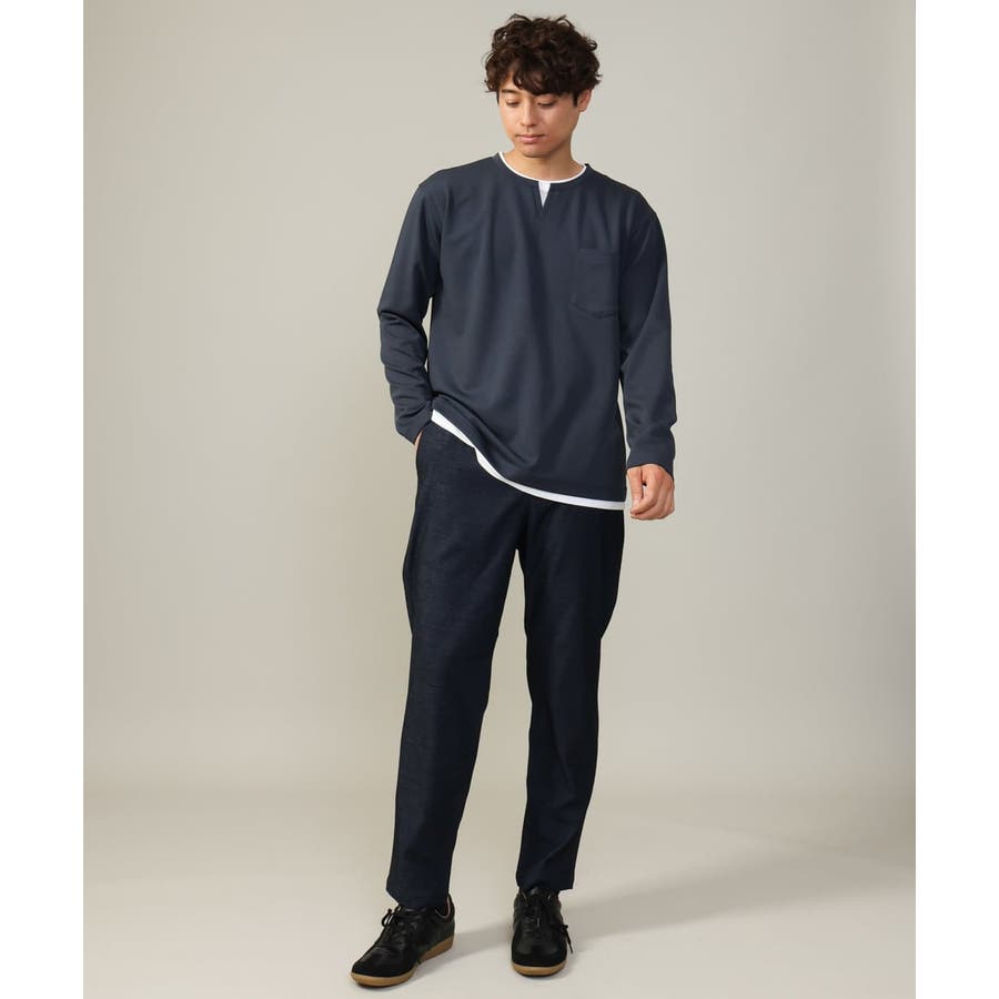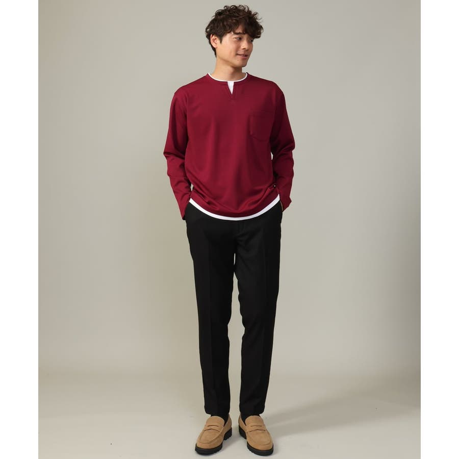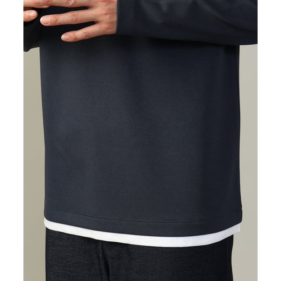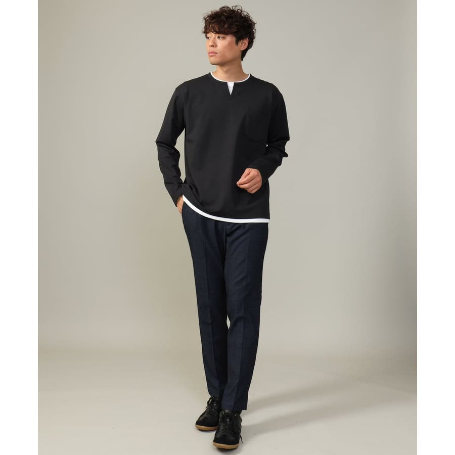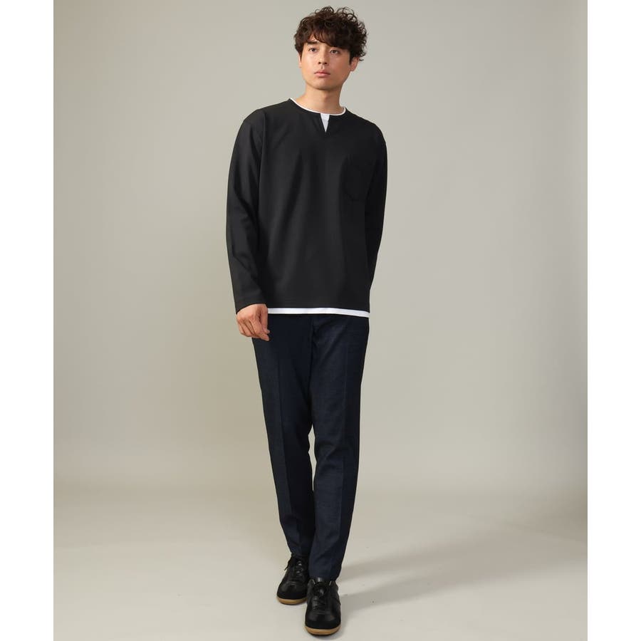キーネックデザインをベースに襟元と裾口に白のカットソー素材を配色使用したフェイクレイヤードカットソー。まるで重ね着をしているかのようなデザインがポイント。手軽に1枚でレイヤードスタイルが完成するオススメカットソーです。シルエットはアウターやカーディガンのインナーにも着用しやすい程よくゆとりのあるセミワイドシルエットにしております。様々なアイテムに合わせやすい1枚持っていると便利な万能カットソーです。