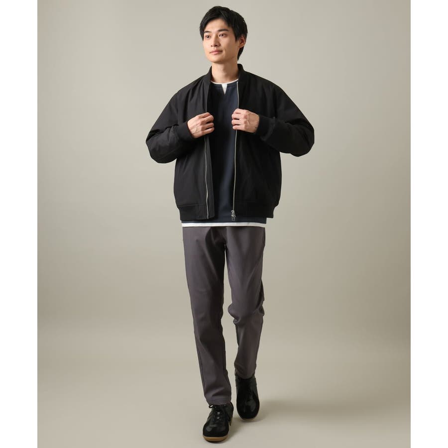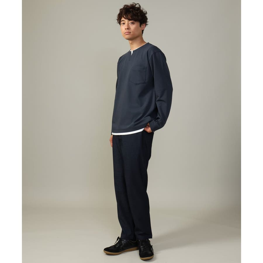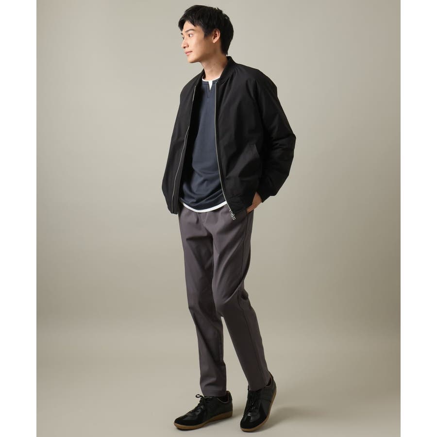 一枚で完結するアイテムで、ボトムはきれい目な雰囲気であればスラックスデザイン。カジュアルに着こなすのであればゆとりのあるパンツもオススメです。アウターのインナーにも映えるアイテムです。
