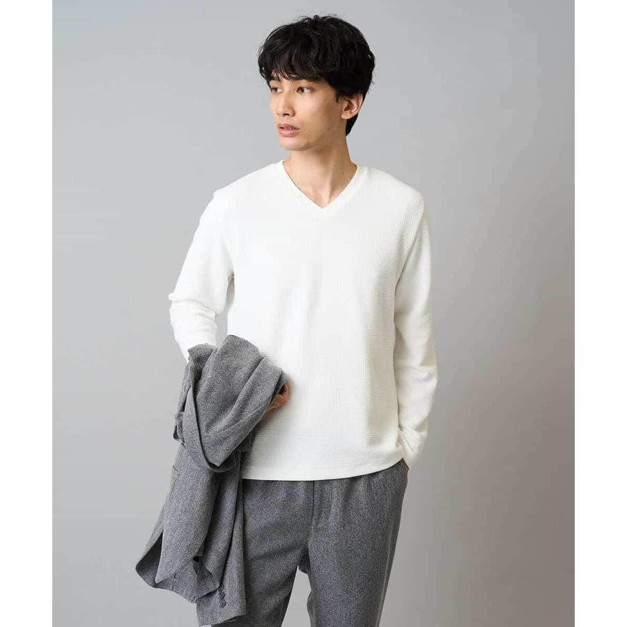 一枚で着てもサマになり、特にテーラードジャケットとのきれいめスタイルがオススメです。