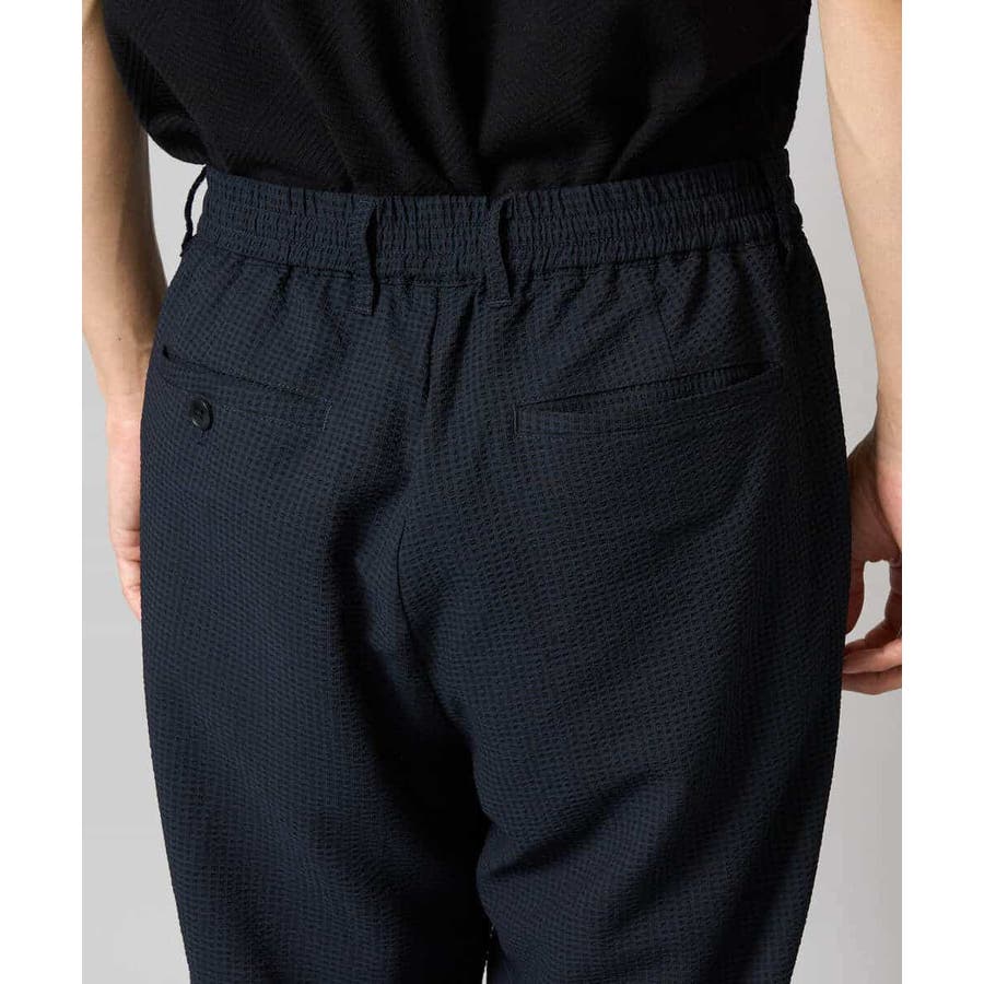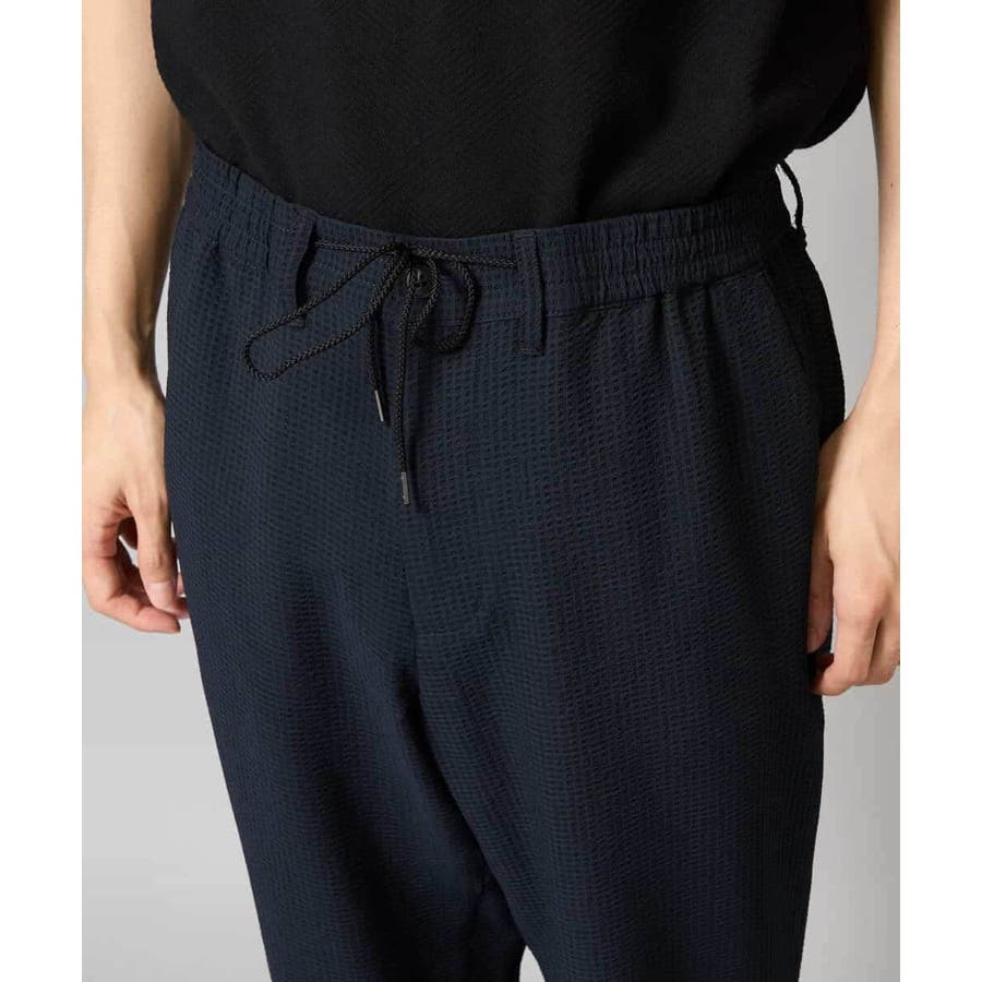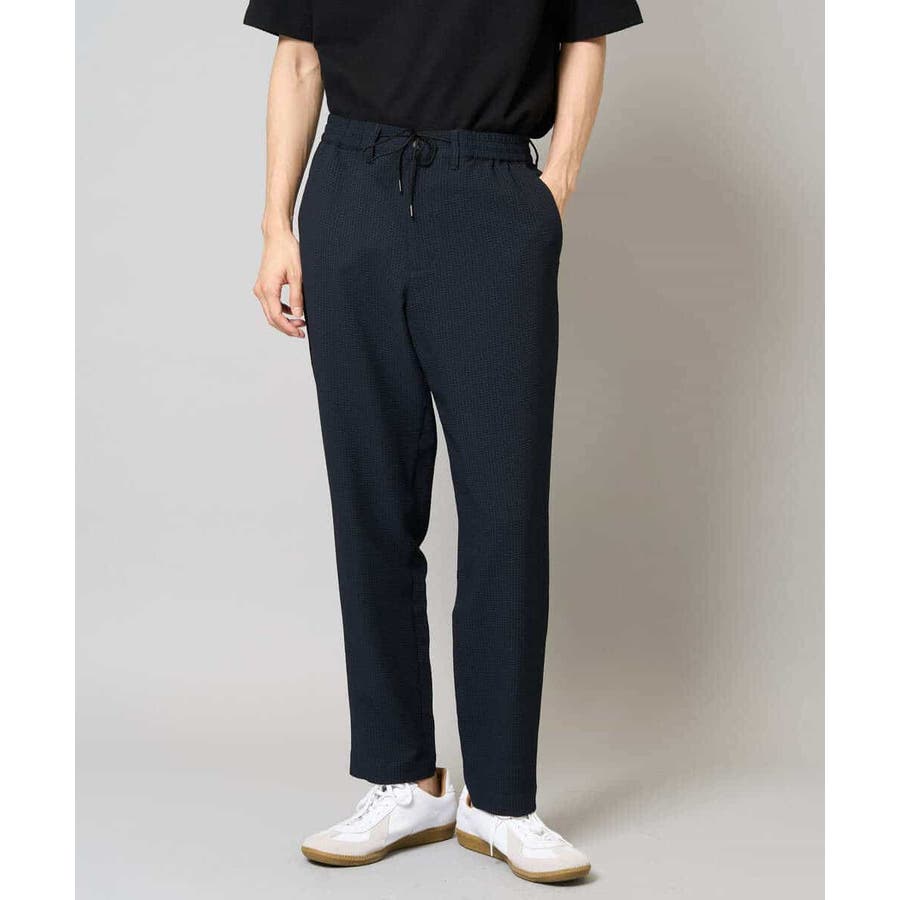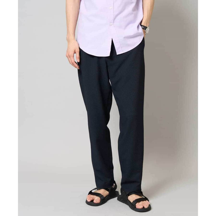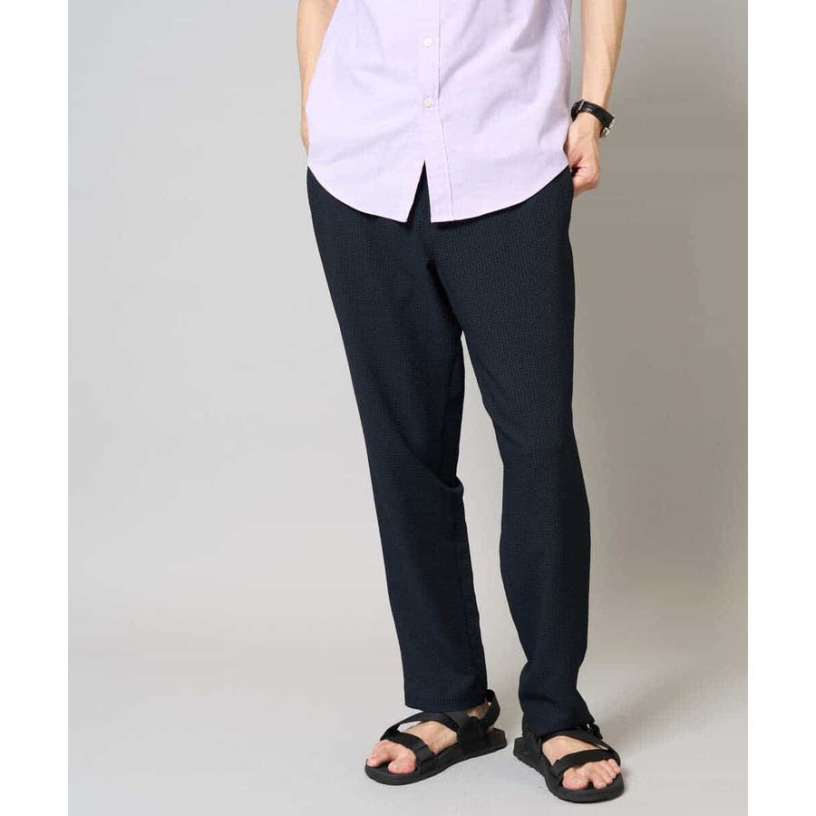 ストレッチの効いた薄手のシアサッカー素材を使用した、きれいめリラックスで大人見えするテーパードパンツ。