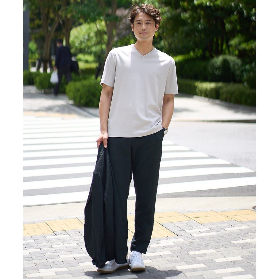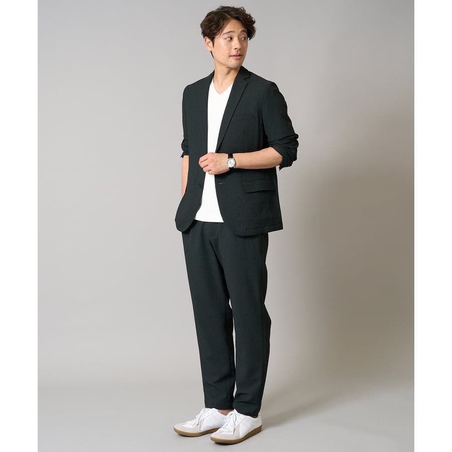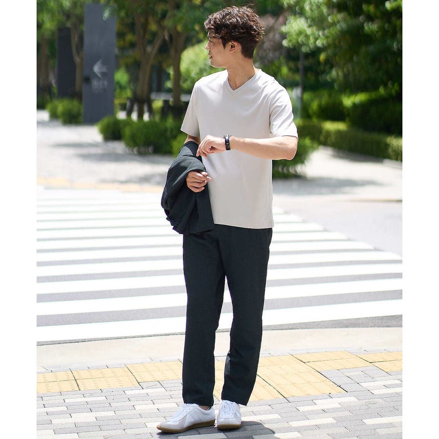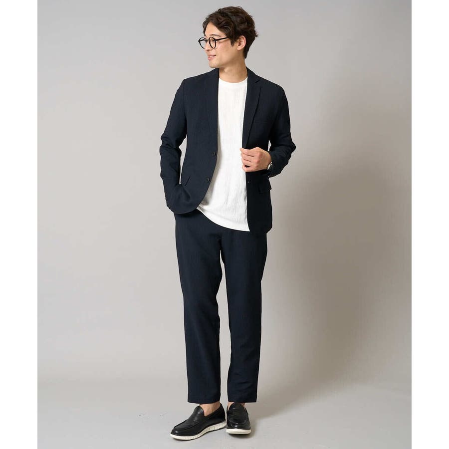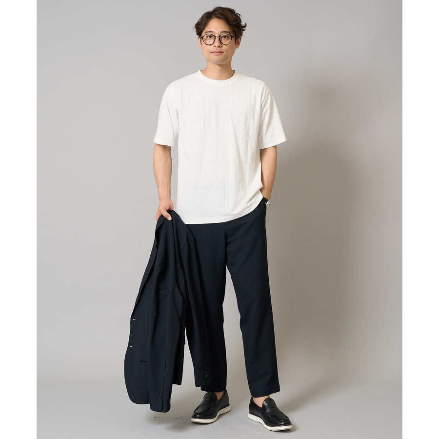 ストレッチの効いた薄手のシアサッカー素材を使用した、きれいめリラックスで大人見えするテーパードパンツ。