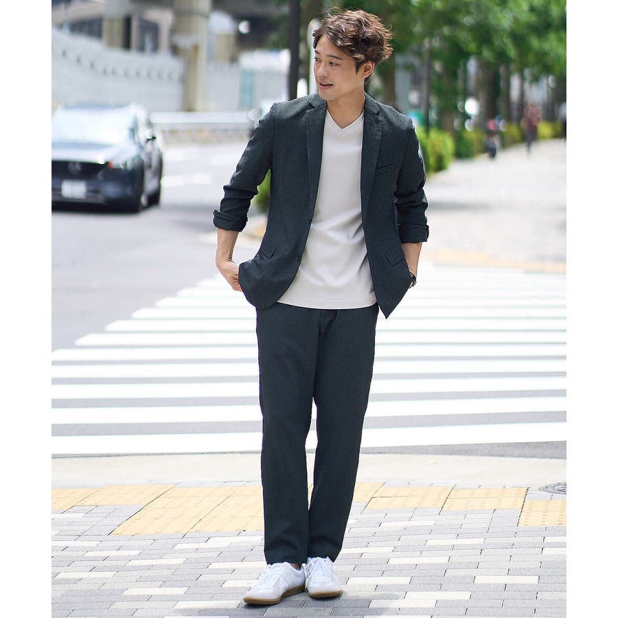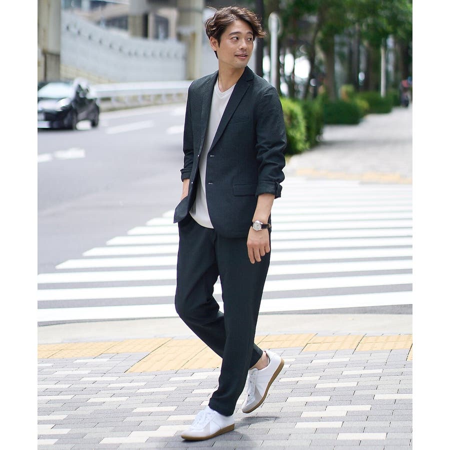 同素材のジャケットやポロシャツを合わせるセットアップコーディネートがまとまりがありトレンド感が満載です。