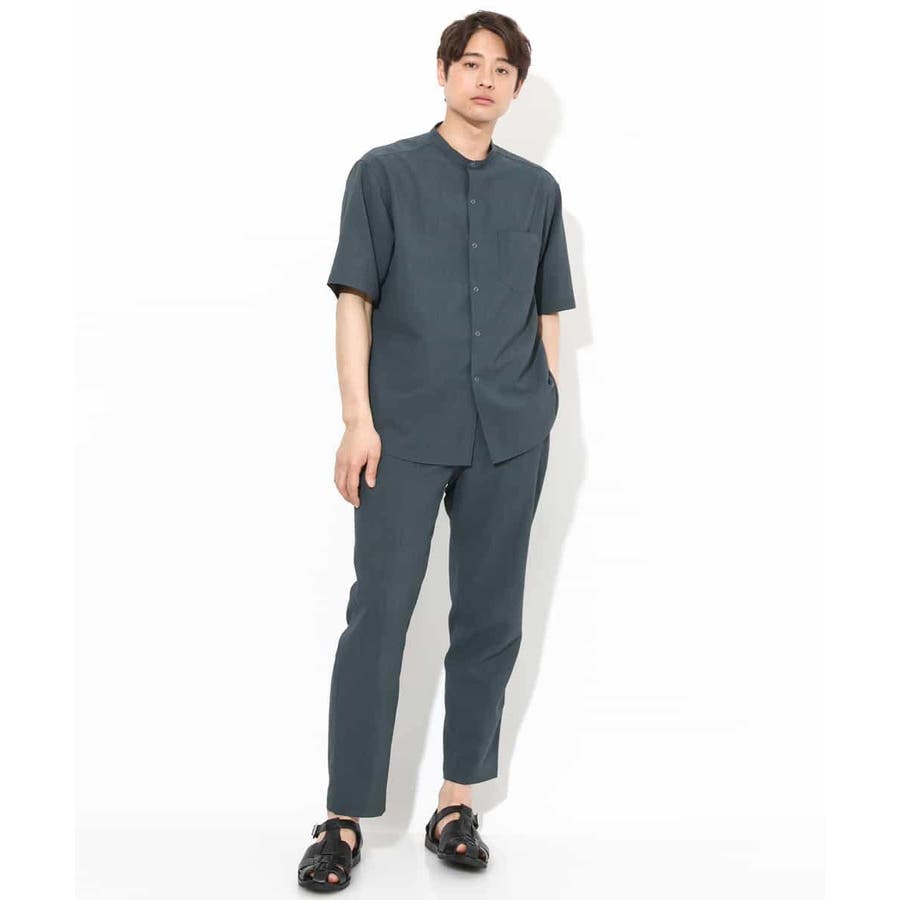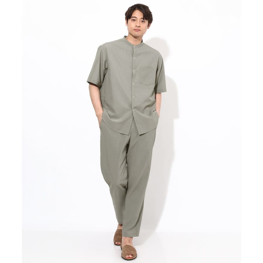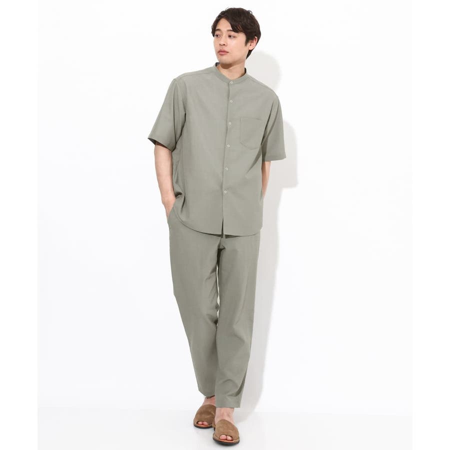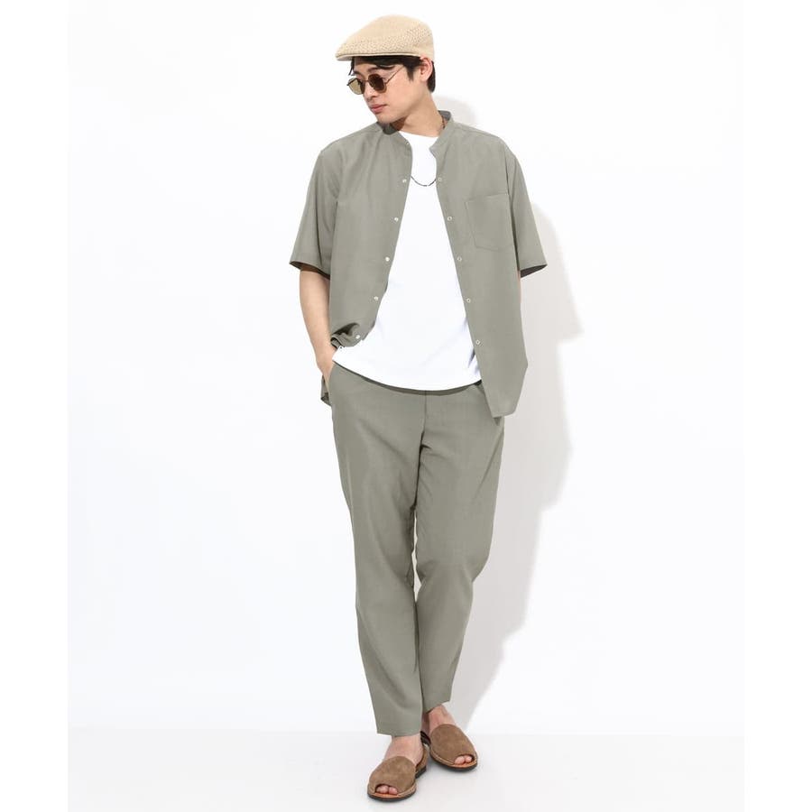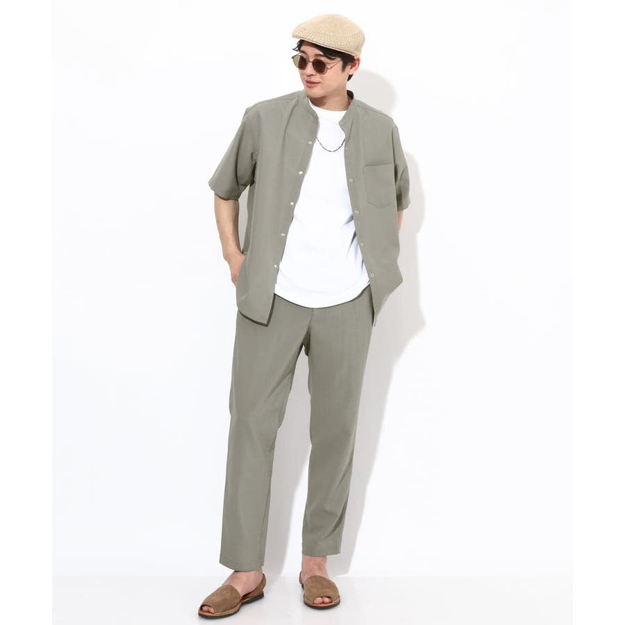 トップスには同素材のバンドカラーやオープンカラ―シャツを合わせる同色のセットアップコーディネートがまとまりがありトレンド感が満載です。