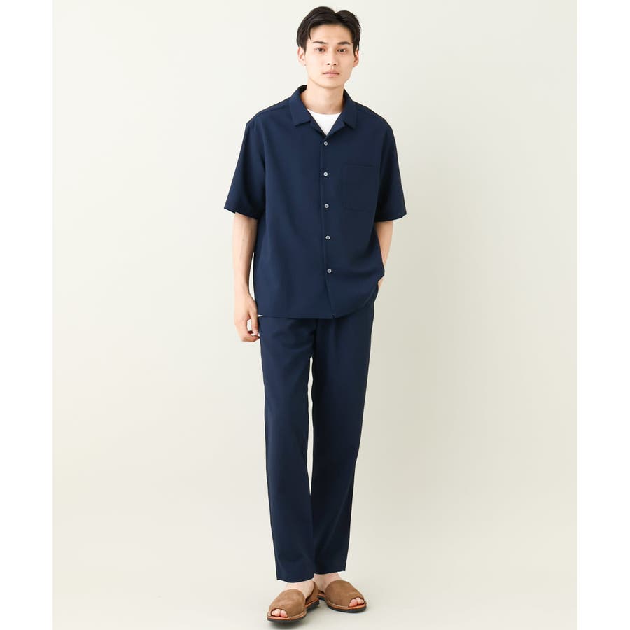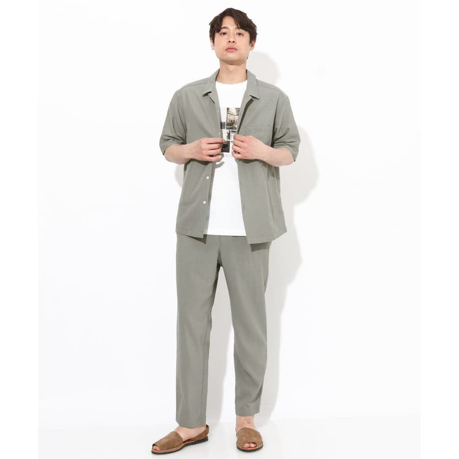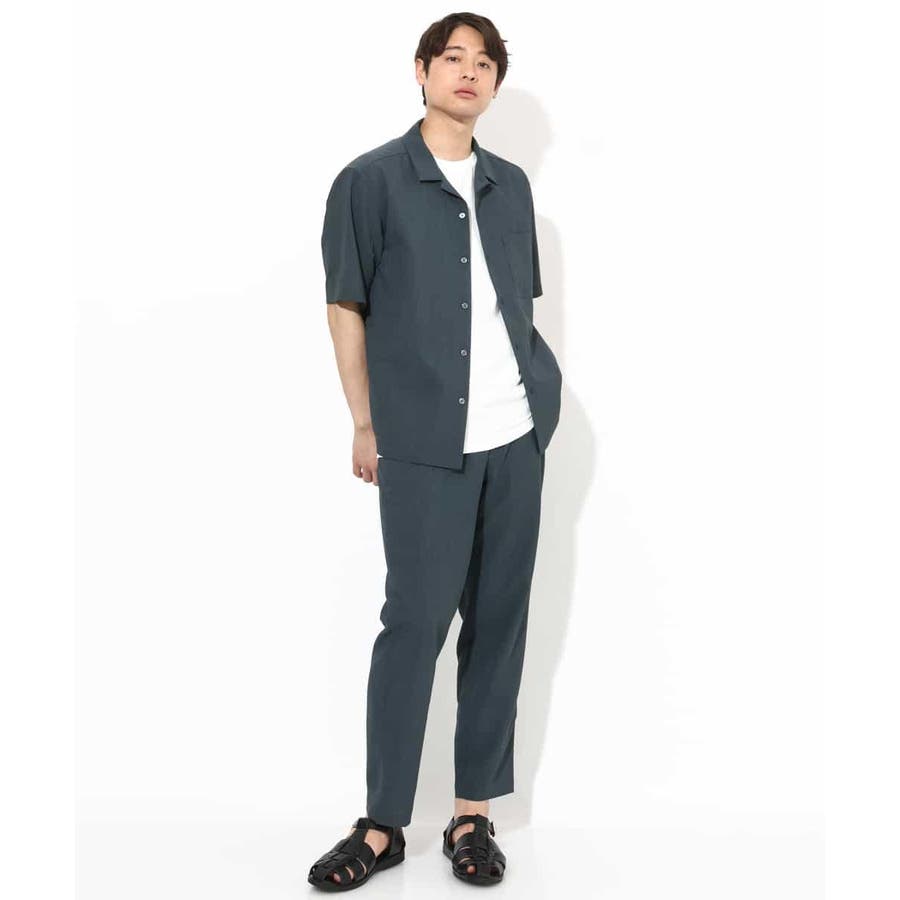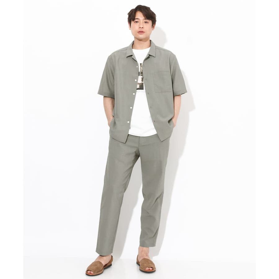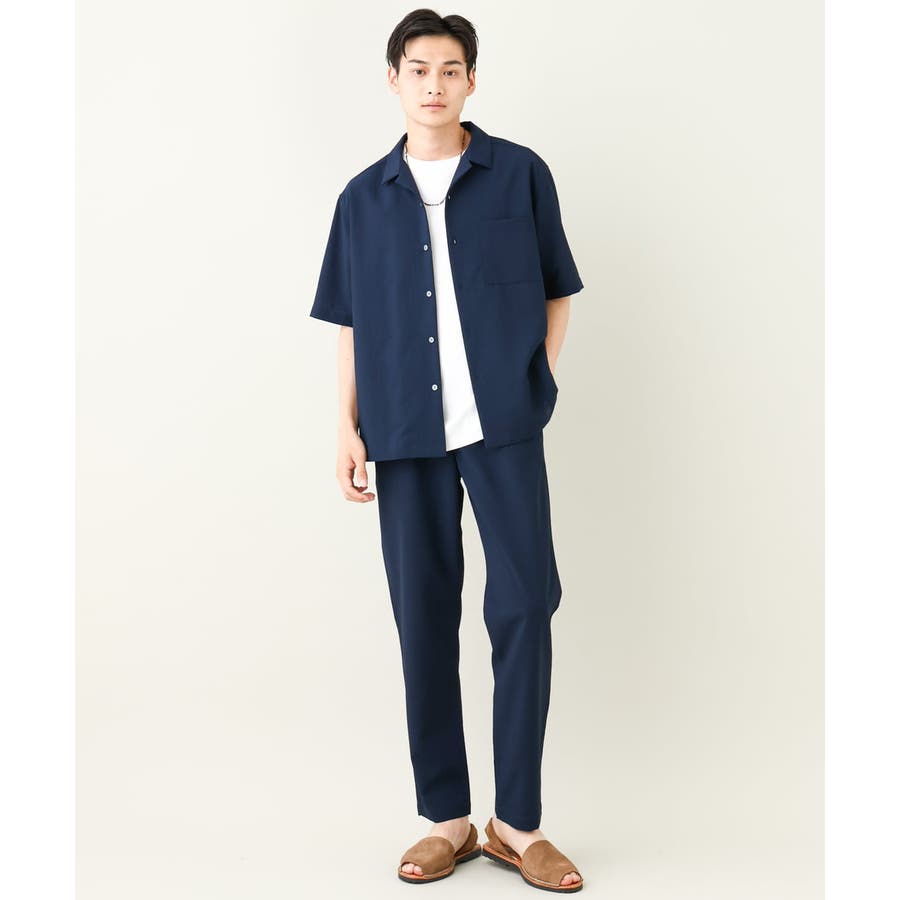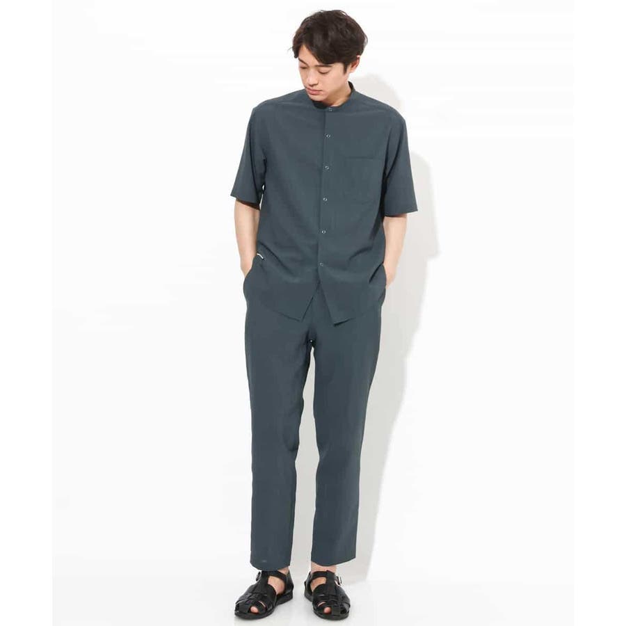 トップスには同素材のバンドカラーやオープンカラ―シャツを合わせる同色のセットアップコーディネートがまとまりがありトレンド感が満載です。