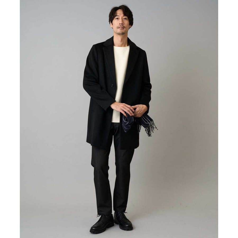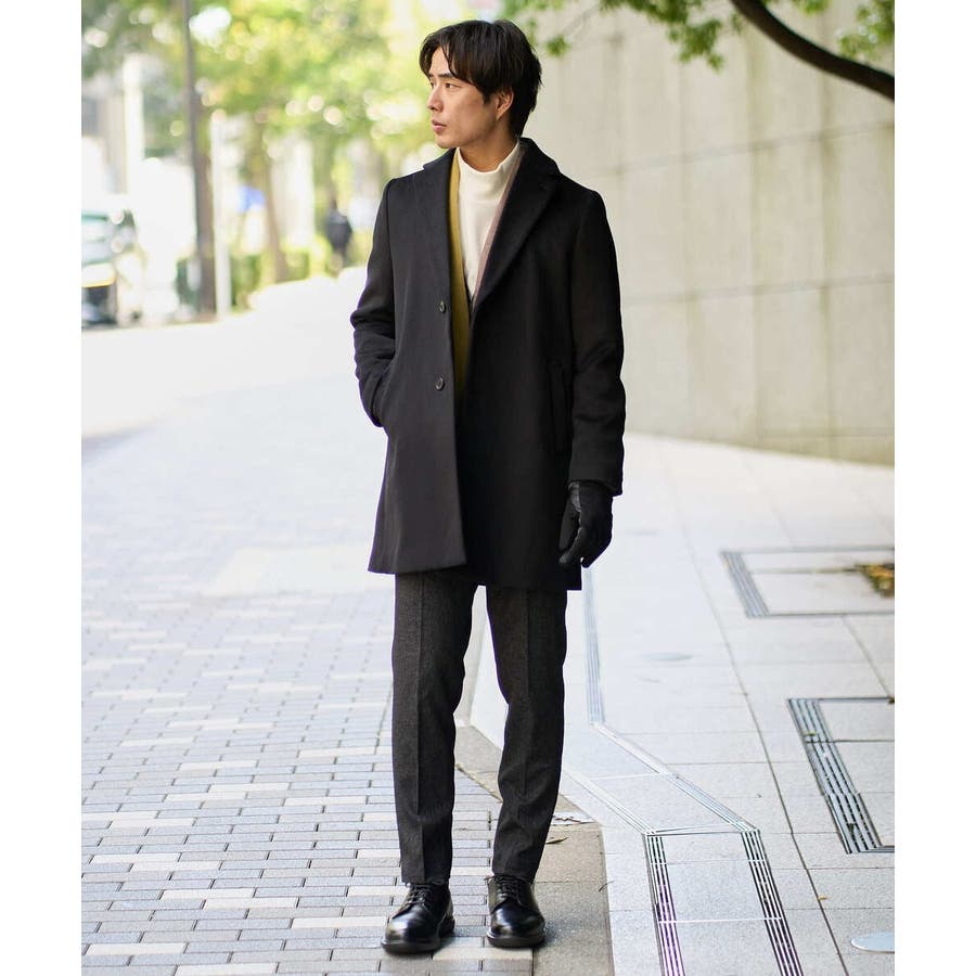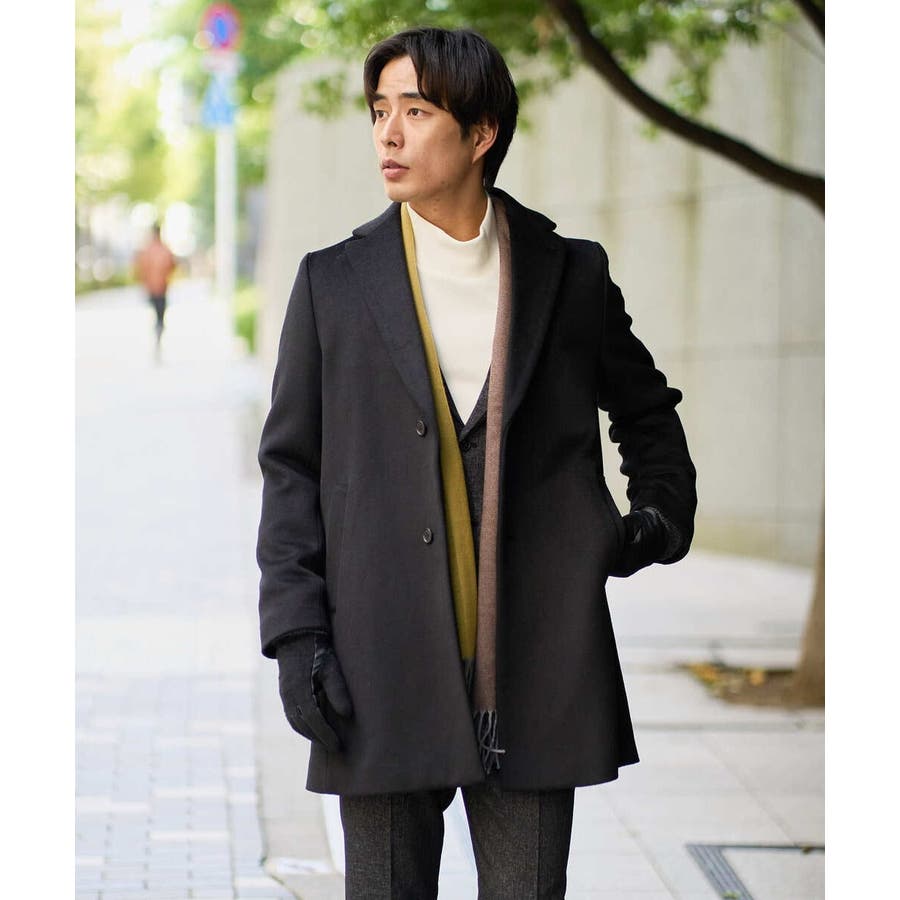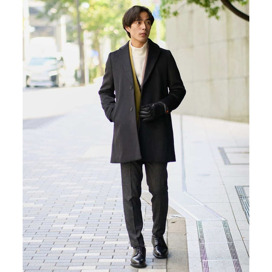 膝上丈の着こなしやすい着丈のチェスターコートは、ニットをコーディネートしたカジュアルスタイルからジャケットと合わせたビジネススタイルでもスッキリした印象。 ON/OFF兼用でさまざまな場面で活躍できる一着です。