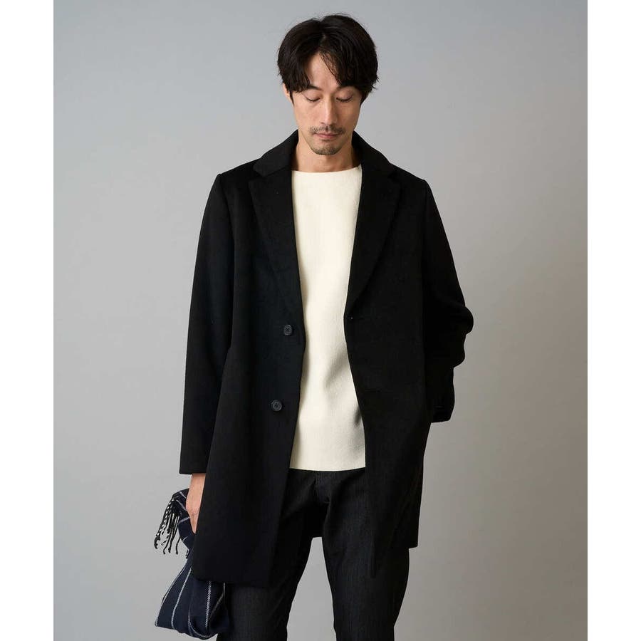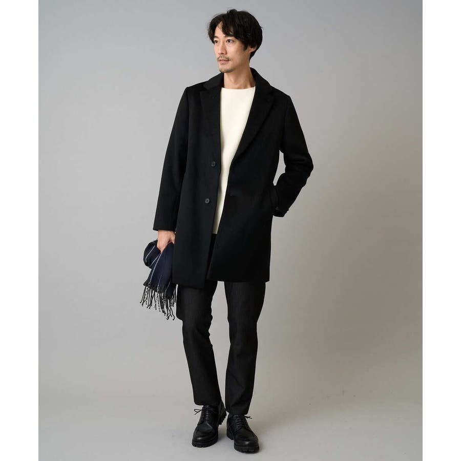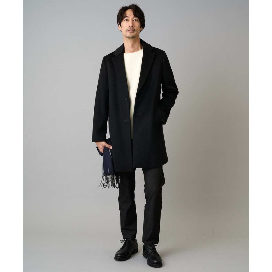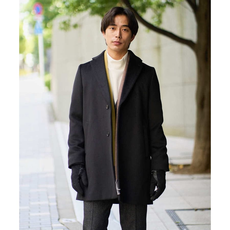 膝上丈の着こなしやすい着丈のチェスターコートは、ニットをコーディネートしたカジュアルスタイルからジャケットと合わせたビジネススタイルでもスッキリした印象。 ON/OFF兼用でさまざまな場面で活躍できる一着です。
