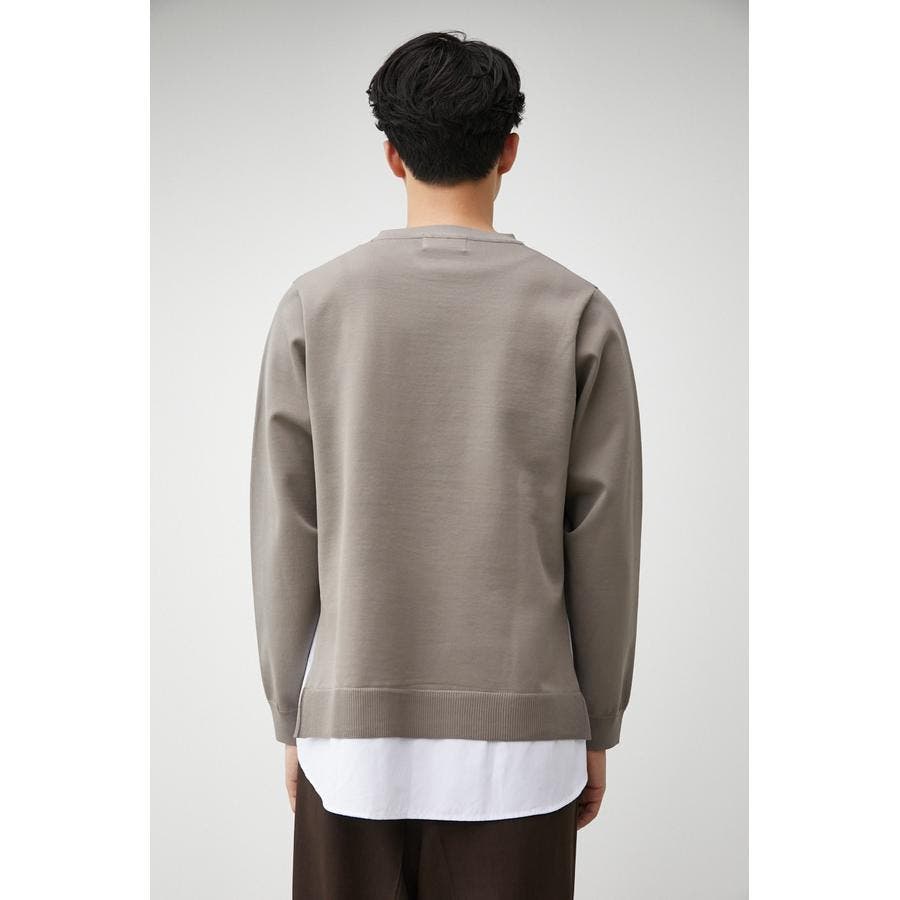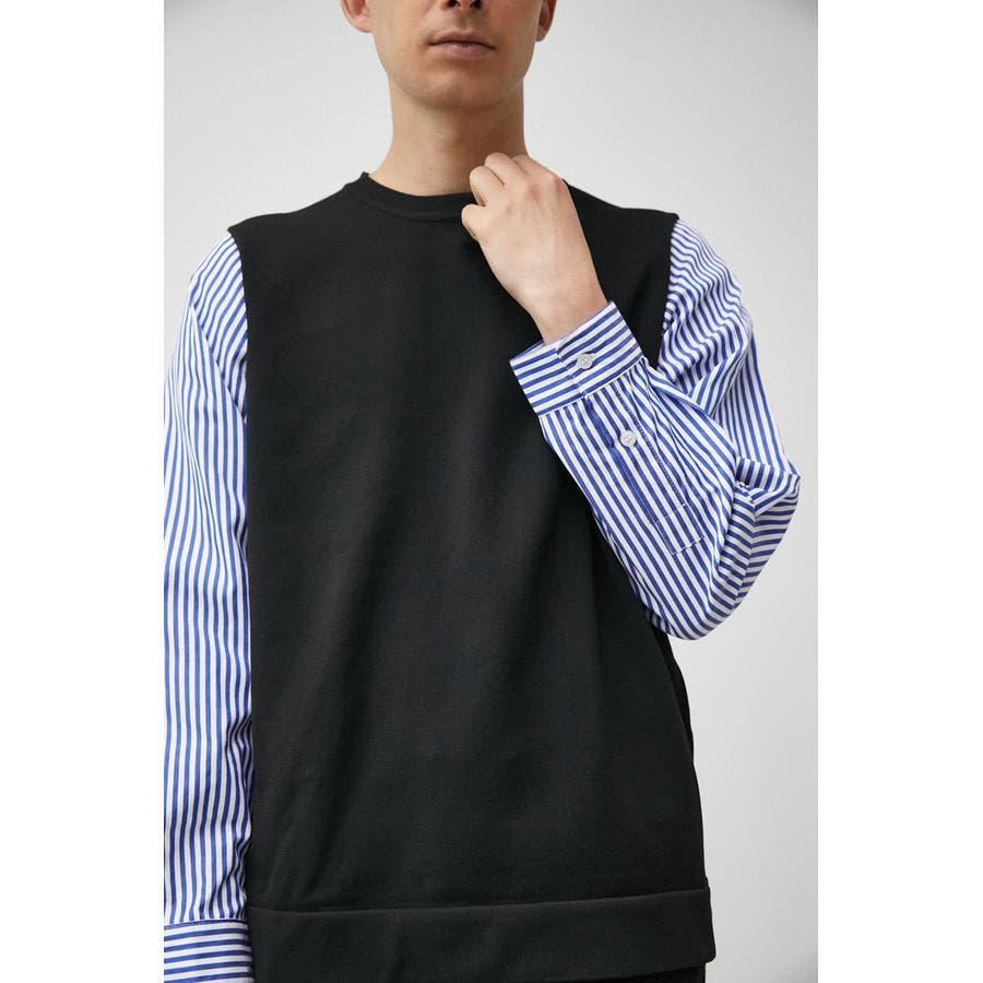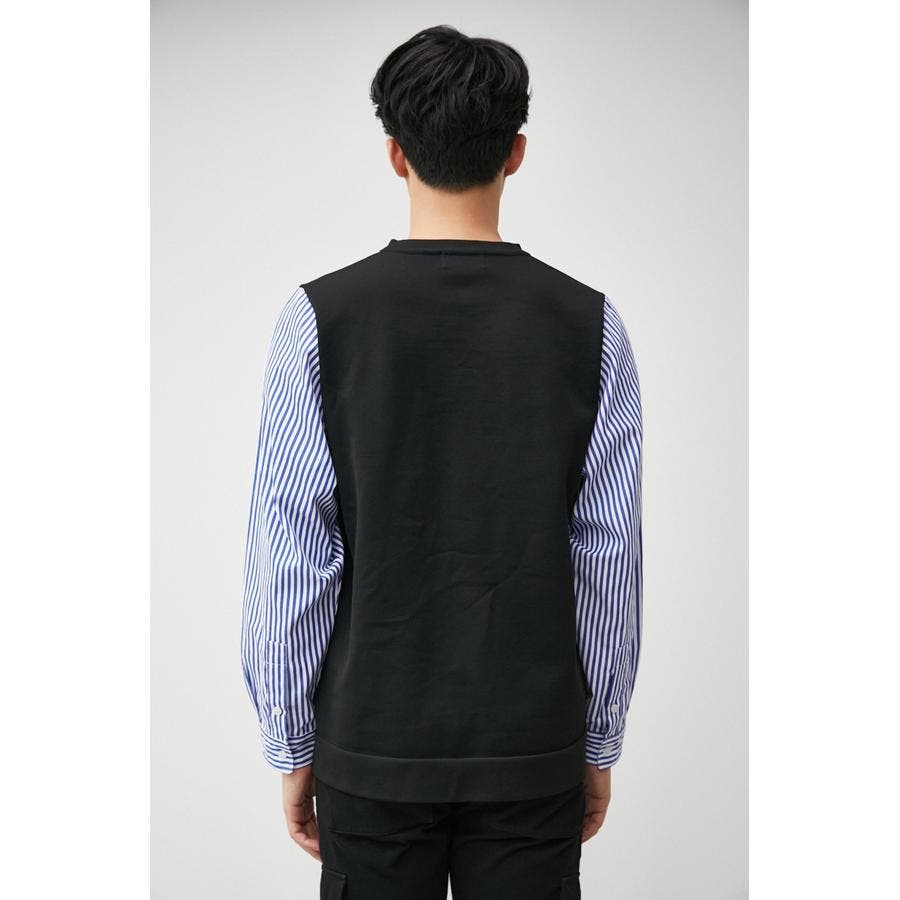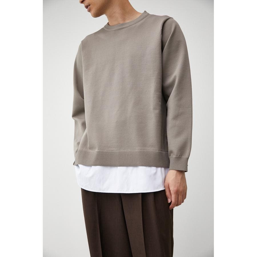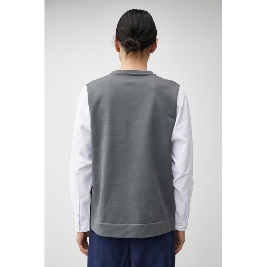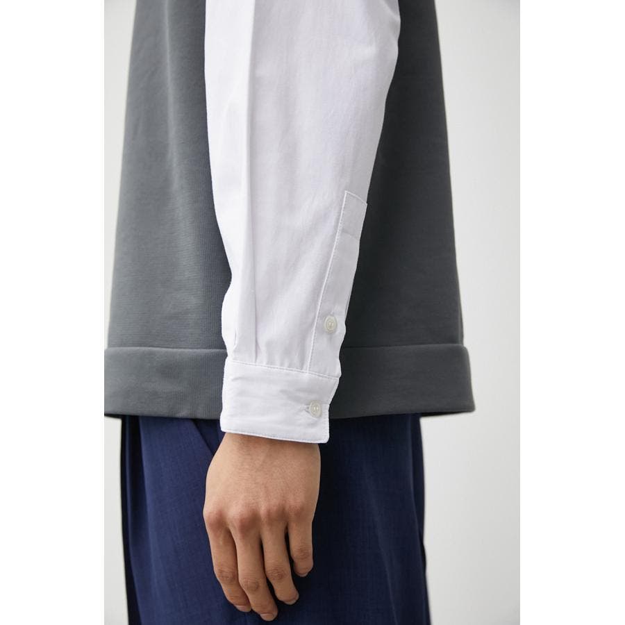 ・軽さと独特な風合いが特徴のポリエステルの糸で身頃を編み、袖、裾部分は布帛シャツ地をドッキングしています。