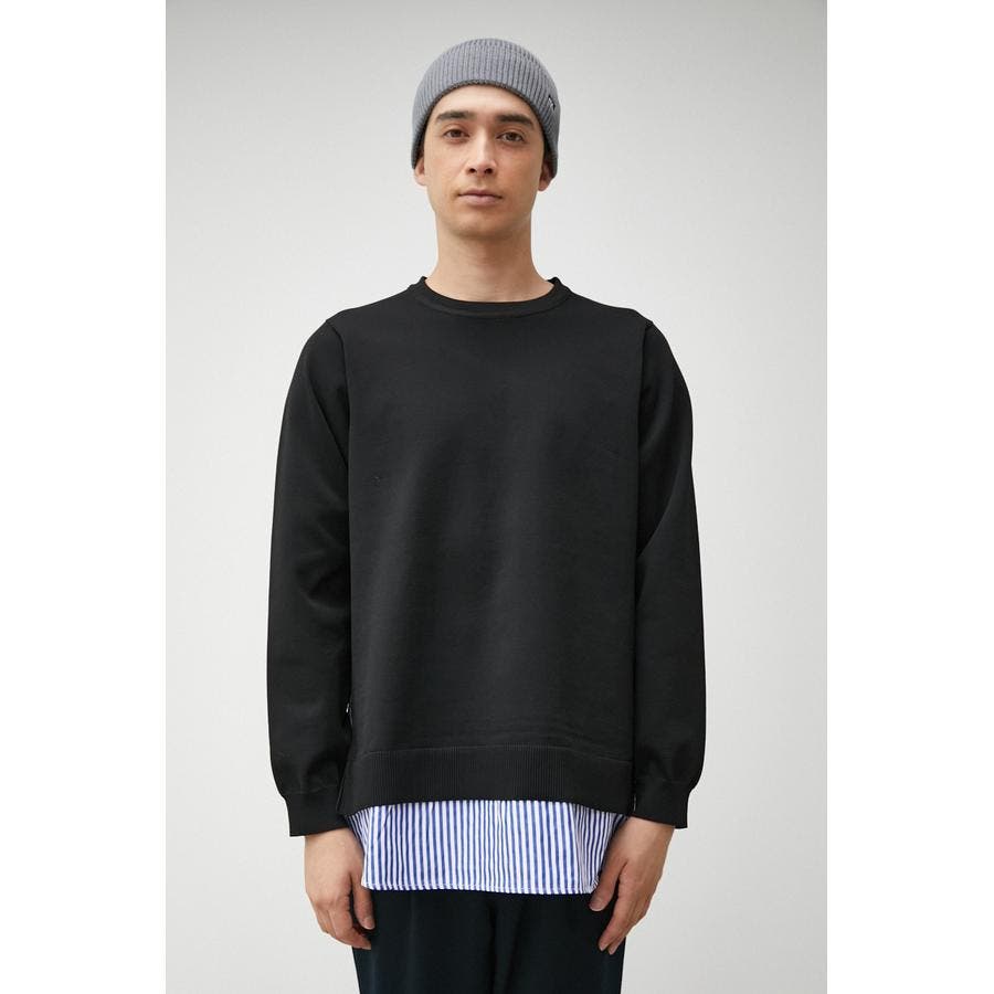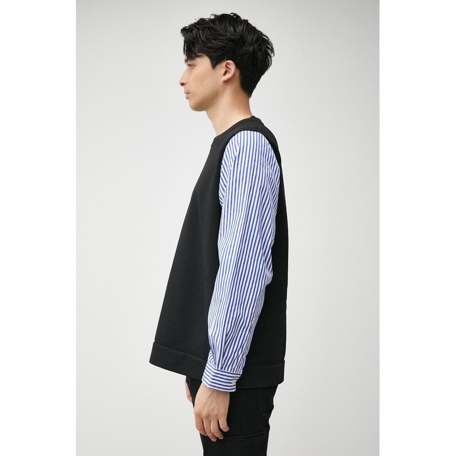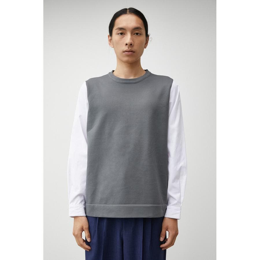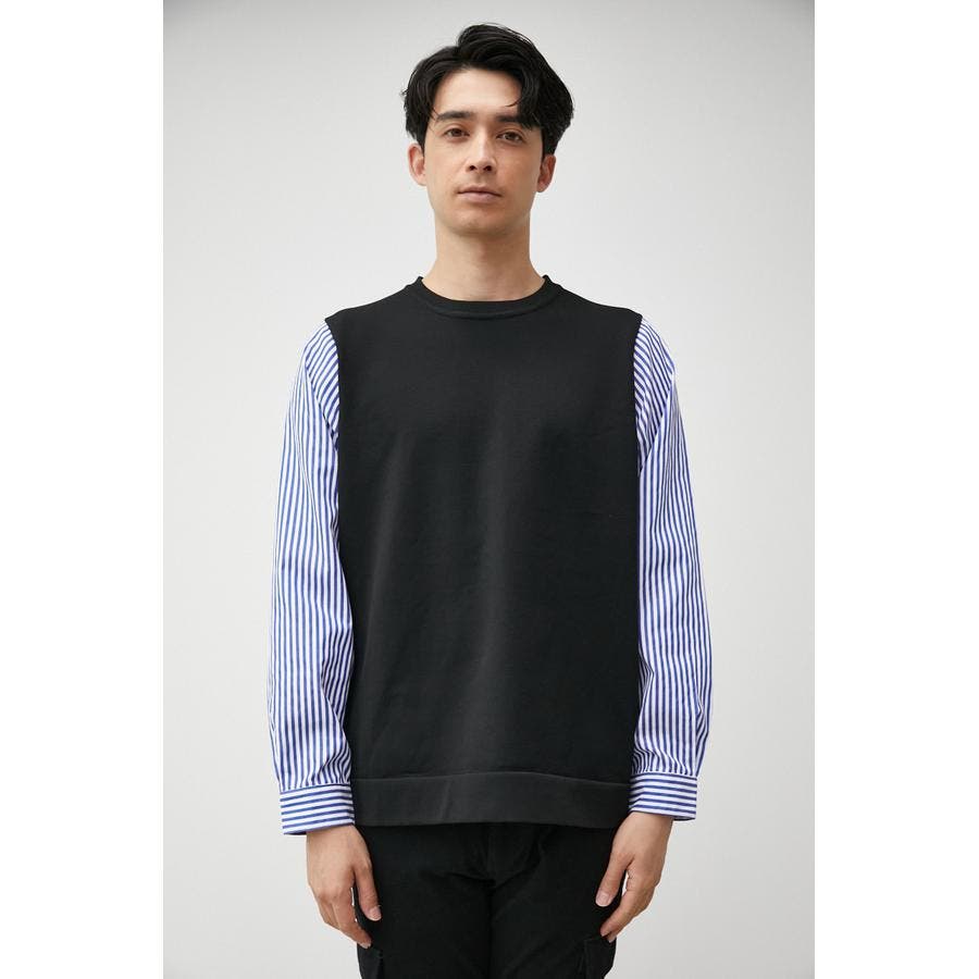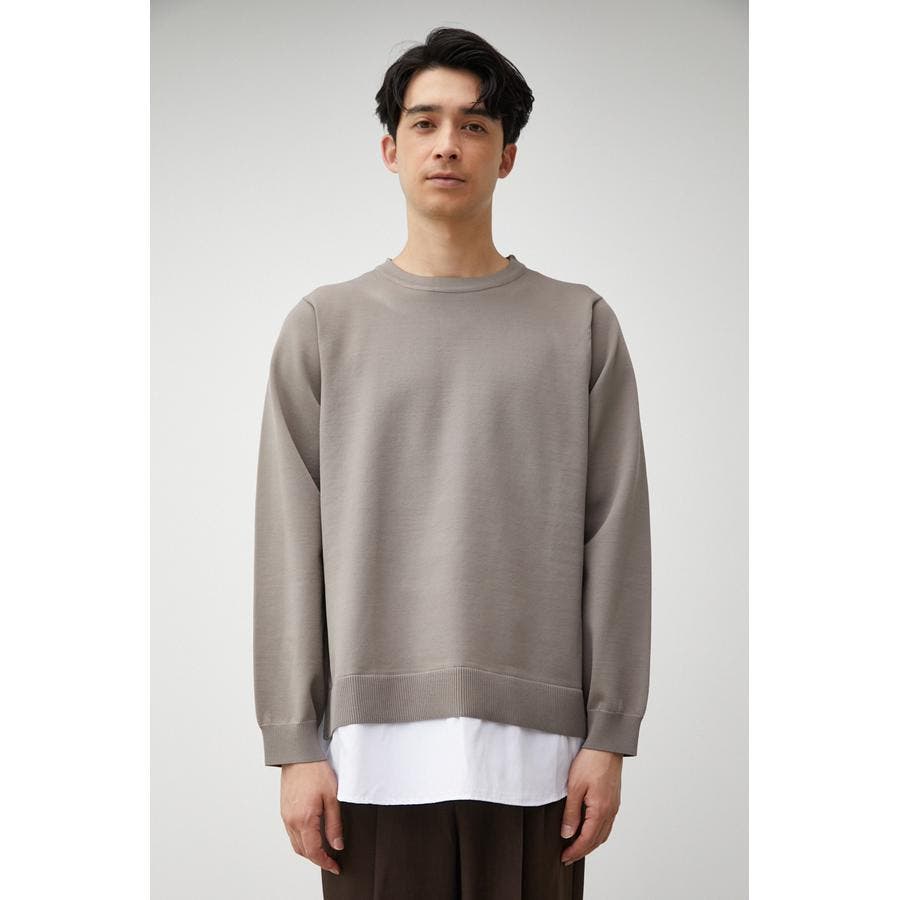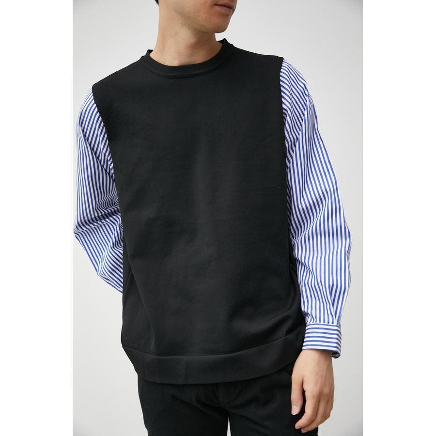 ・軽さと独特な風合いが特徴のポリエステルの糸で身頃を編み、袖、裾部分は布帛シャツ地をドッキングしています。
