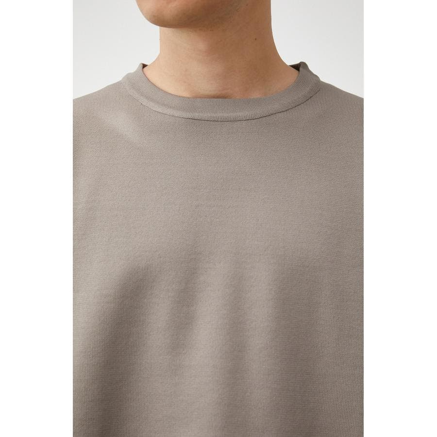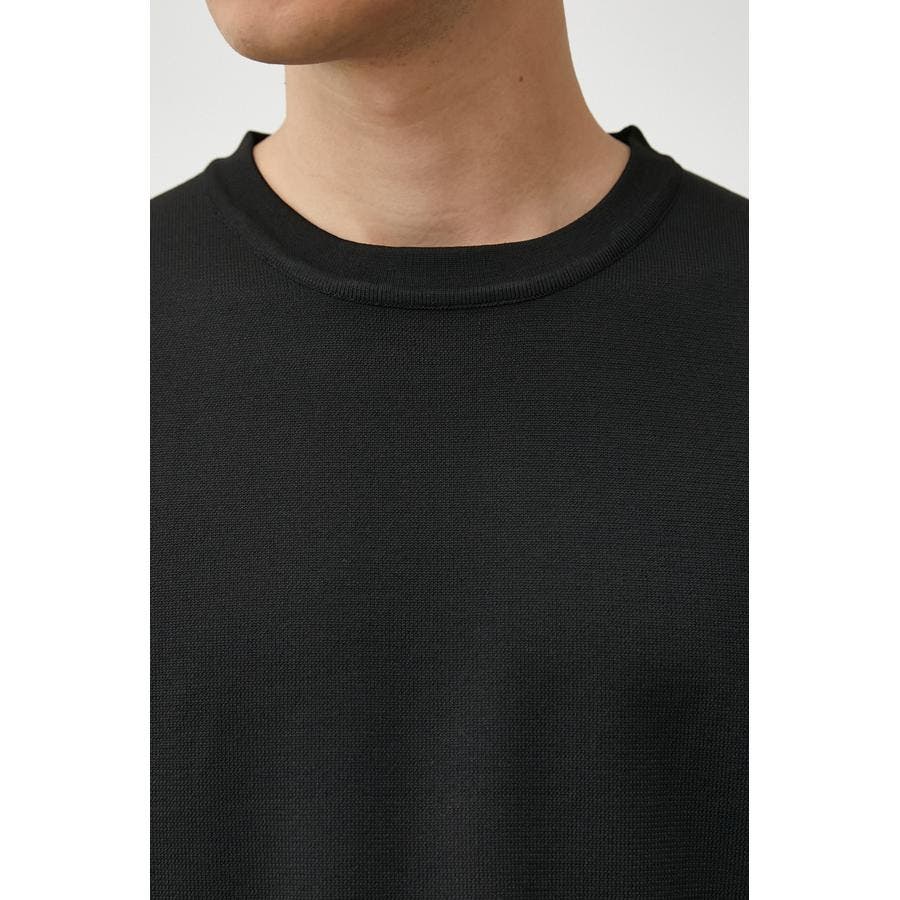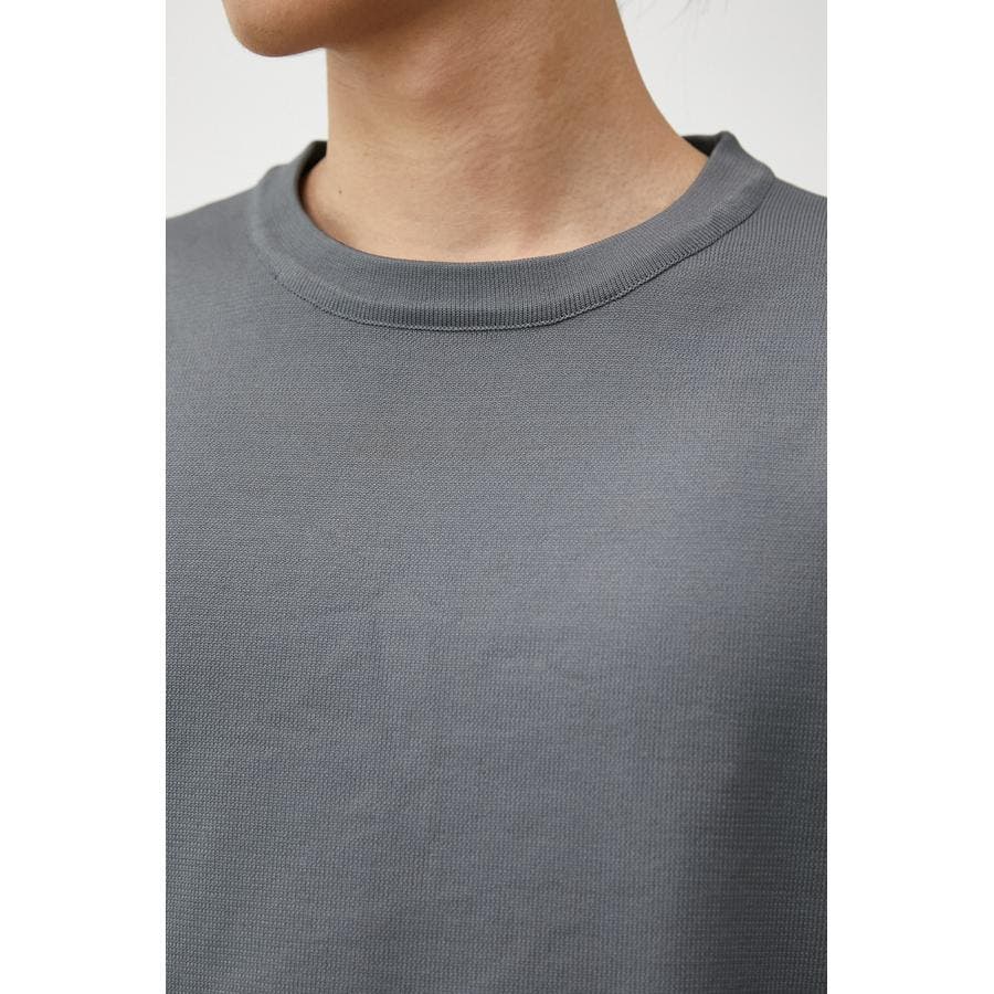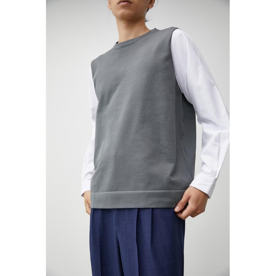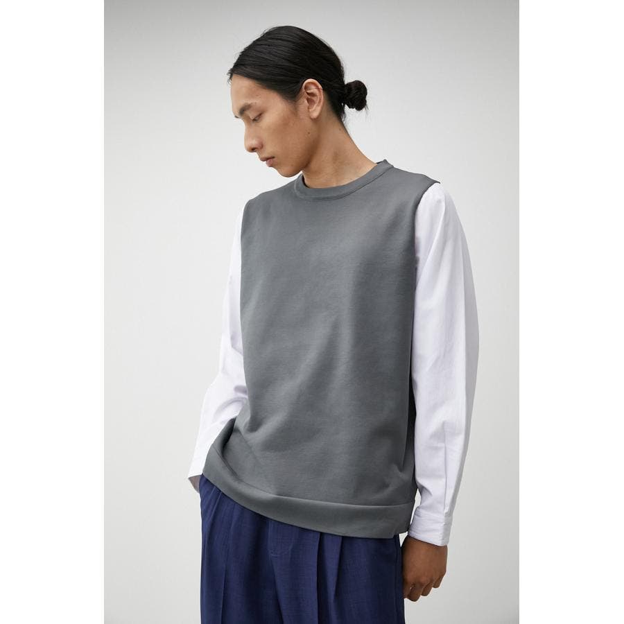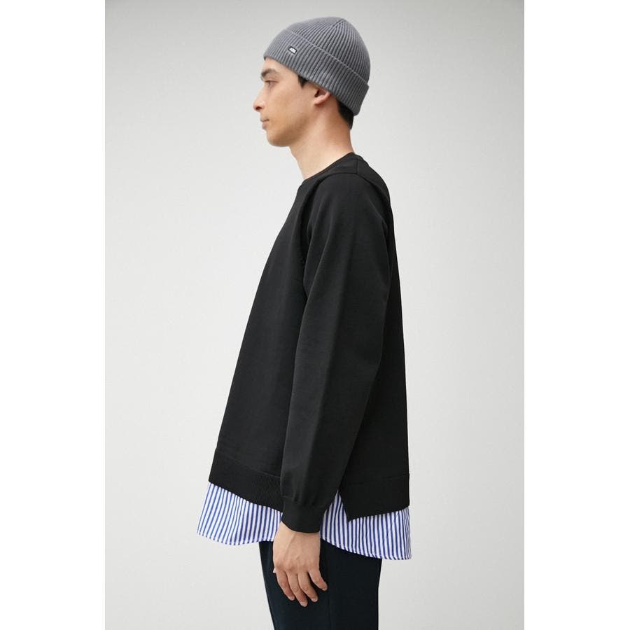 ・軽さと独特な風合いが特徴のポリエステルの糸で身頃を編み、袖、裾部分は布帛シャツ地をドッキングしています。