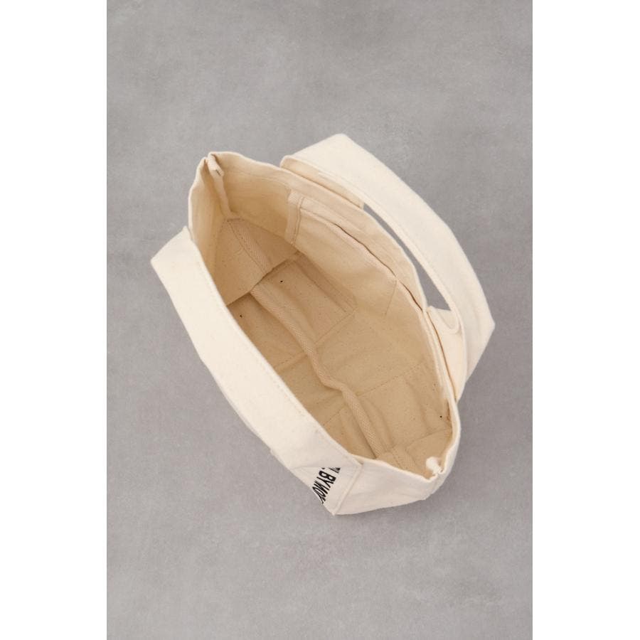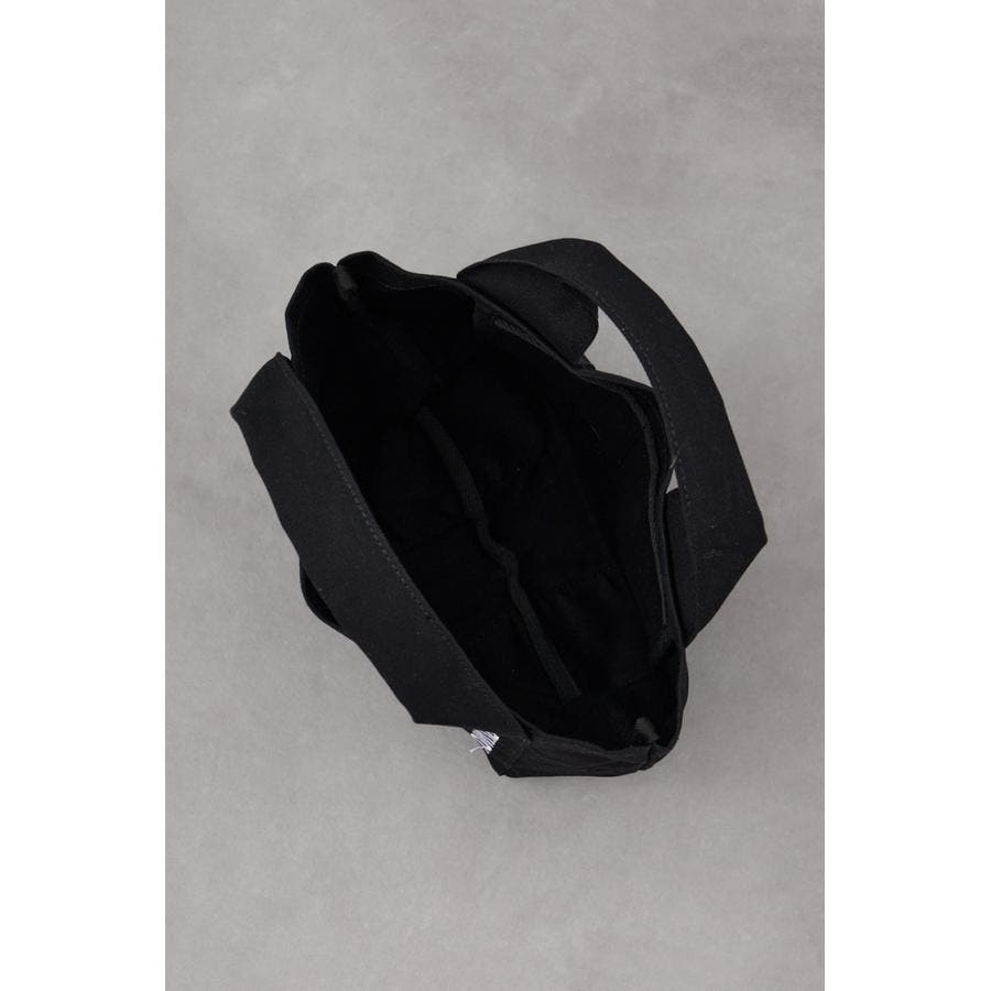 前面、裏面にロゴ刺繍が縦に入っているミニトートになります。
