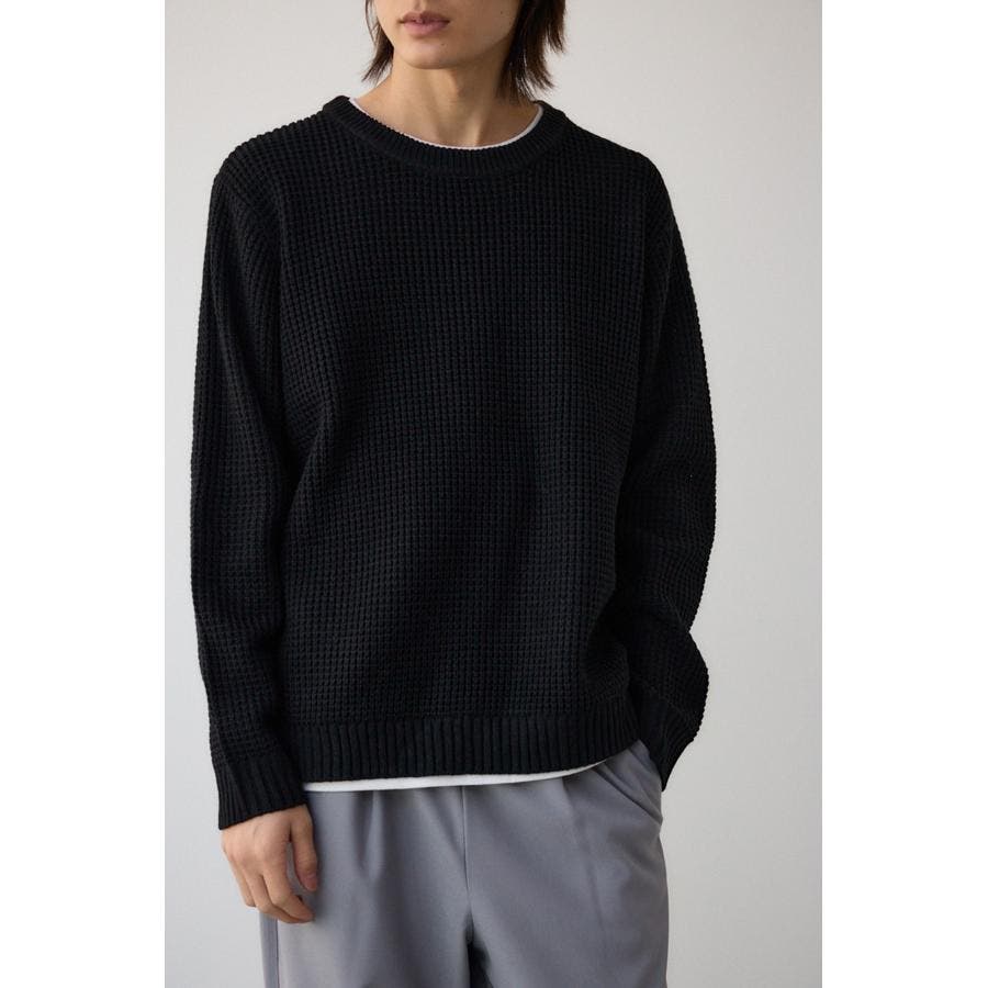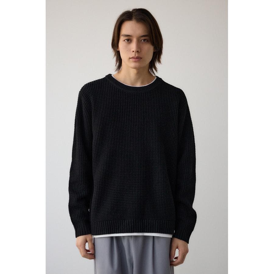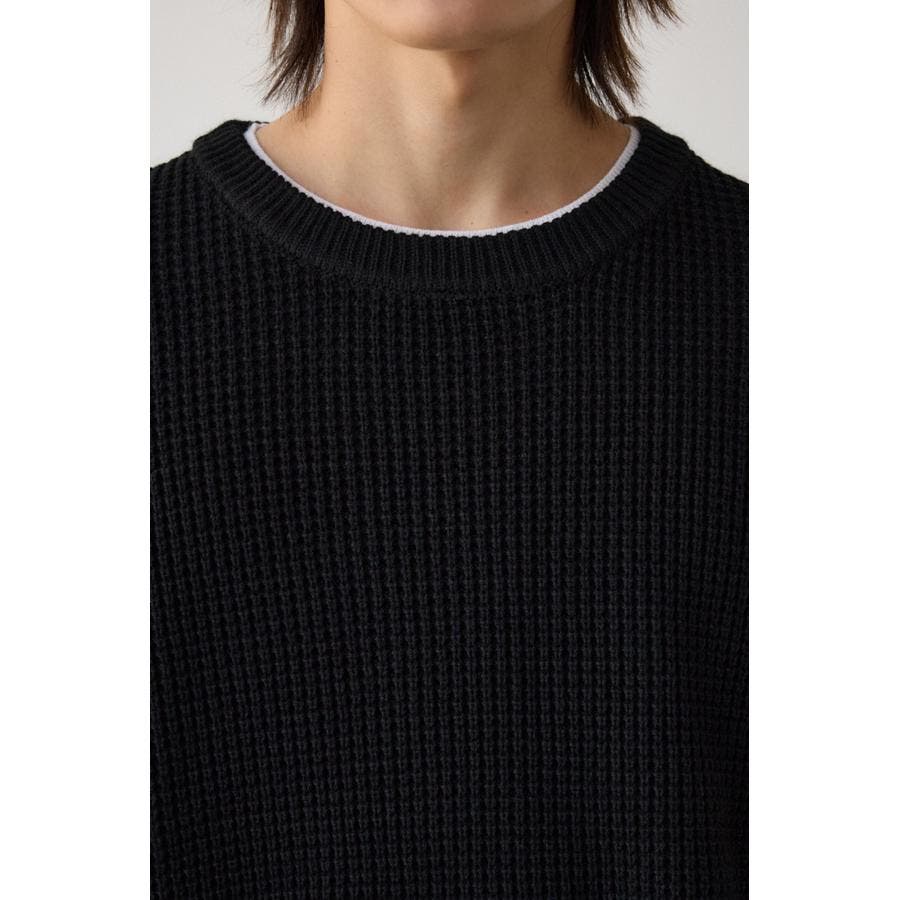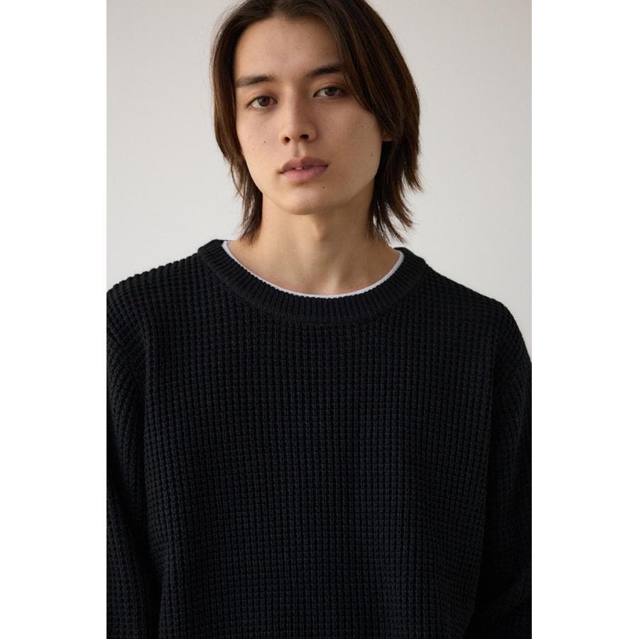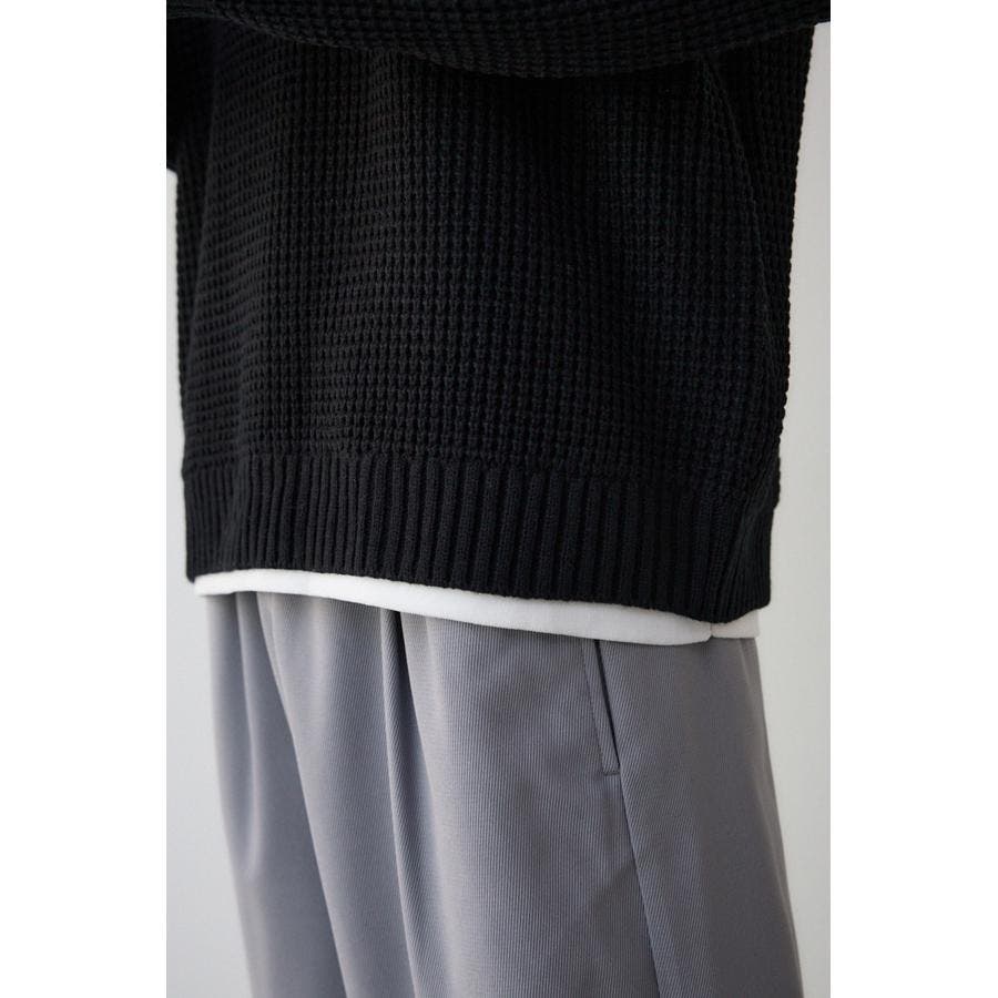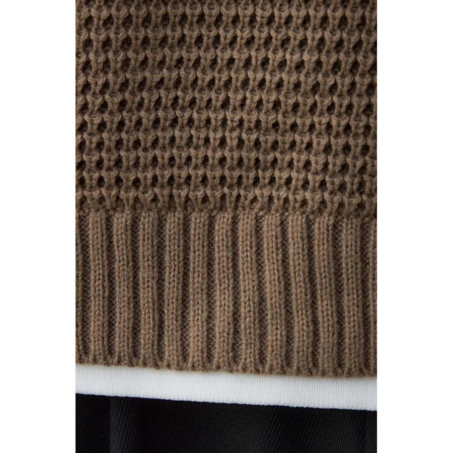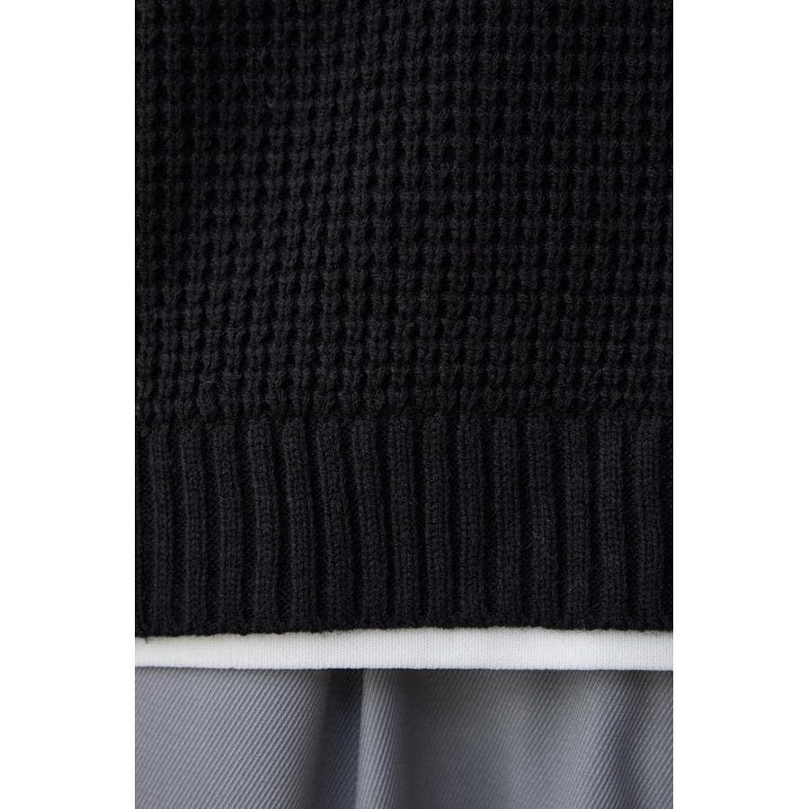 ワッフル編みニットにカットソー生地のフェイクレイヤードで1着でオシャレに着こなせます。