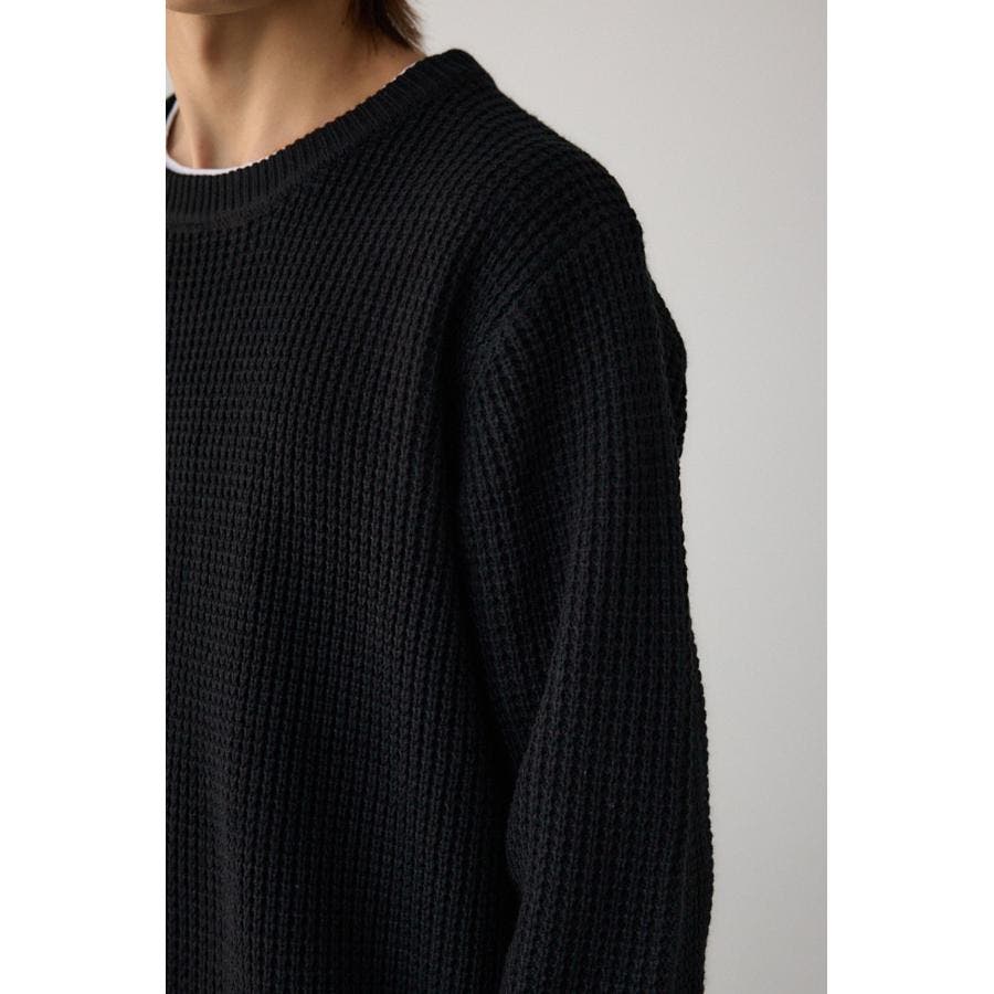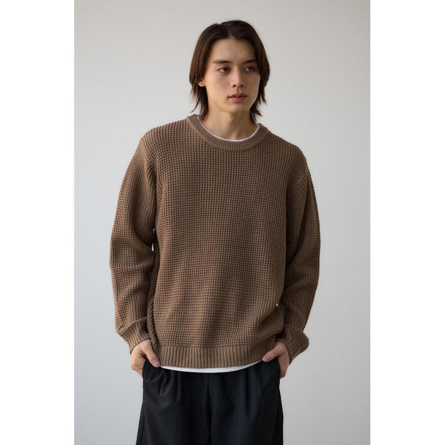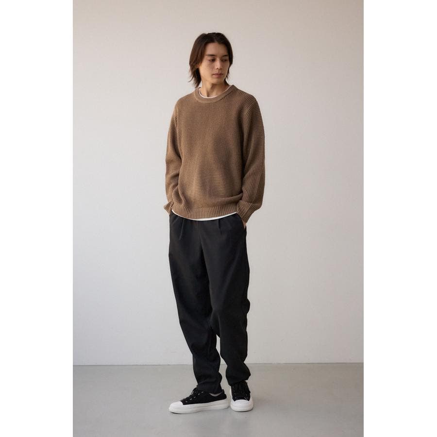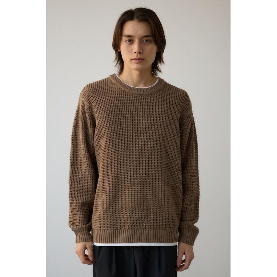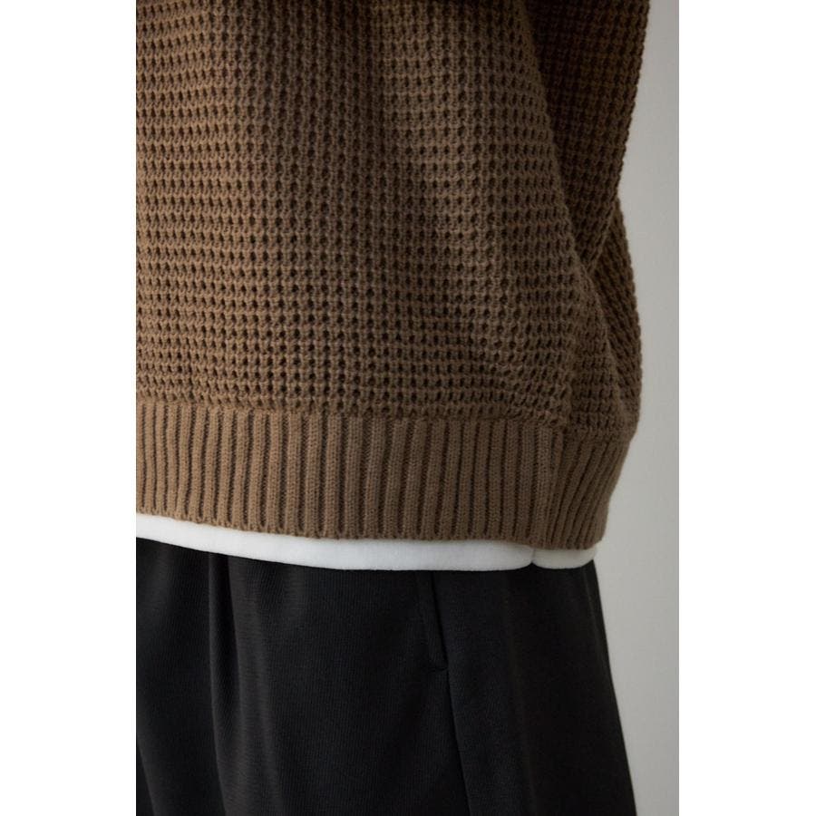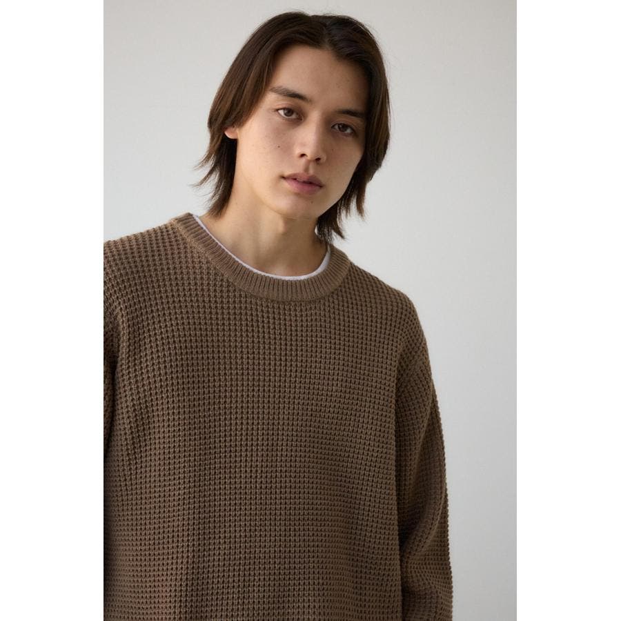 ワッフル編みニットにカットソー生地のフェイクレイヤードで1着でオシャレに着こなせます。