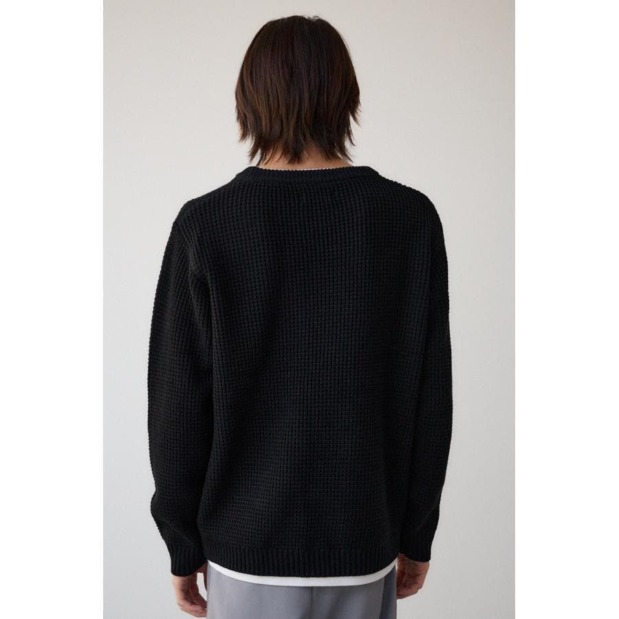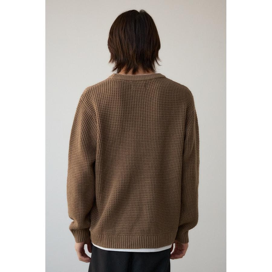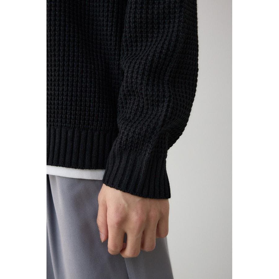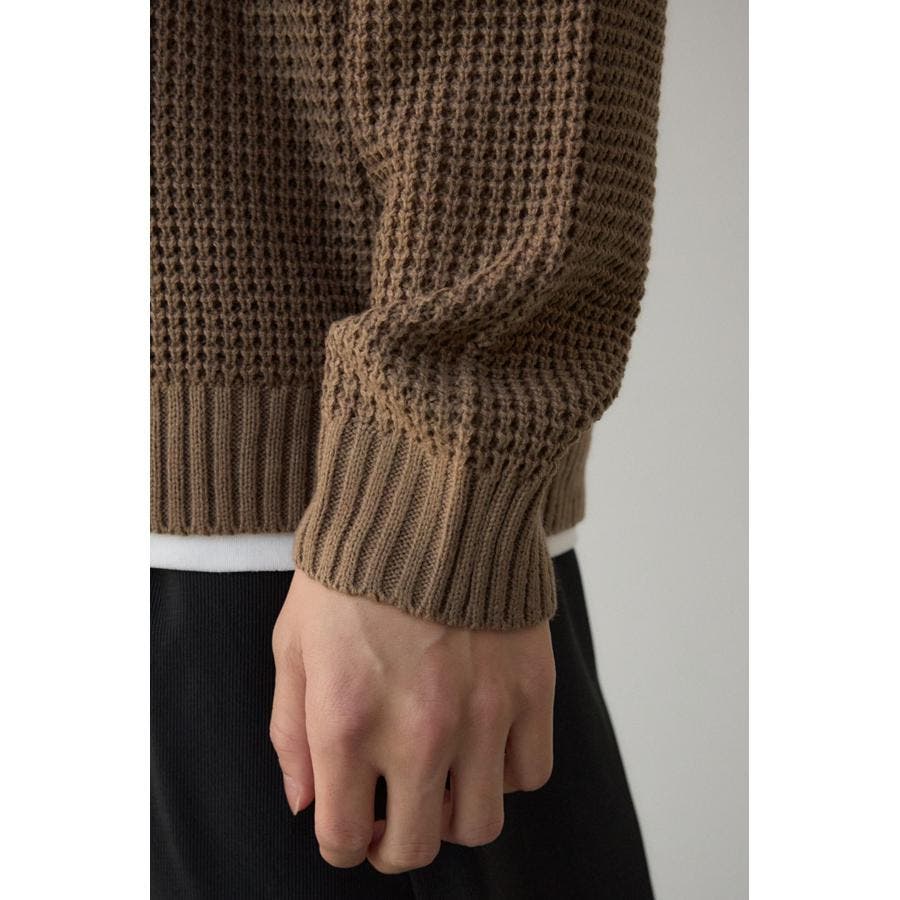 ワッフル編みのデザインで、本数取り適正の7GGではめ込み、しっかりとした編地を表現しています。