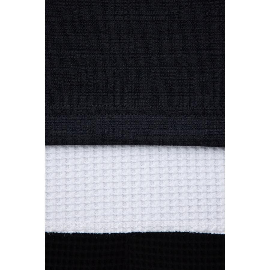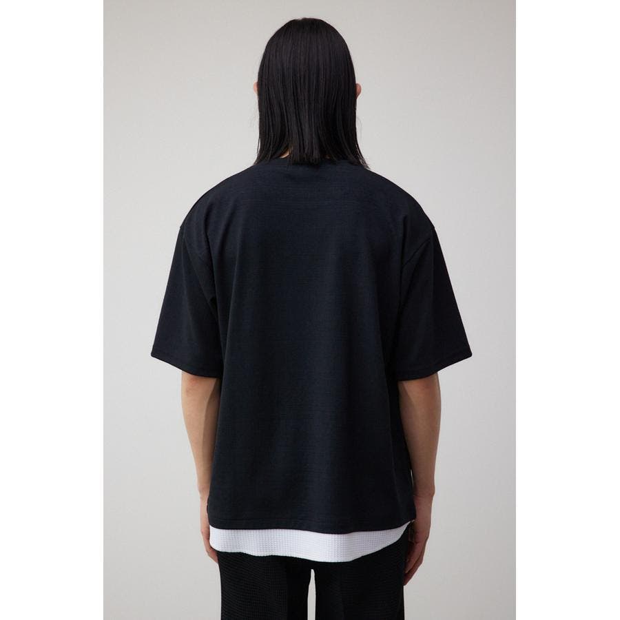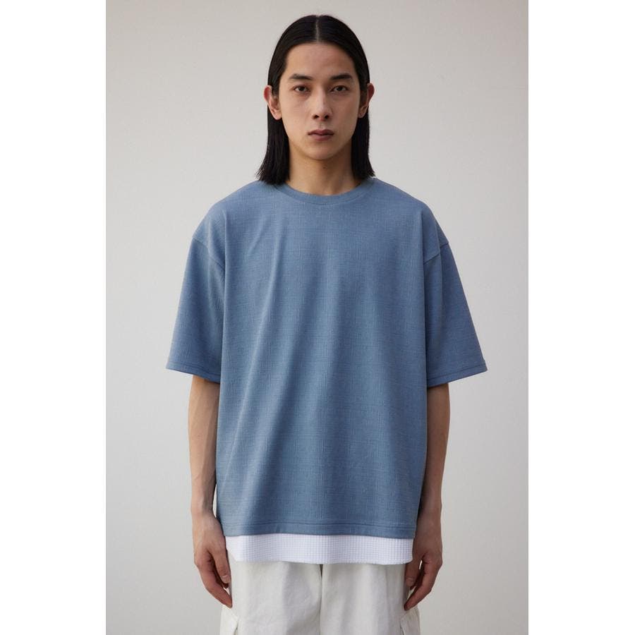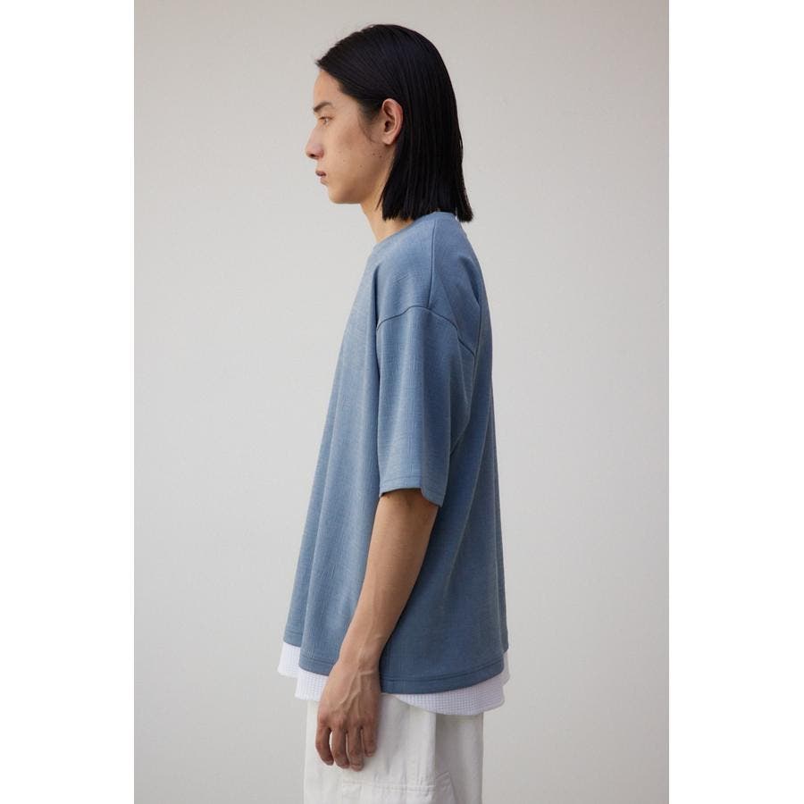 ・異素材ドッキングのフェイクレイヤードトップス。
