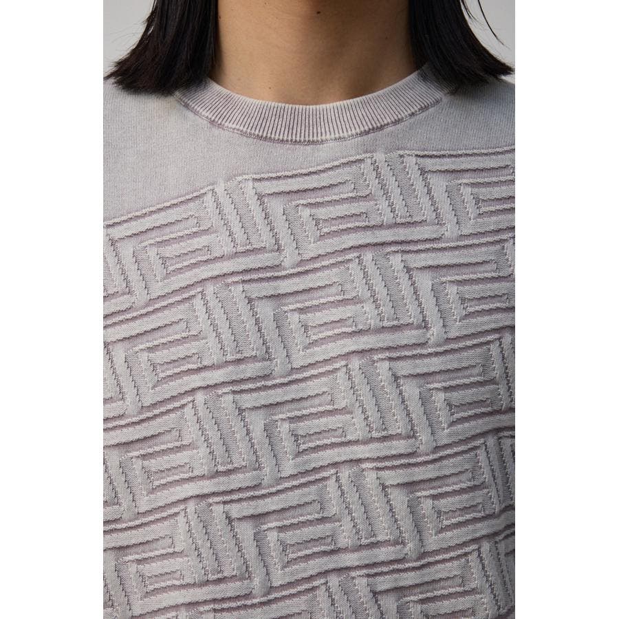 ・ジャガード柄編みの製品を特殊な染料で染めた後、ストーンウォッシュ加工をかけて色を落としています。