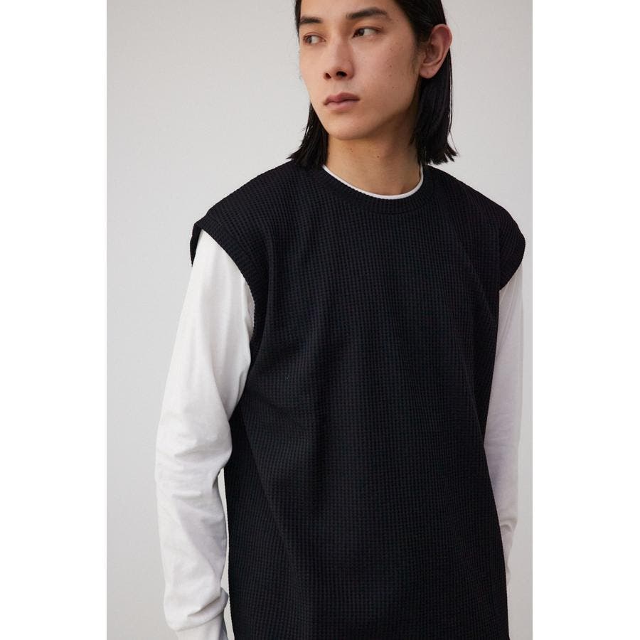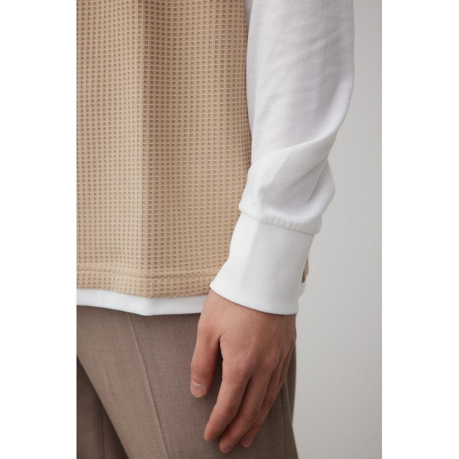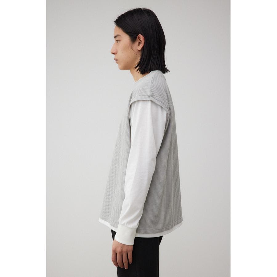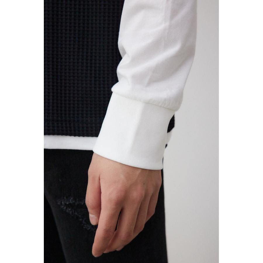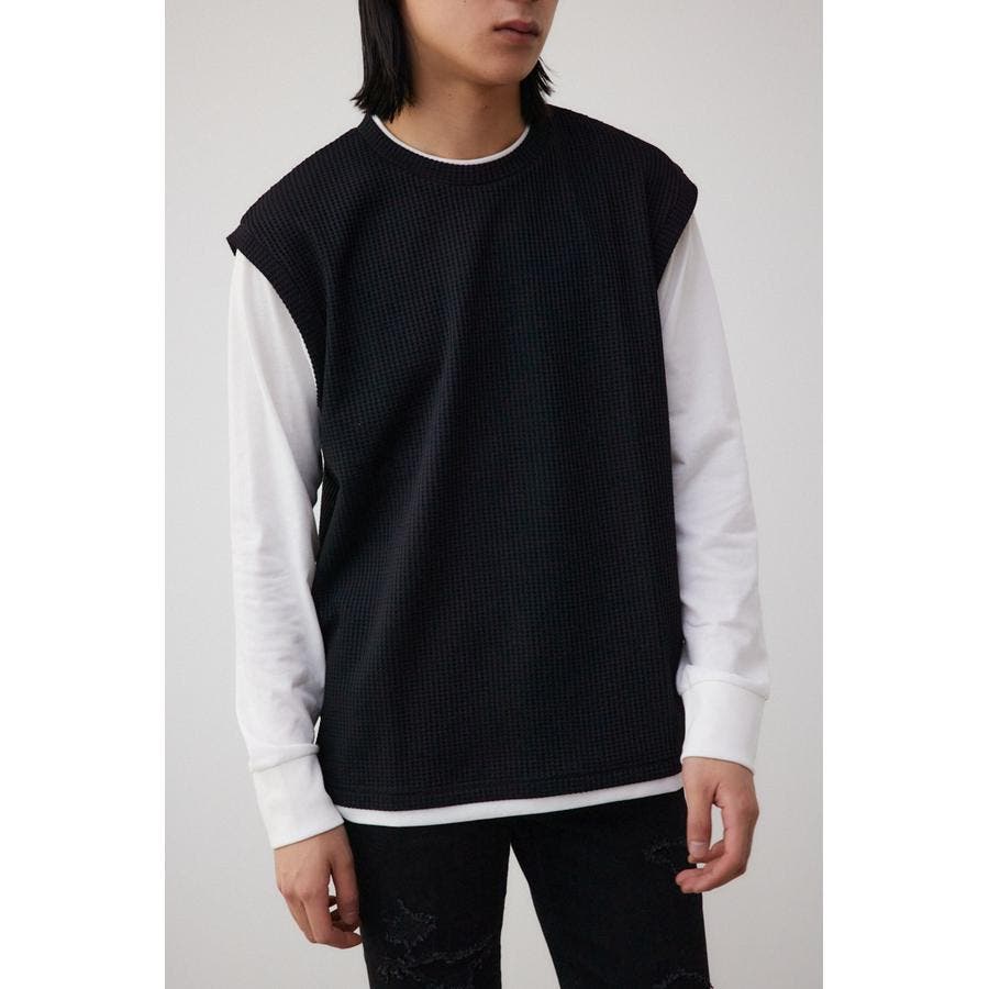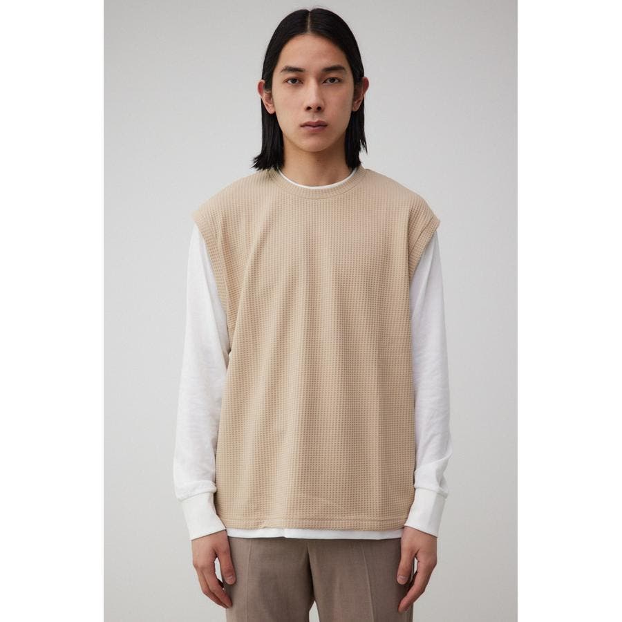 ・身頃のベストがワッフル生地で表面変化を楽しむことができ、袖から出るロンTがこなれ感を演出。